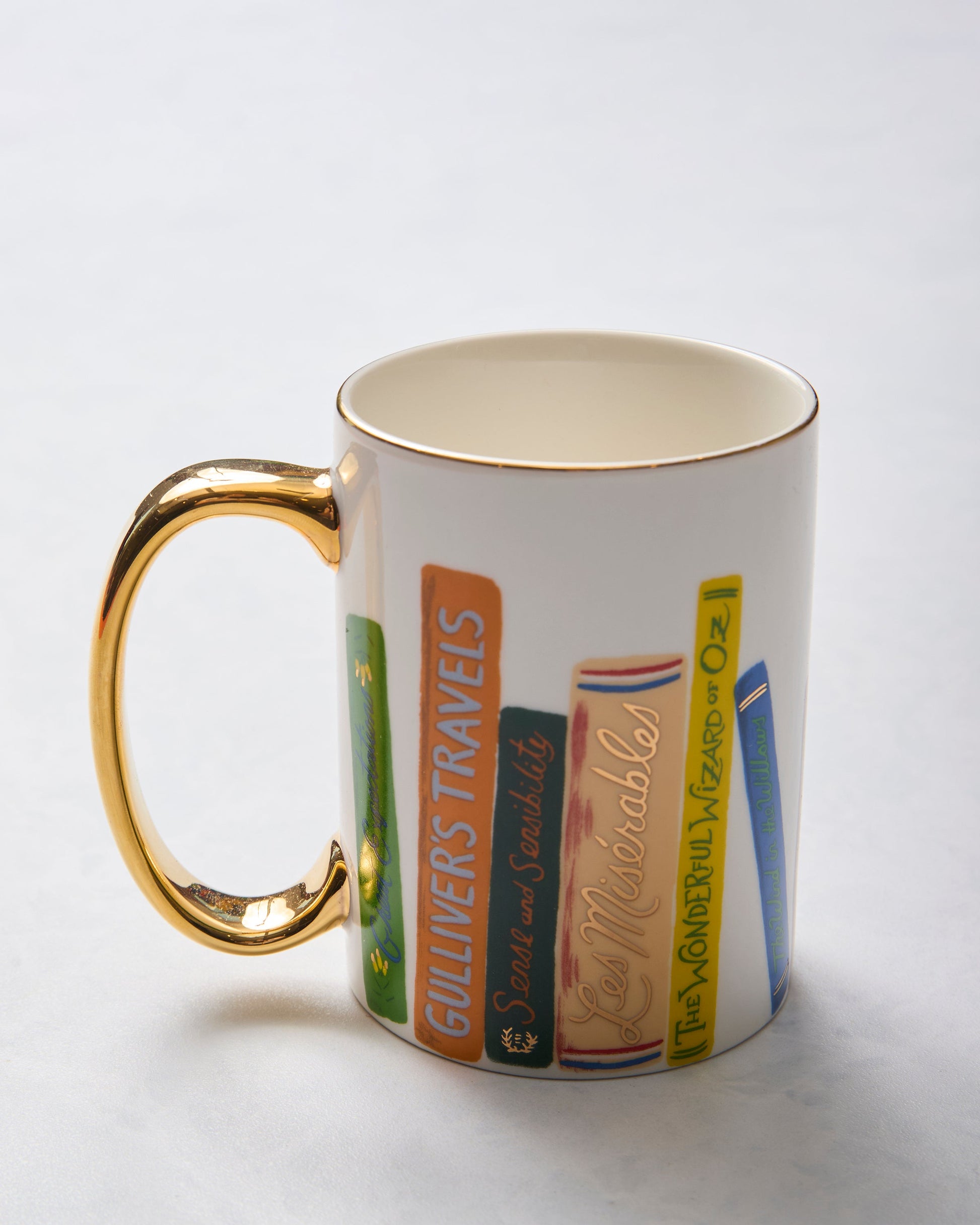 Settle in with a warm drink and a good book with the Book Club mug, featuring favorite classic titles. The porcelain mug features illustrated designs and a gilded rim and handle to add a little something special to your favorite beverage.