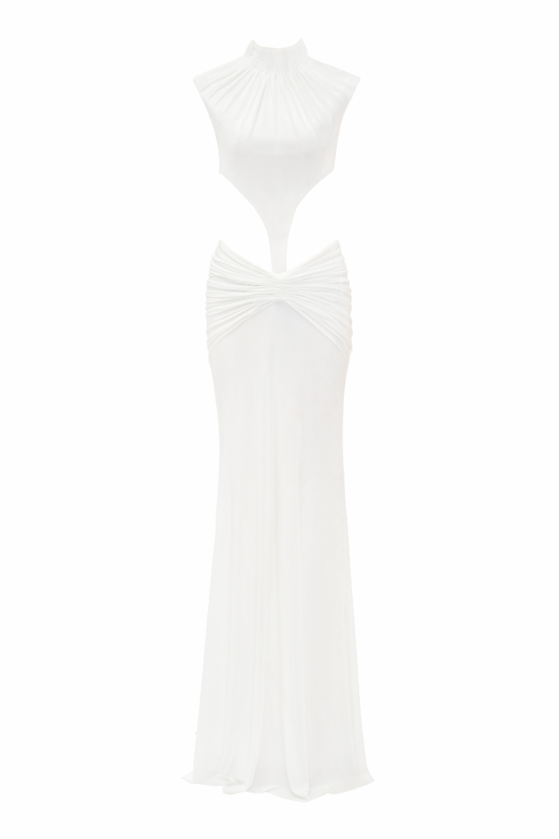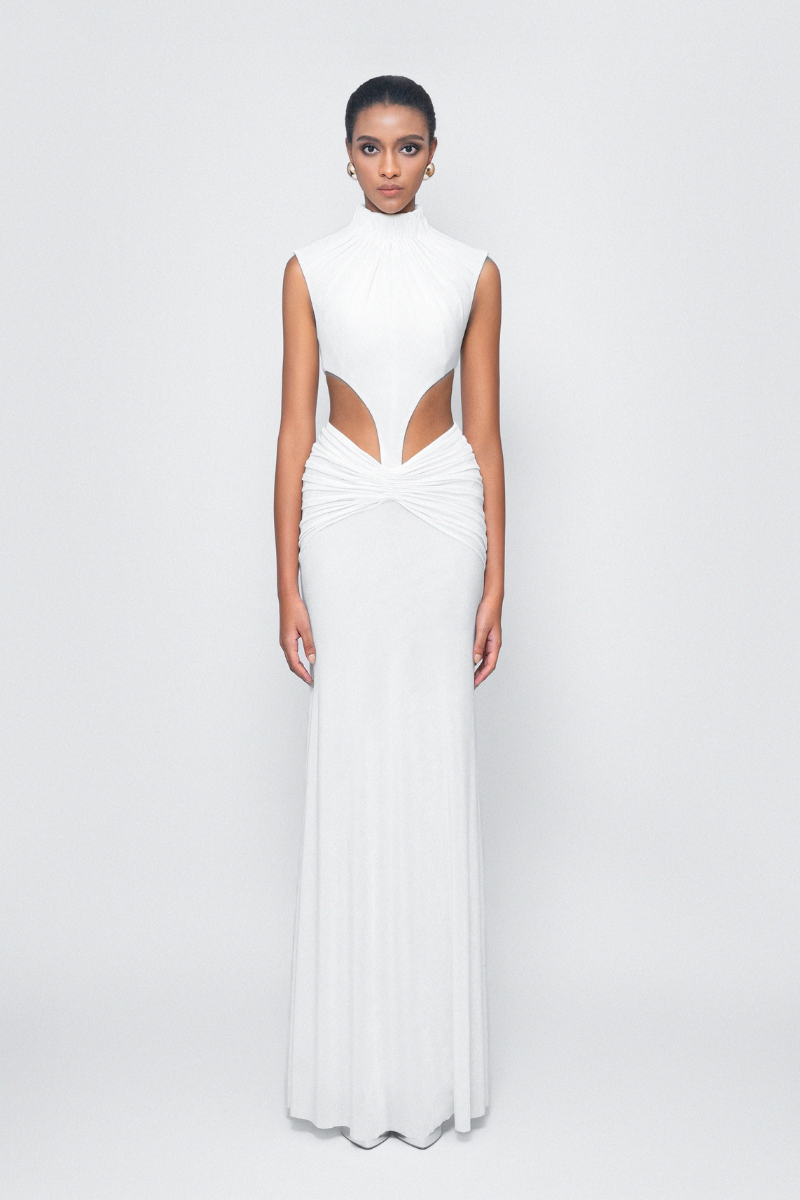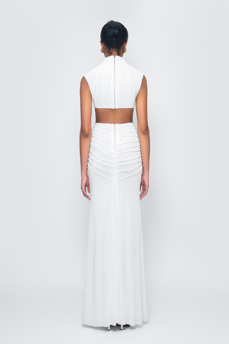 Inspired by the flow of water, the fabric is ‘sculpted’ on the body using micro-pleating techniques, shaping the pleats around the neckline and hips on a subtly shimmering knit fabric. The ensemble includes a cut-out bodysuit top and a unique side-seam skirt.