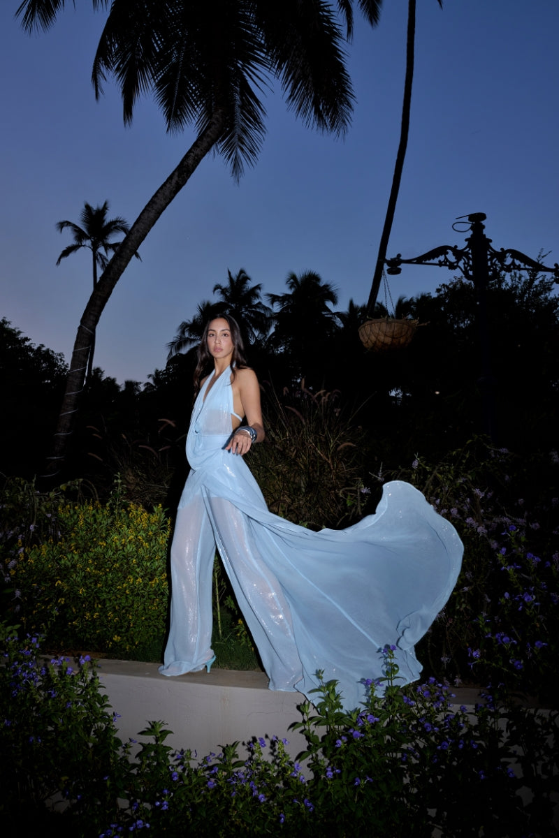 This baby blue sequinned top features a fluid hem, long panel, and asymmetrical hem, paired with sequin flared pants and a Malai bikini for a stunning look.