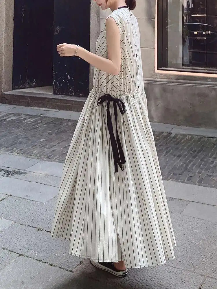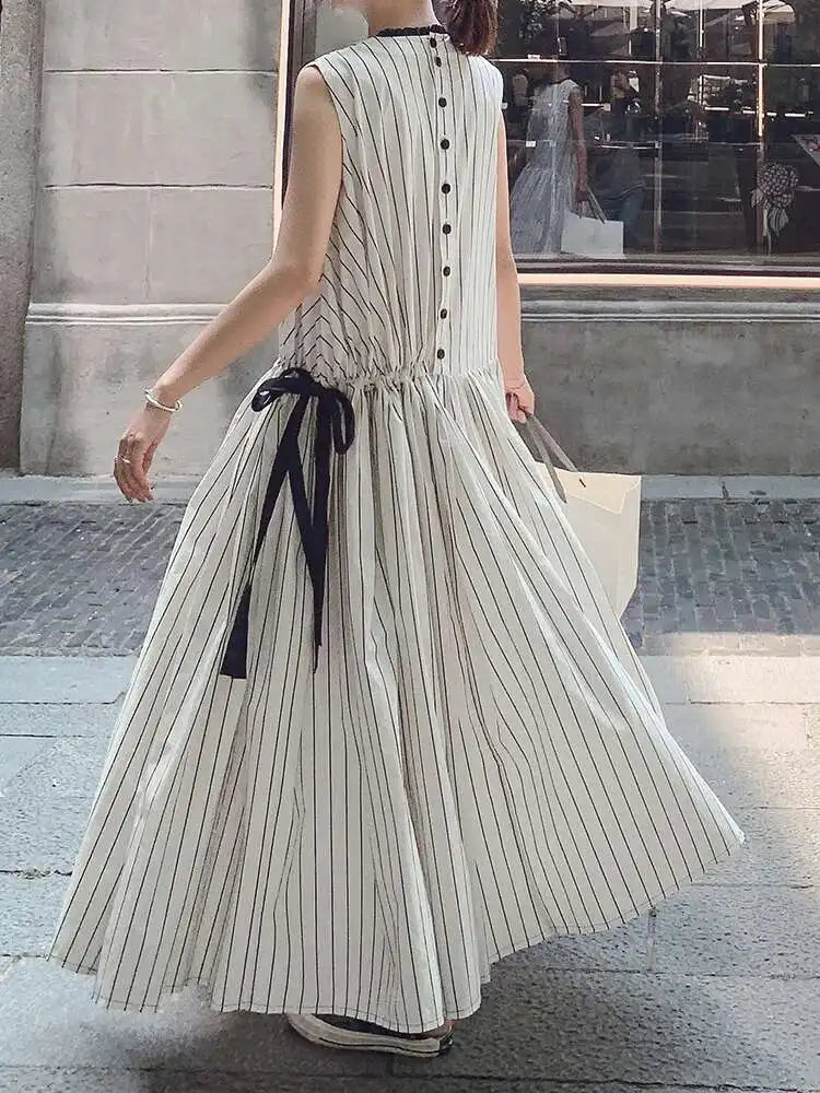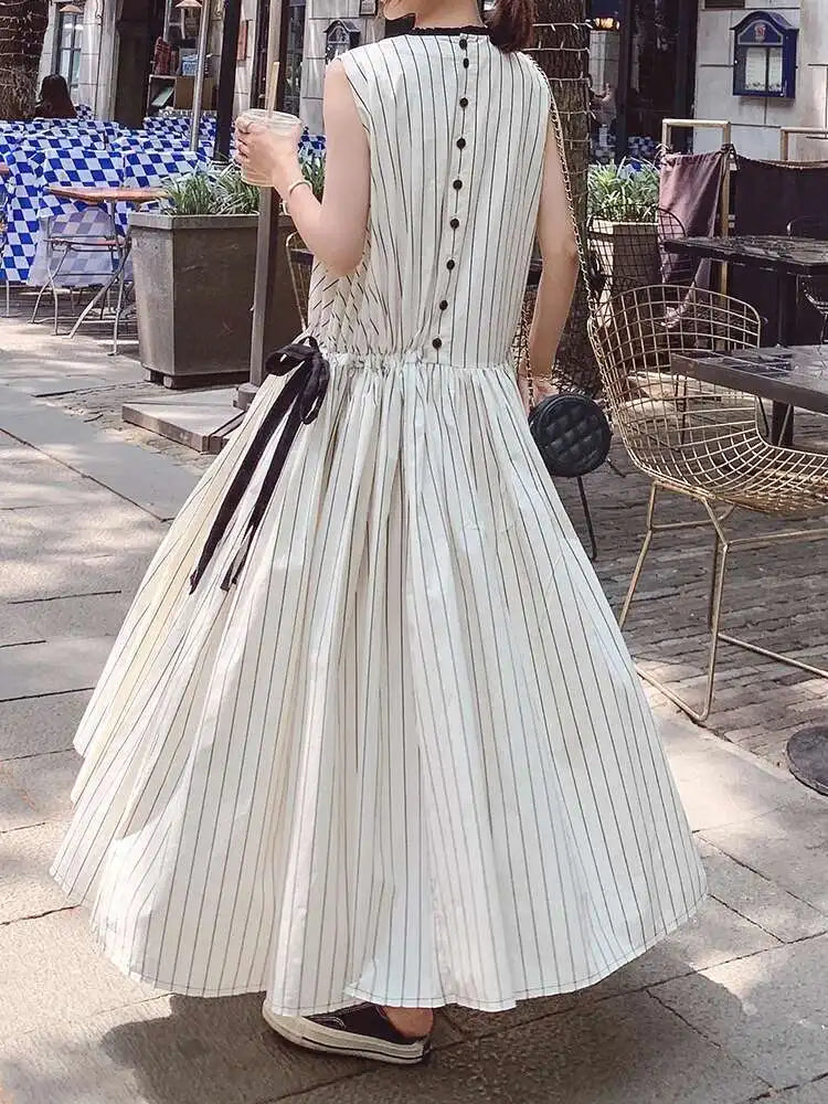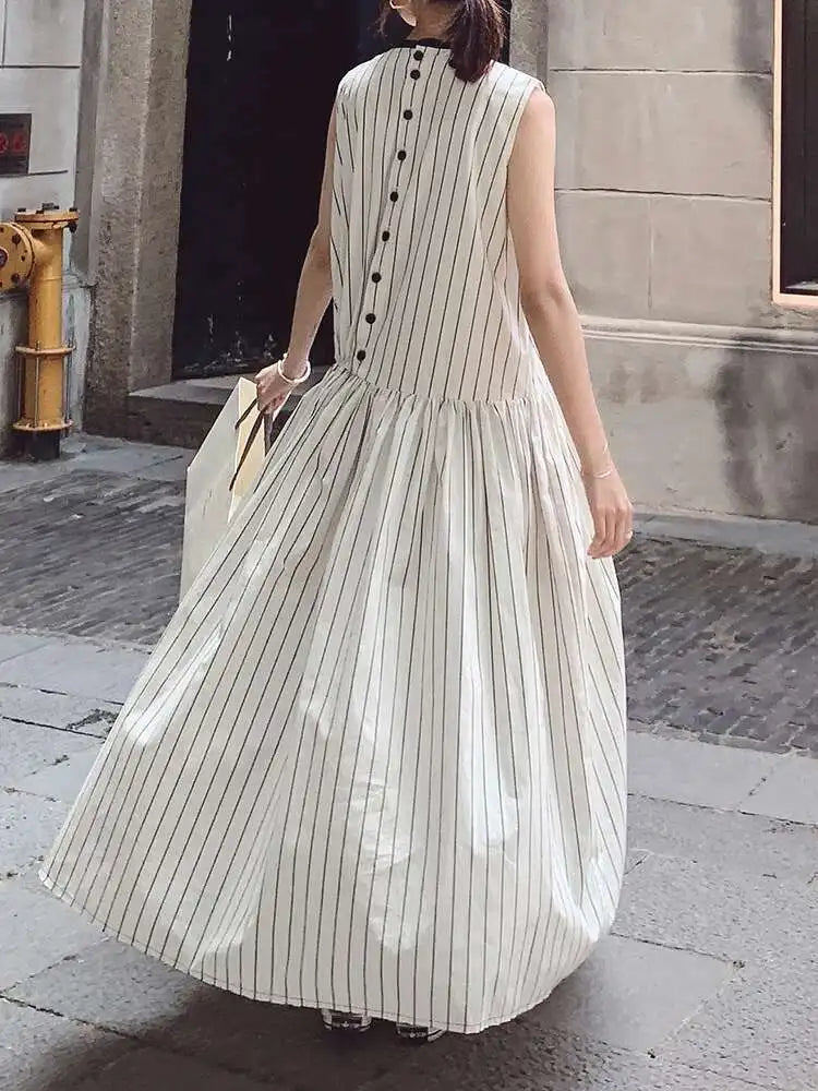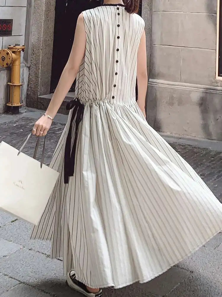 Cotton Sleeveless Striped Dress with Button Back