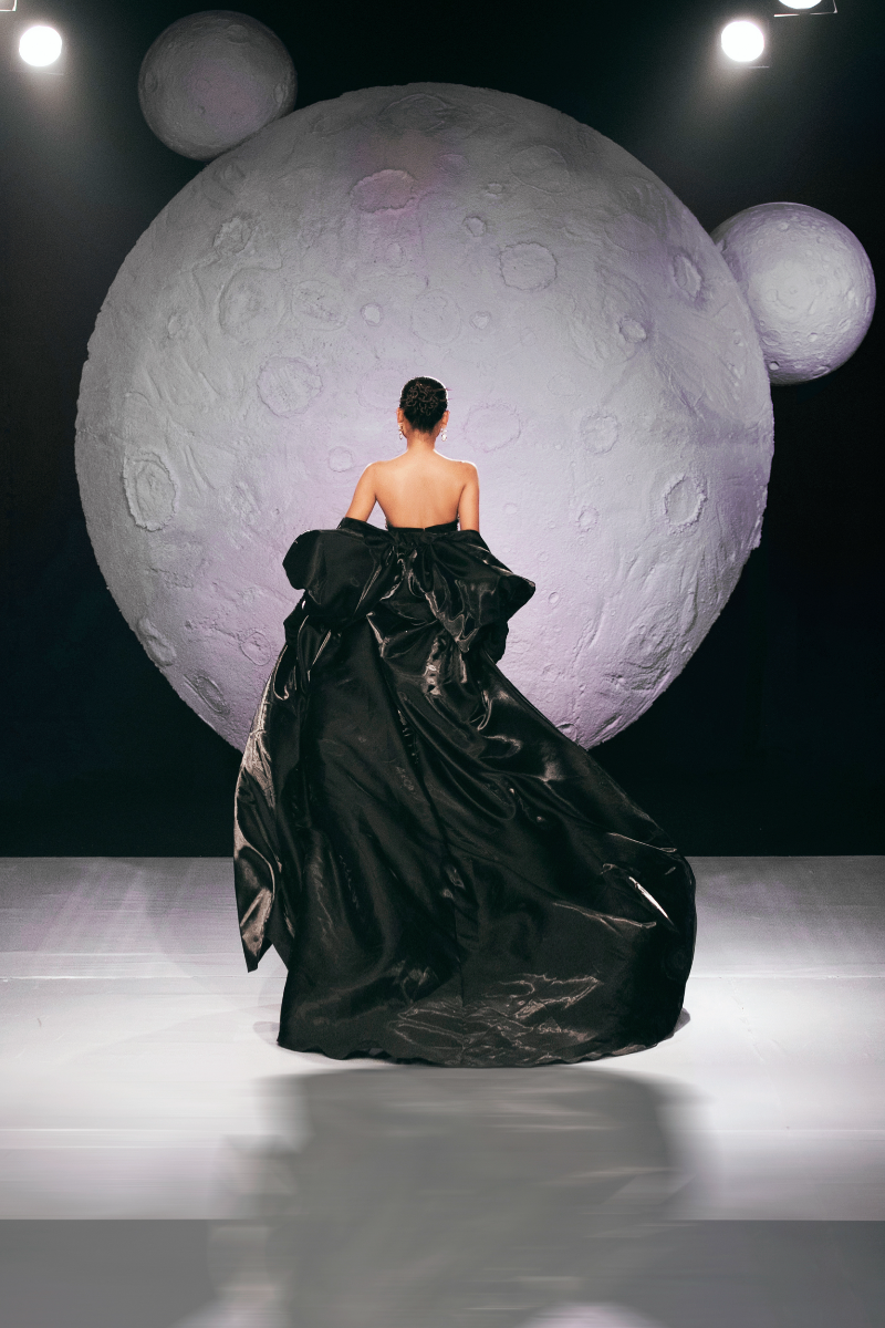 This mini bandeau dress features a zipper and rhinestone details, along with a luxurious taffeta organza cape with a long tail. Handmade in Vietnam.