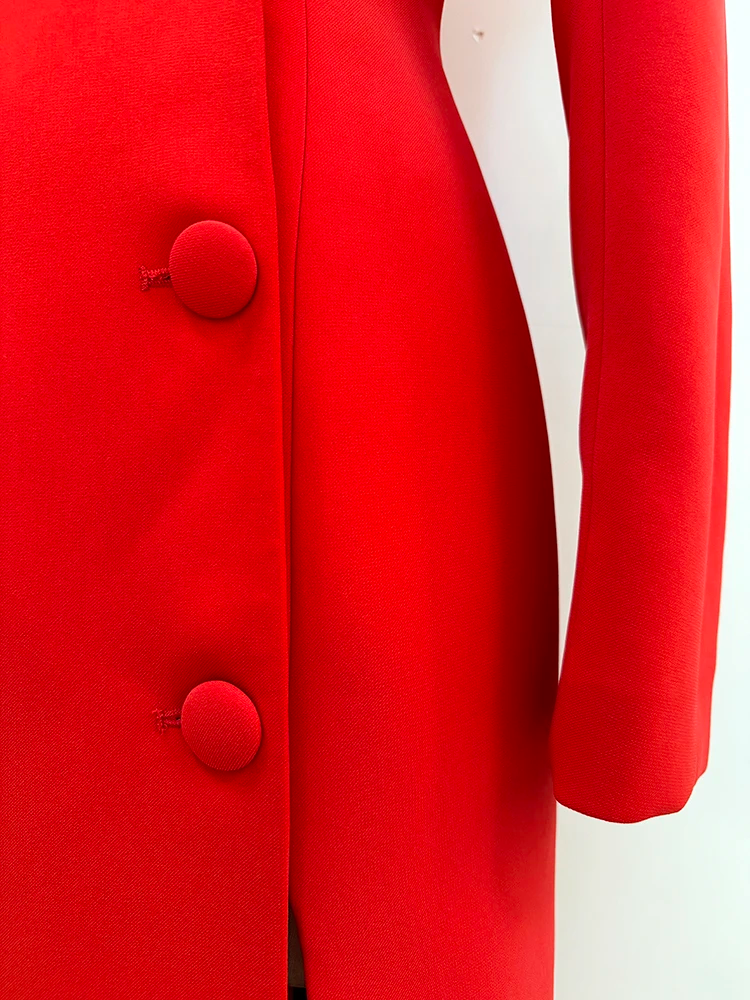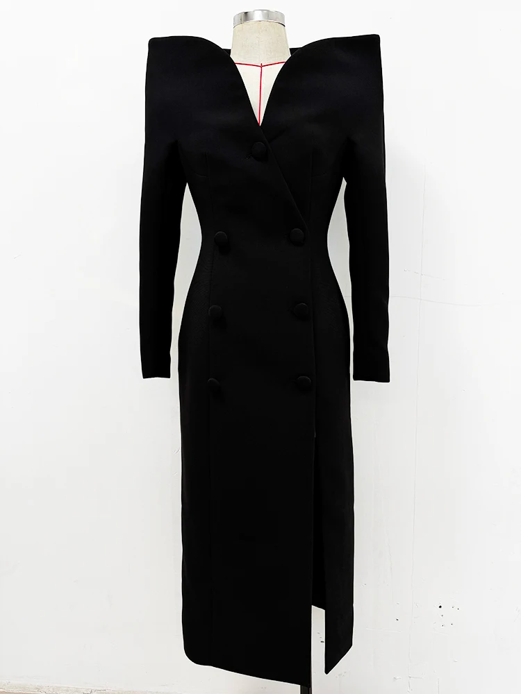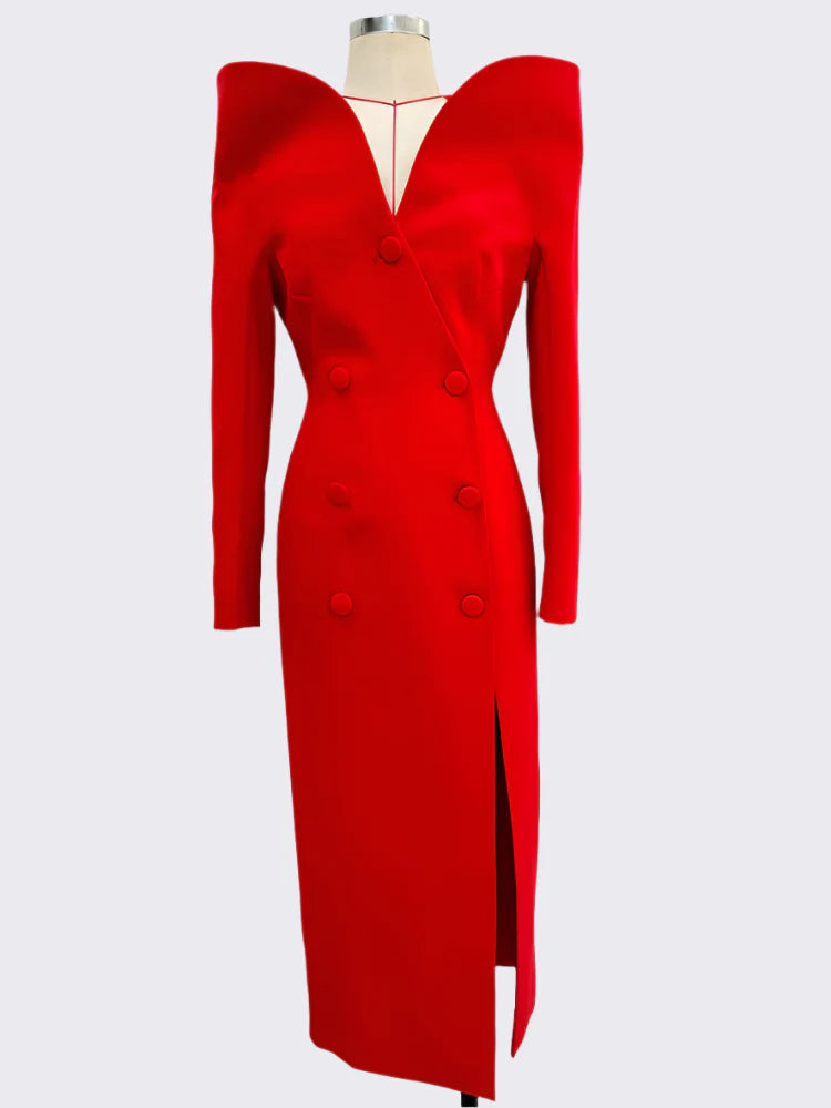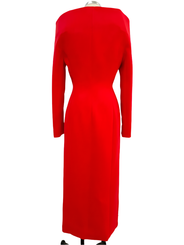 This bold crepe dress commands attention with its structured shoulders and dramatic neckline. The long sleeves add a sleek touch, balancing elegance with modern edge. Perfect for making a powerful statement at any event.