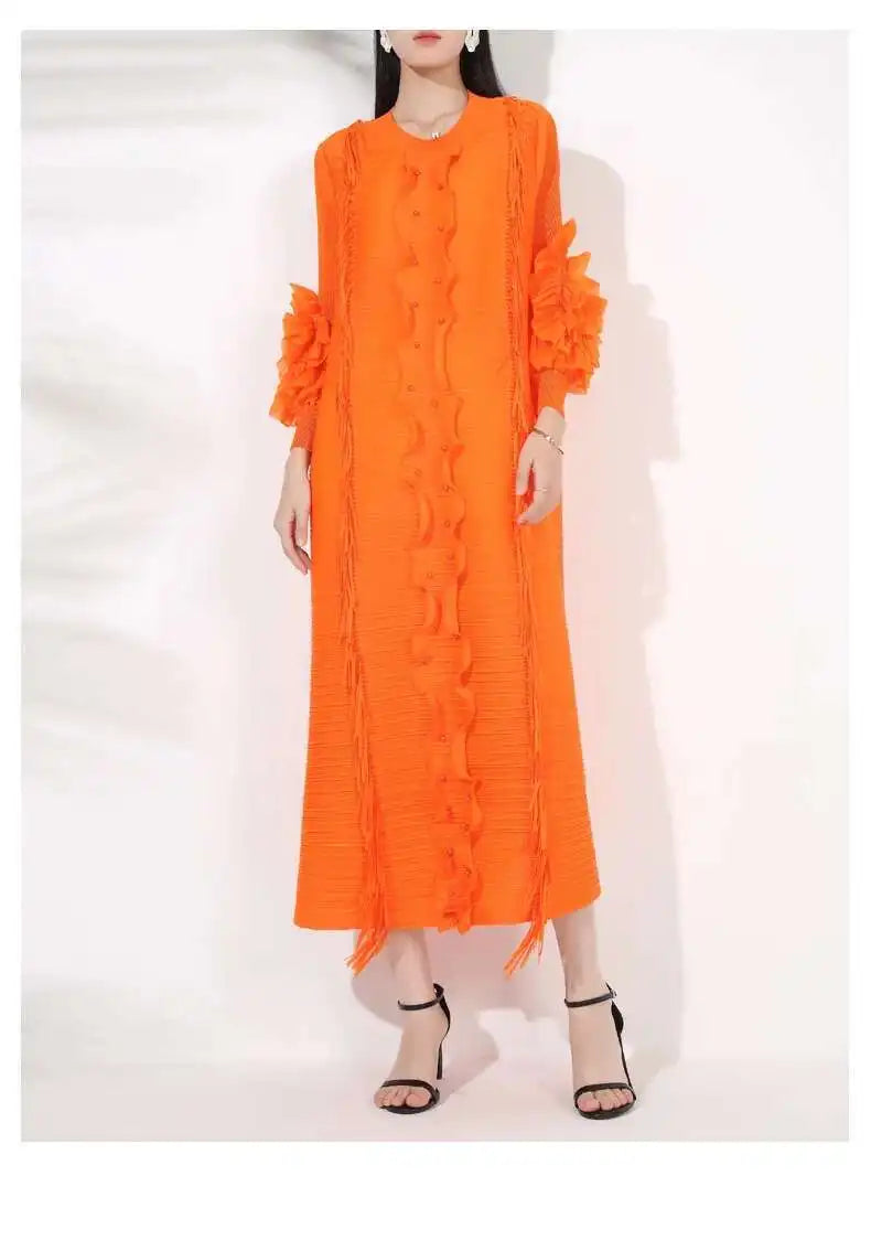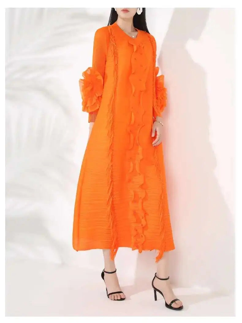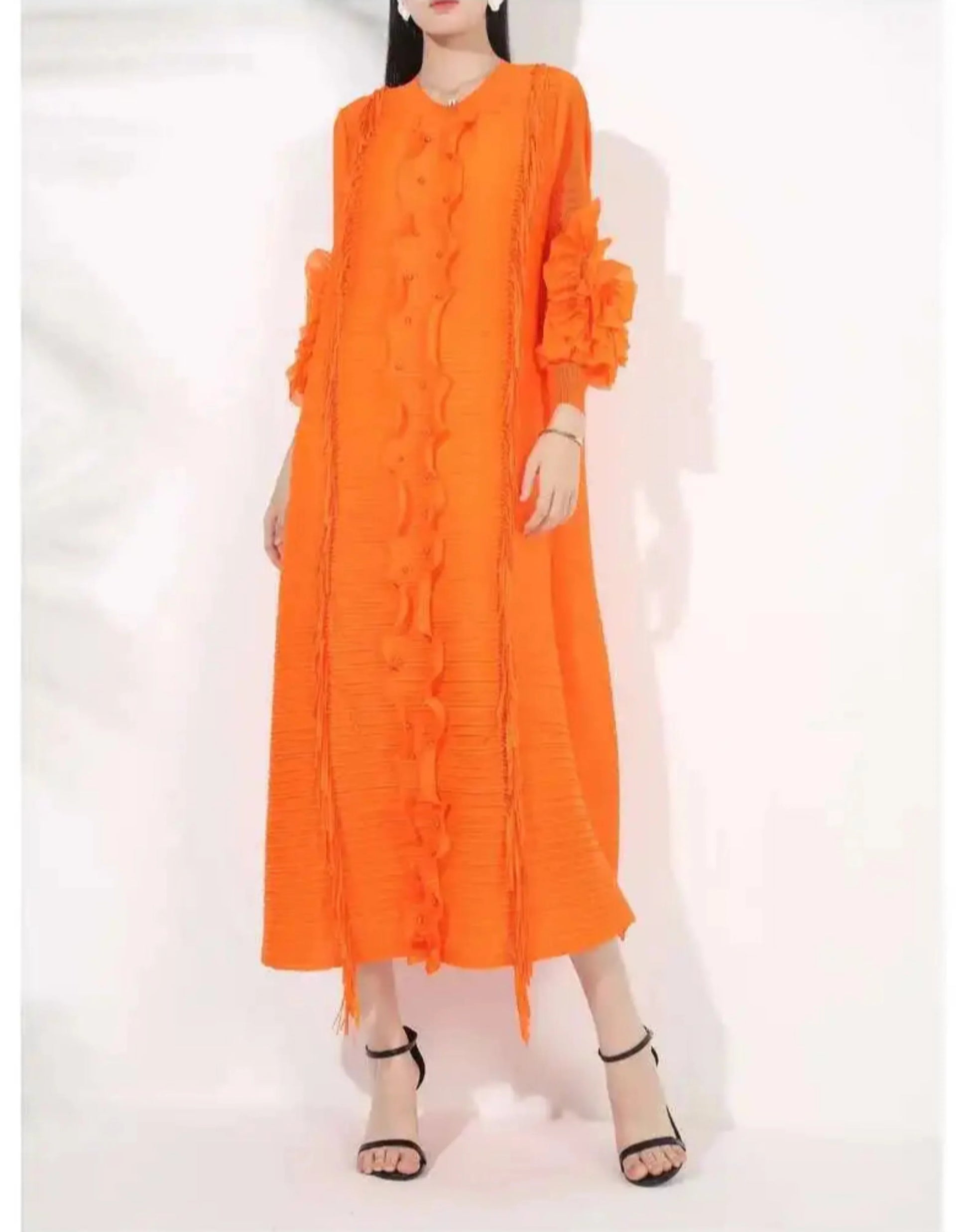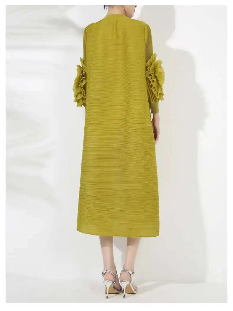 The Japanese pleats give it texture and flow, while the floral sleeves add a soft modern edge. Perfect for formal events or stylish everyday wear.