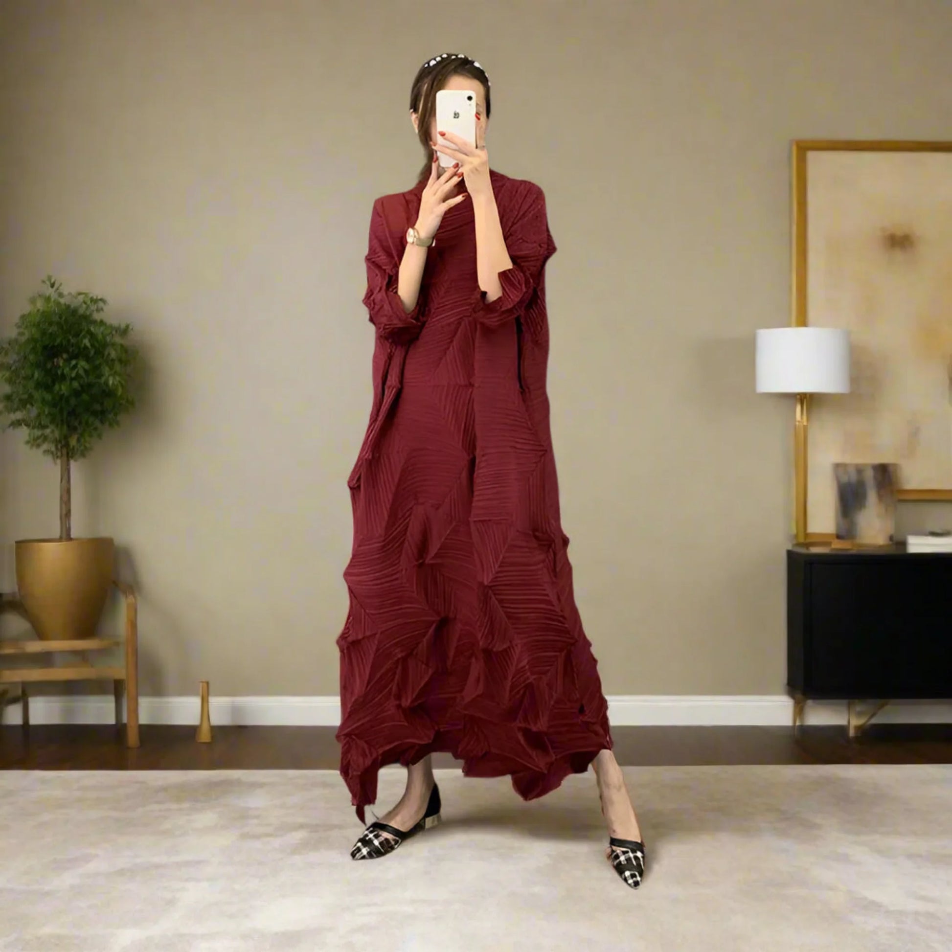 You're searching for something rare, elegant, and striking—this is it. Inspired by modern Japanese luxury, this midi dress flows with premium pleats and sculptural movement.