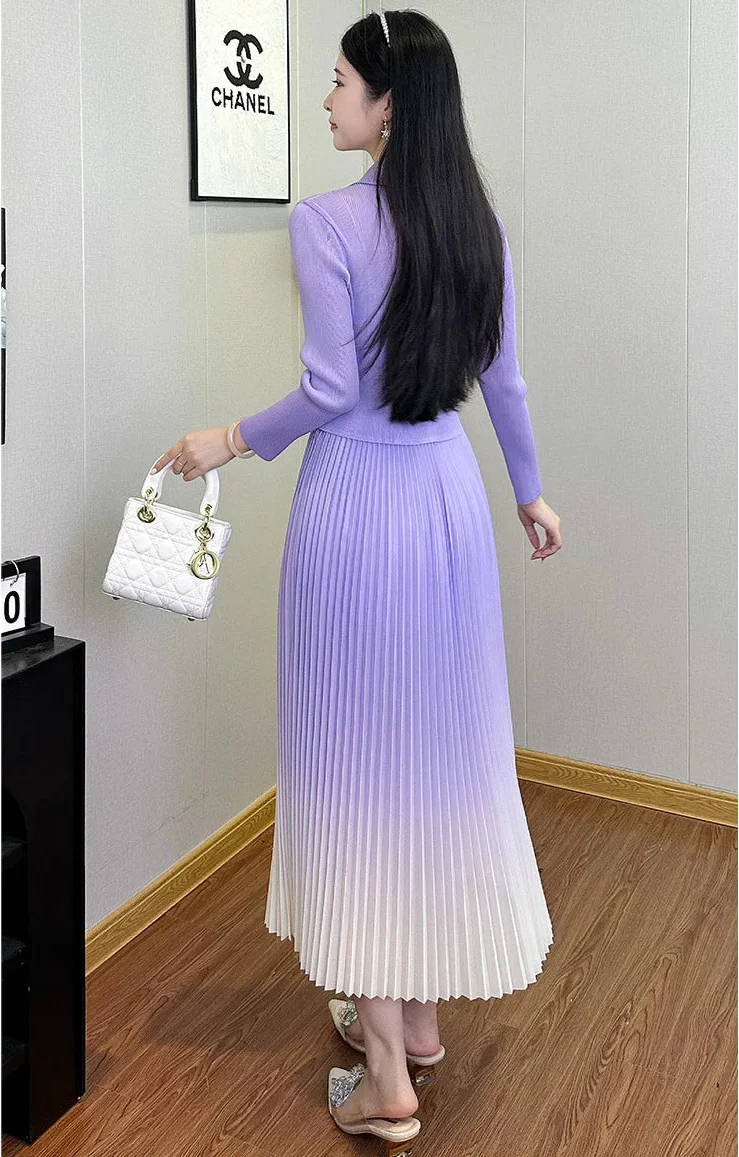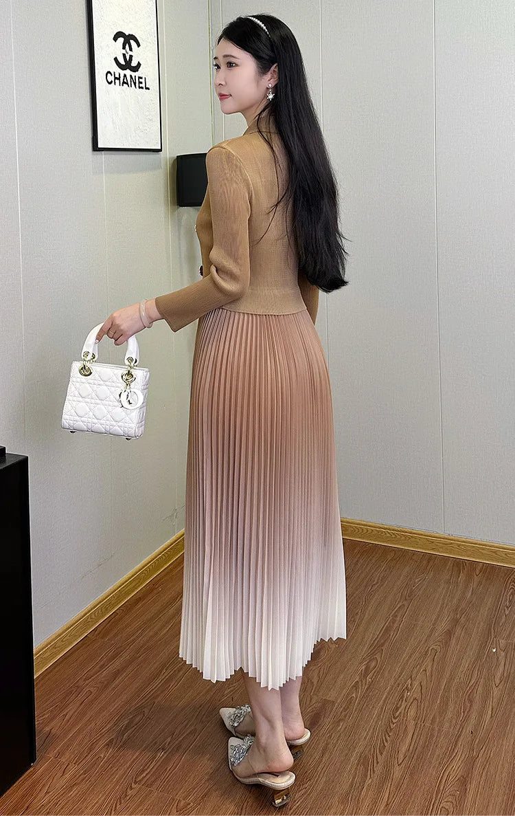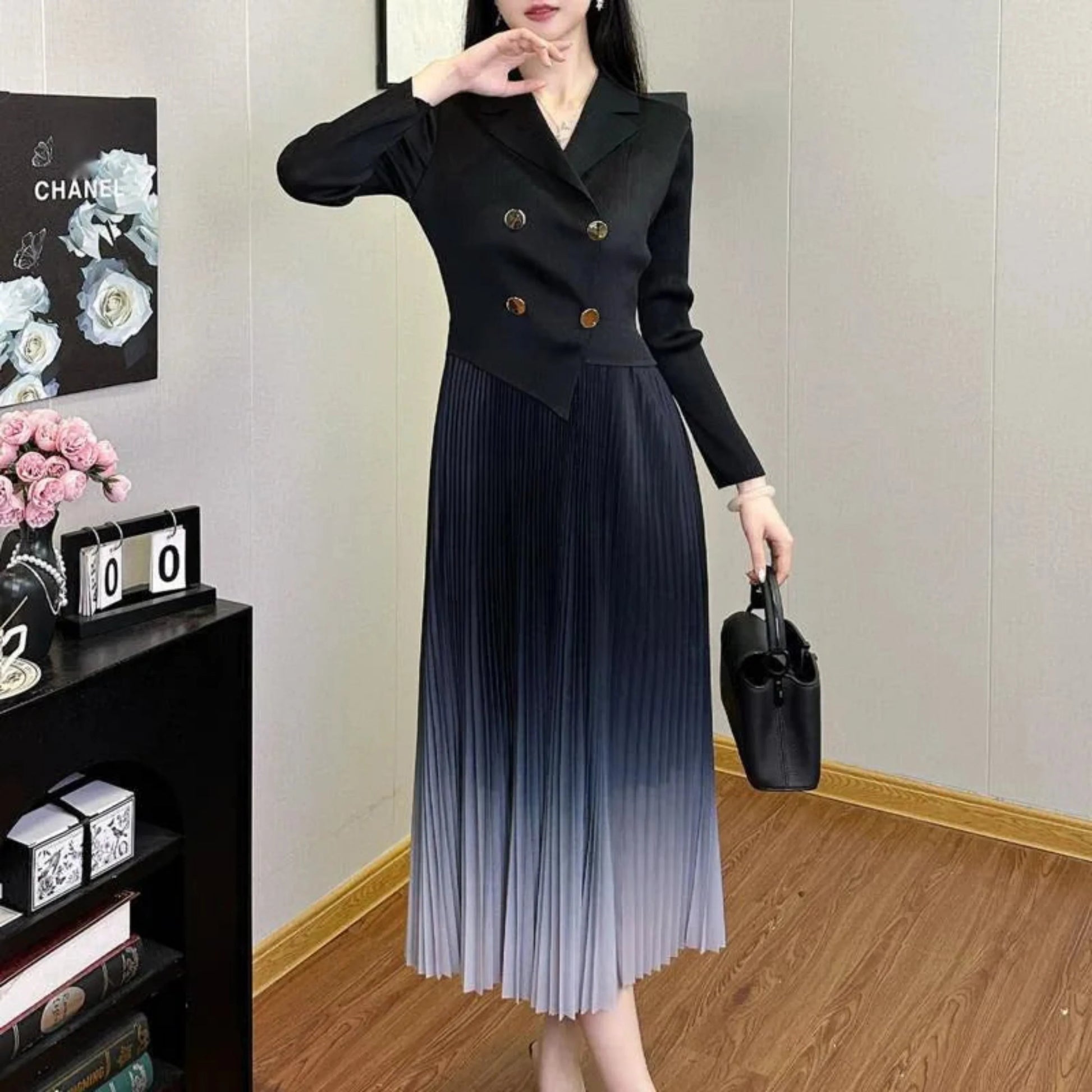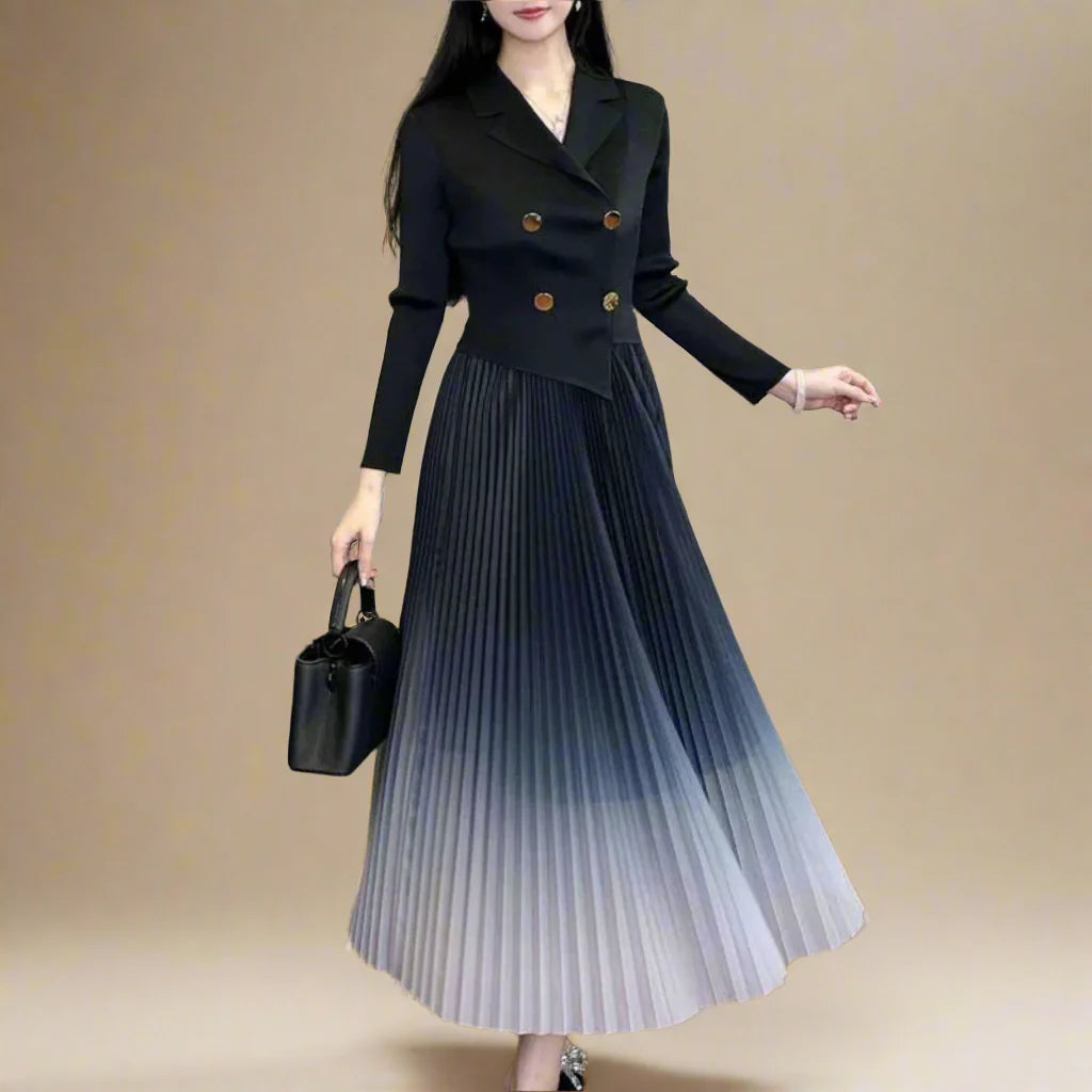 A modern dress that pairs tailored structure with fluid, ombre pleats. The asymmetric blazer-inspired cut adds subtle edge, while Japanese pleats create graceful movement with every step.