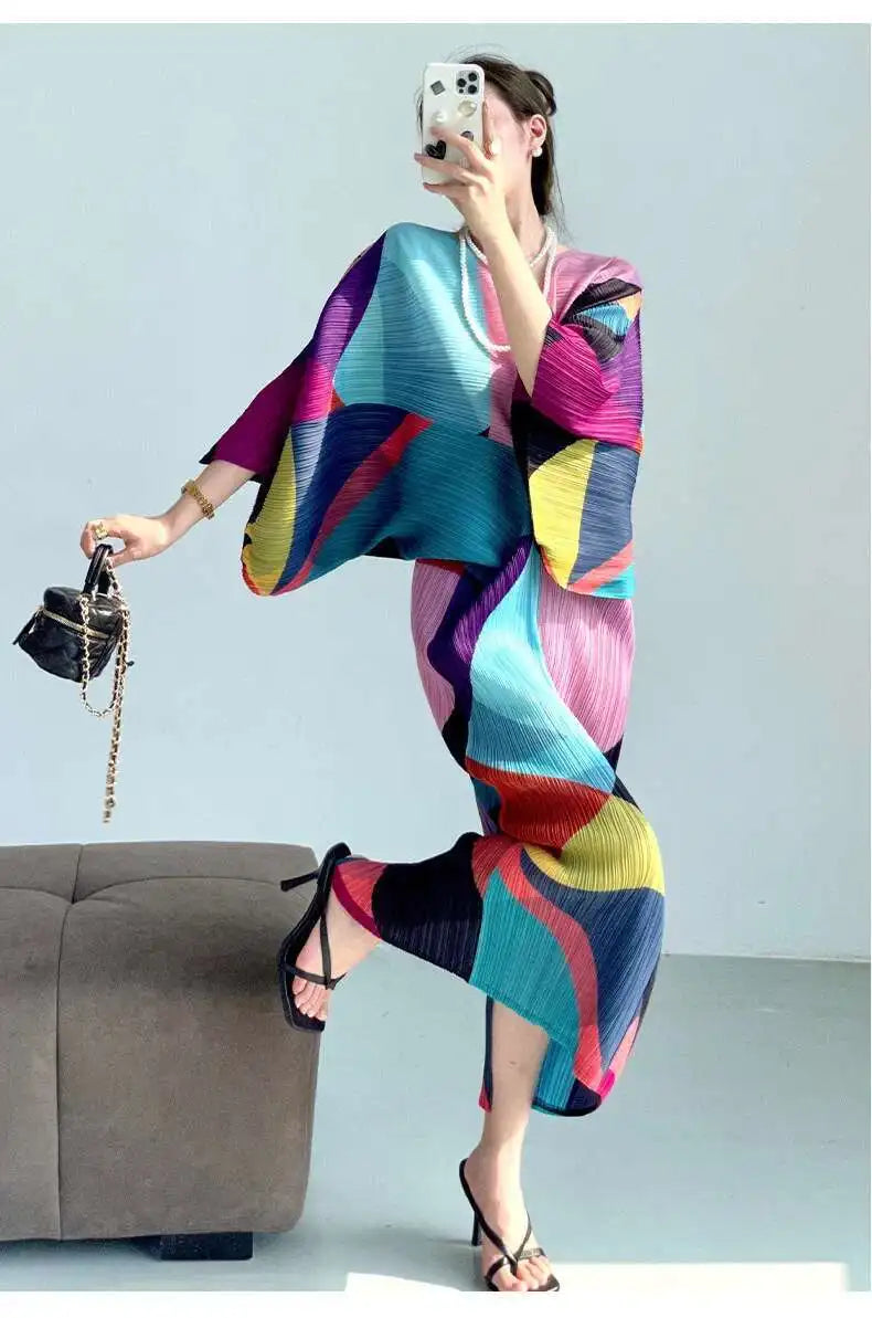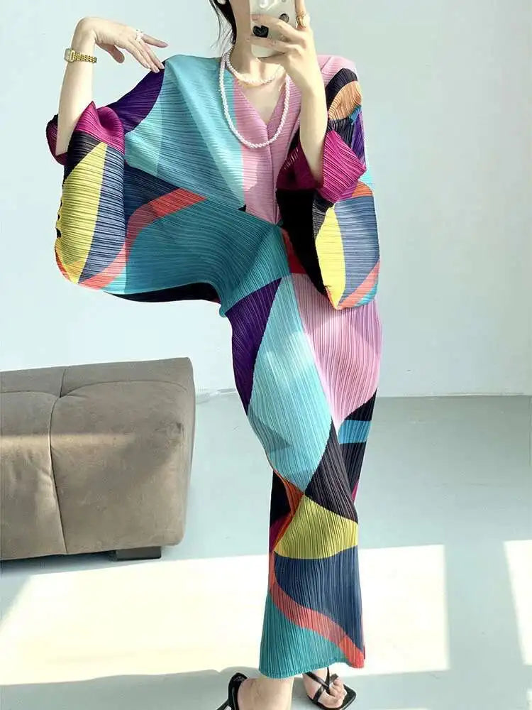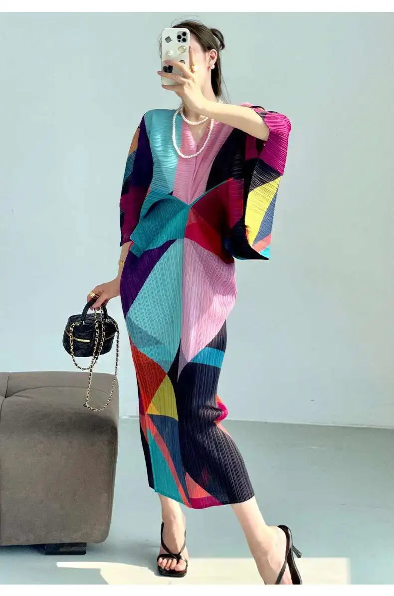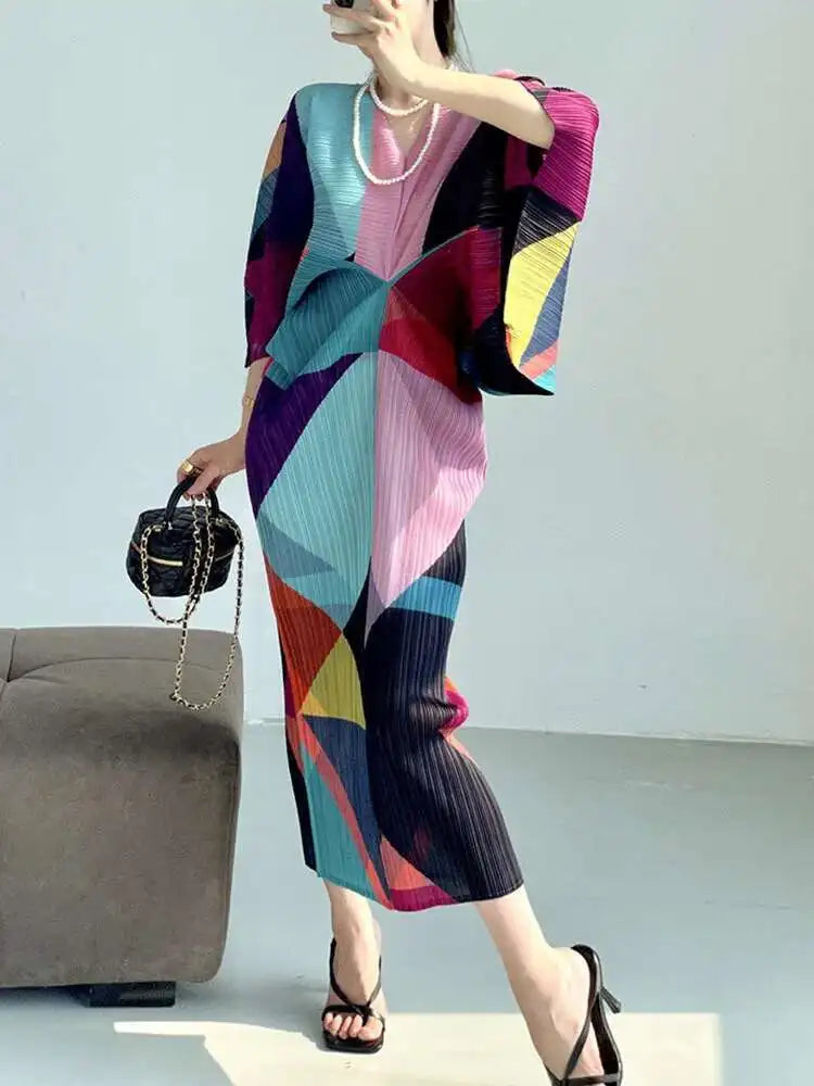 This midi dress features stretchy Japanese pleats with a unique geometric batwing design. The fabric is wrinkle-resistant and holds its shape, giving you a polished look that lasts all day.
