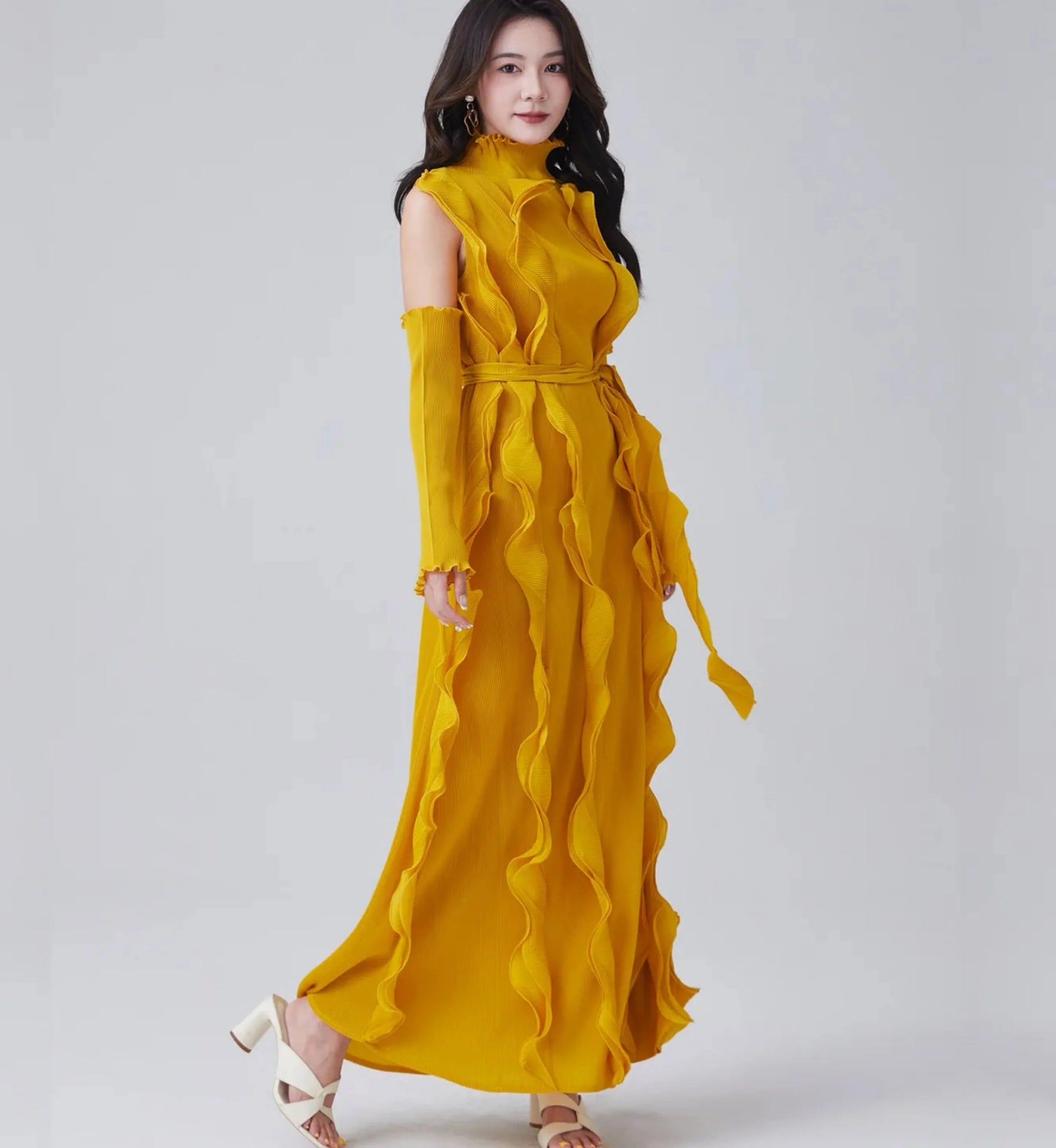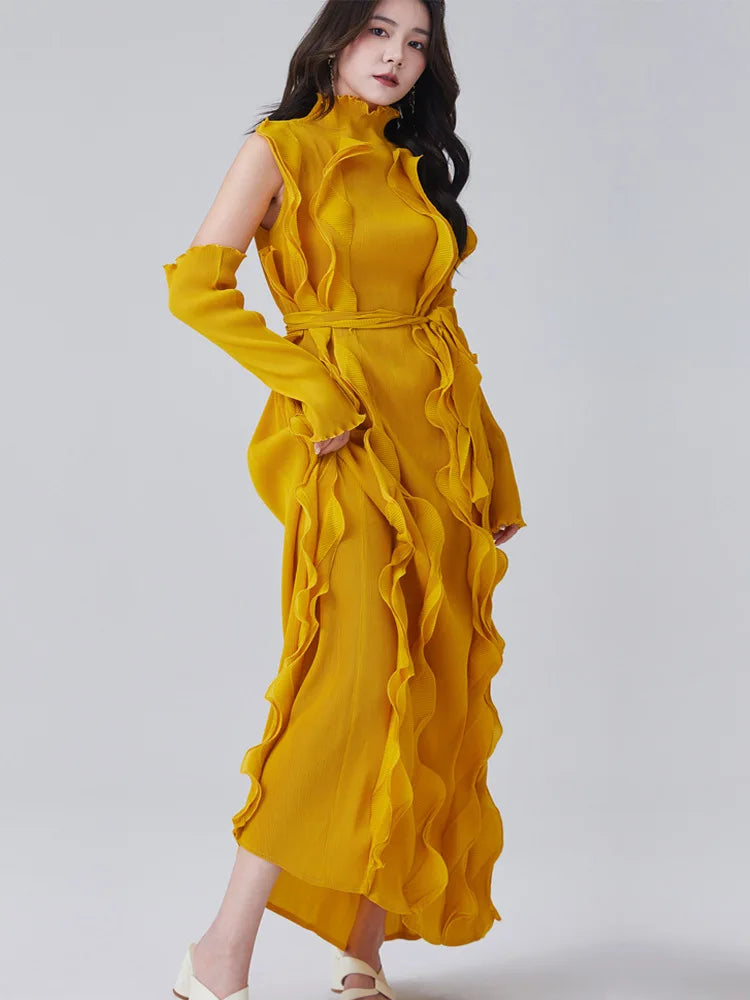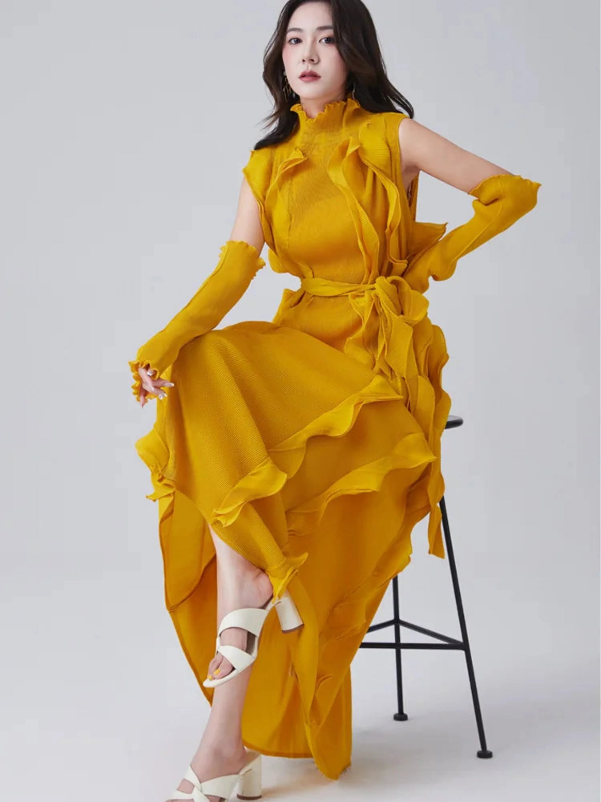 This sleeveless midi dress features Japanese pleats with layered ruffle details for a feminine touch.