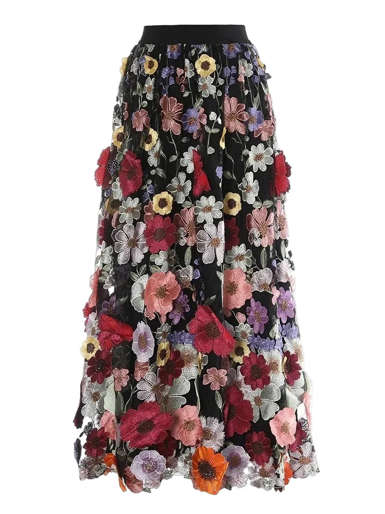 This couture midi skirt features 3D floral embroidery and a stretchy pull-on style with an elastic waistband for comfort. Elegant and luxurious, it’s perfect for formal events, weddings, or upscale everyday wear.