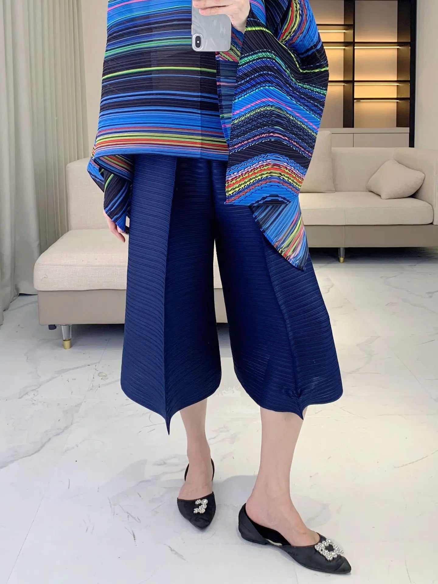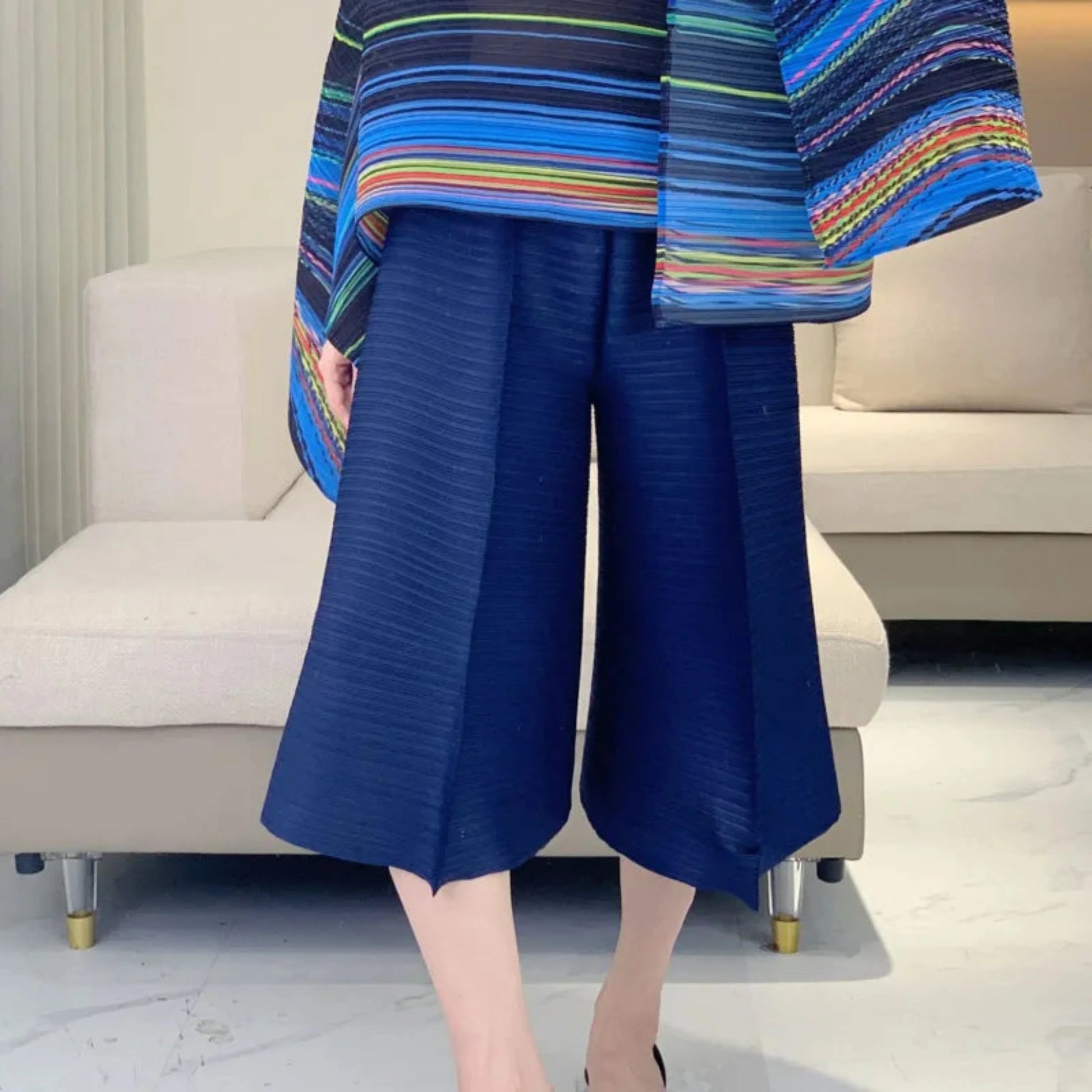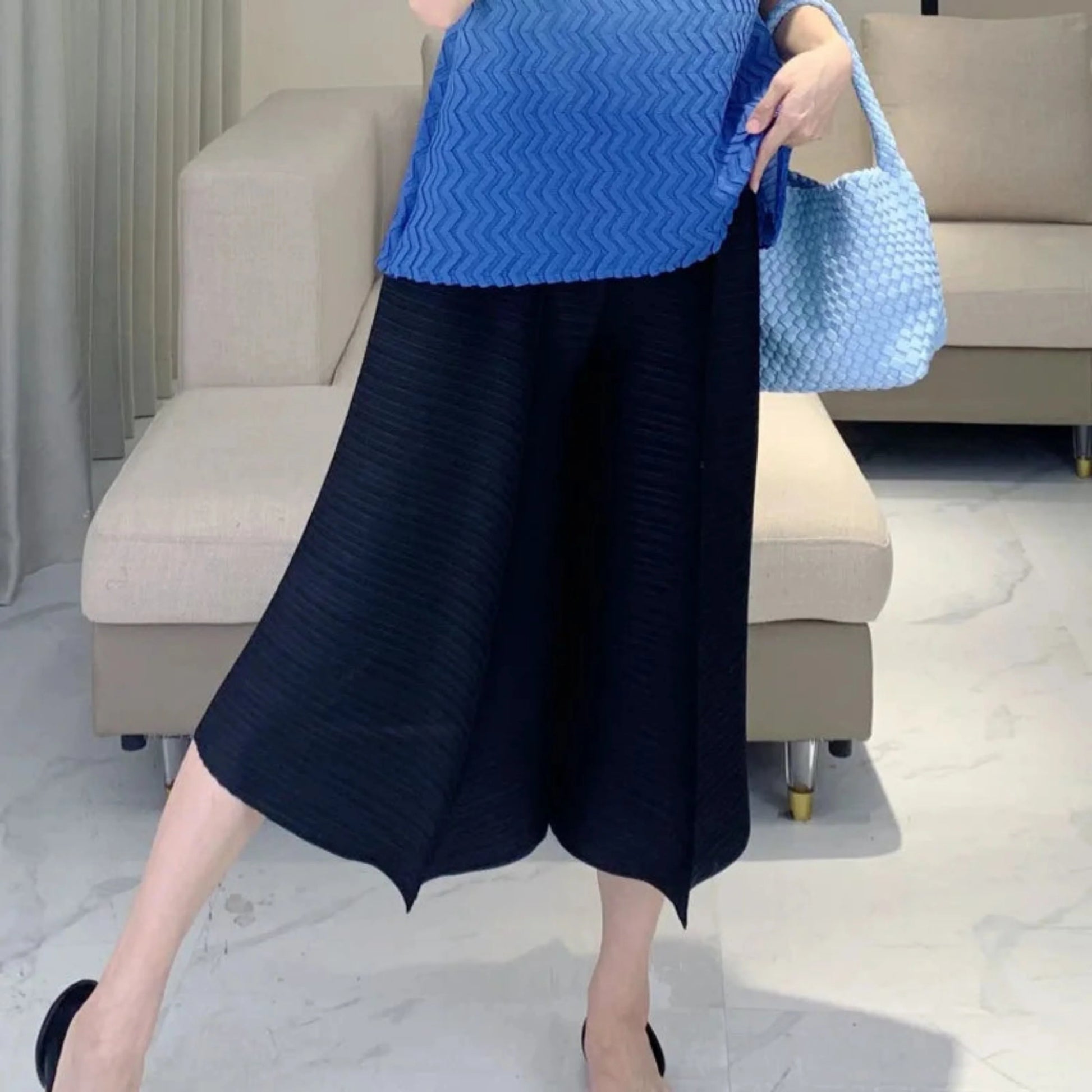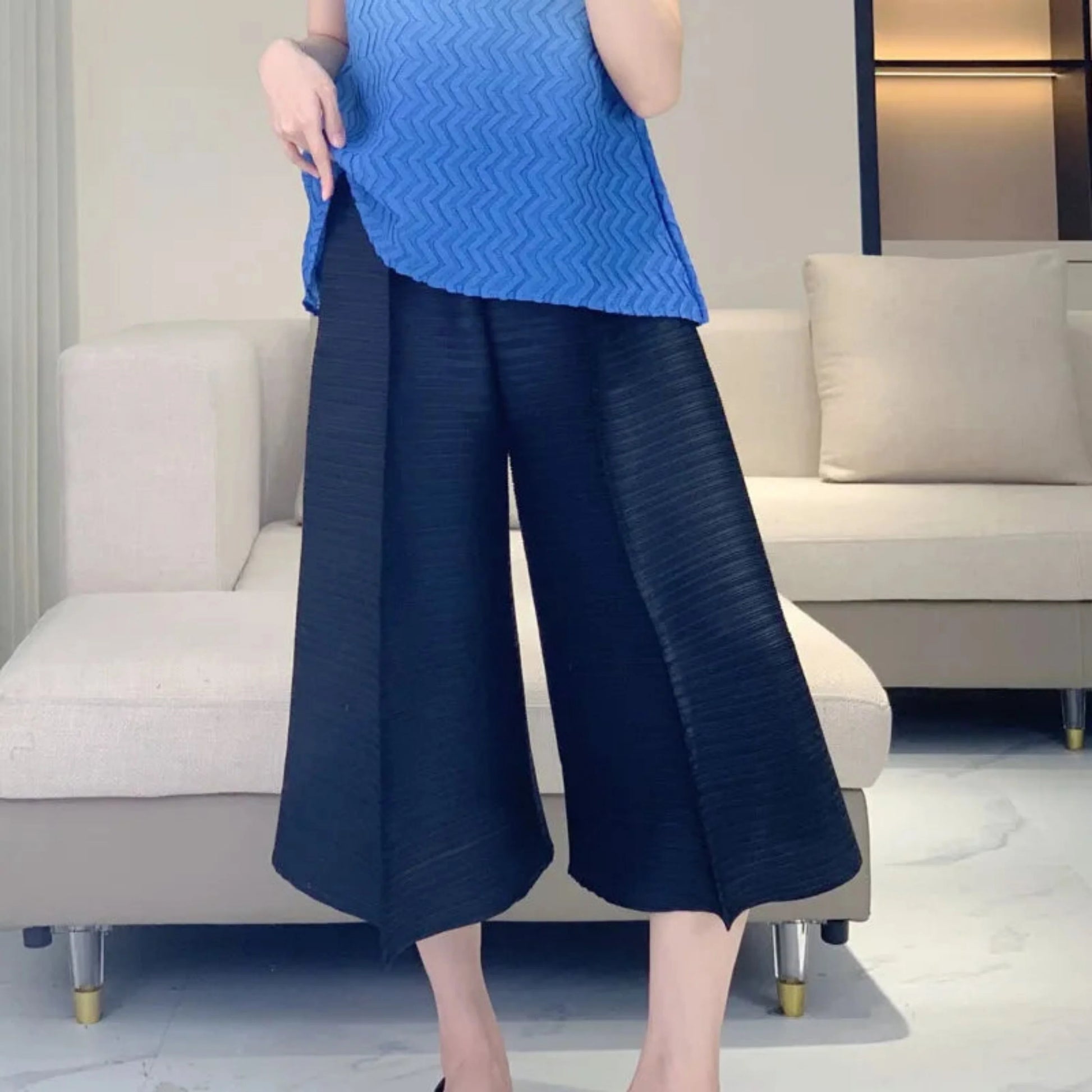 These wide-leg trousers feature Japanese plissé texture with a relaxed silhouette designed for all-day comfort.