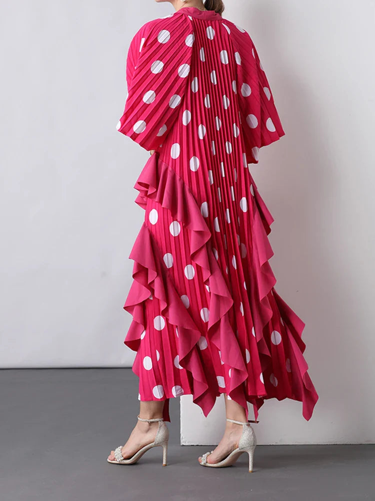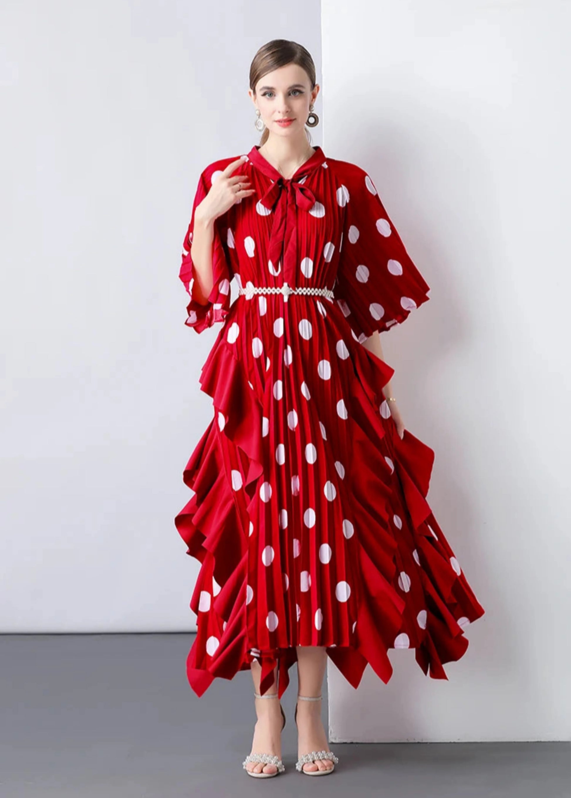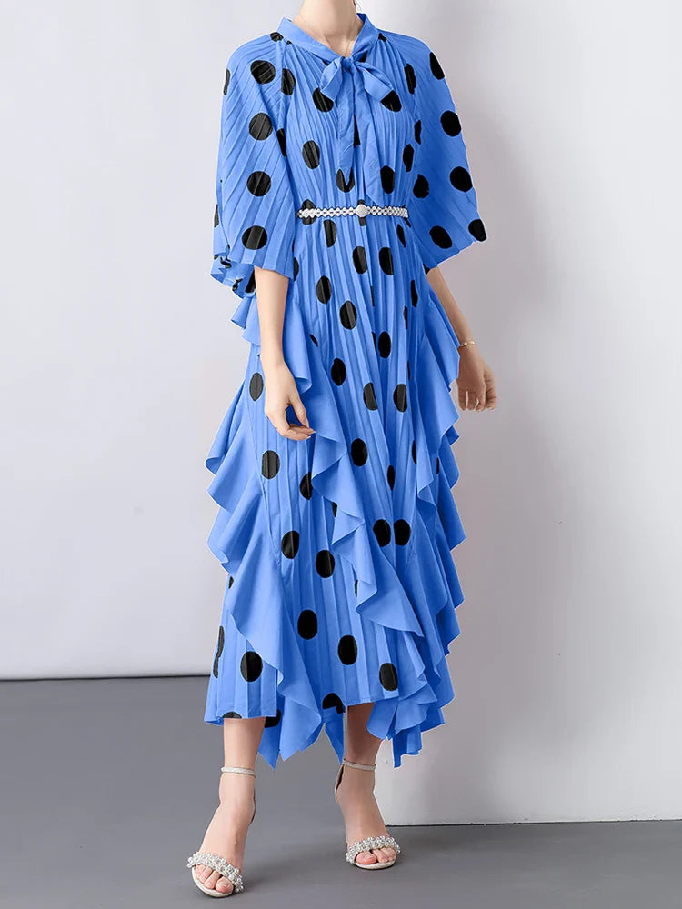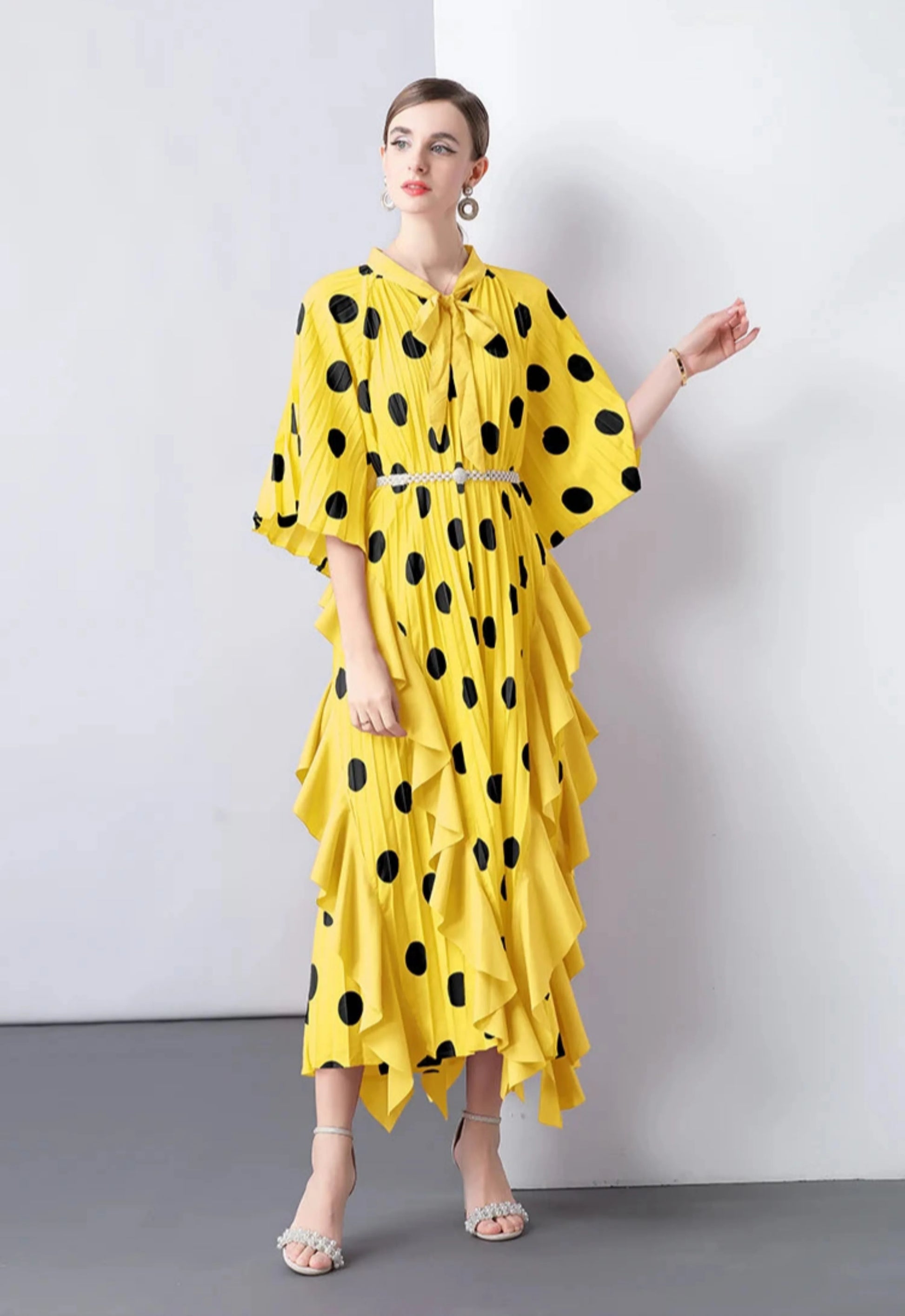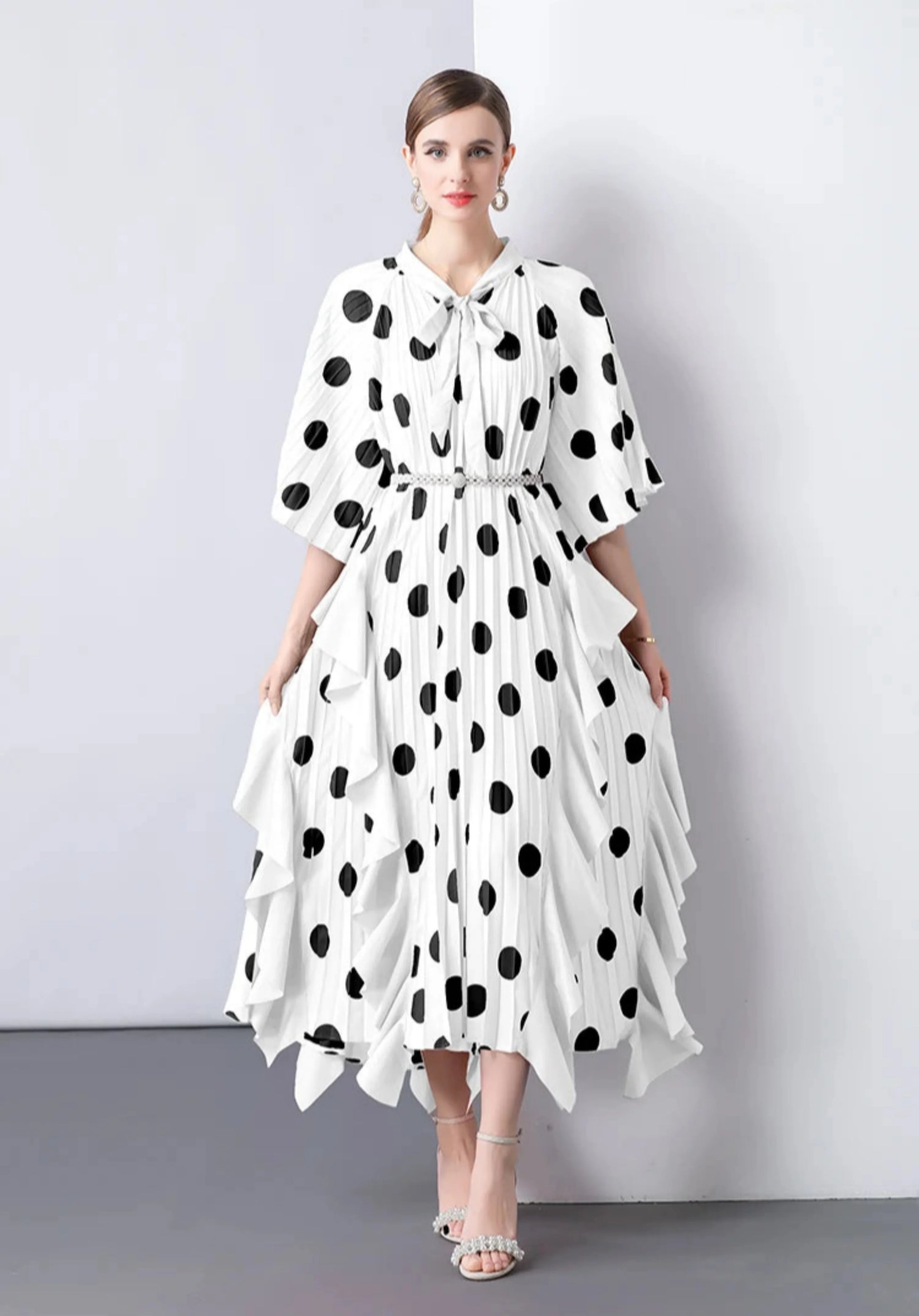 Designed for everyday ease with a refined edge, this dress features lightweight Japanese plissé, soft ruffle details, and oversized 3/4 sleeves. The playful polka dots add a feminine, flirty, and modest touch while balancing comfort and shape.