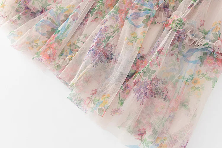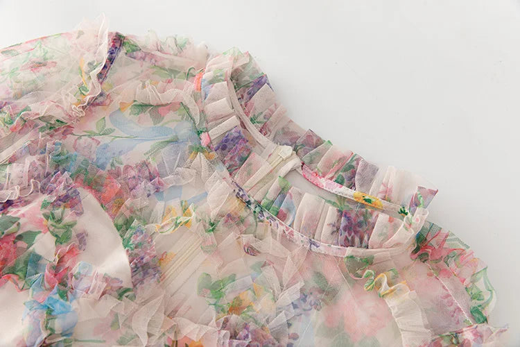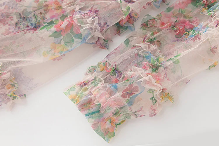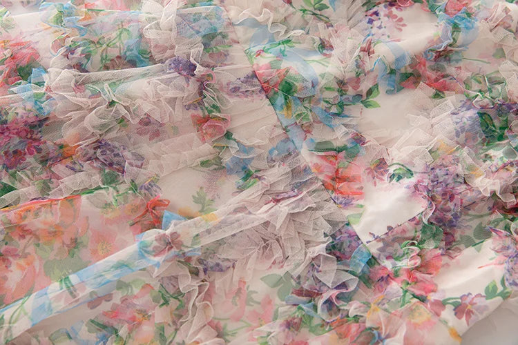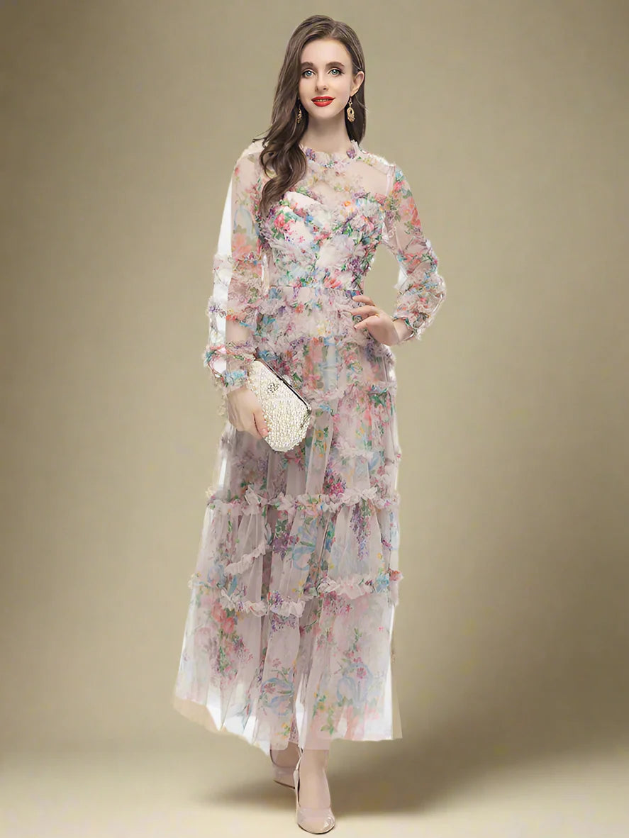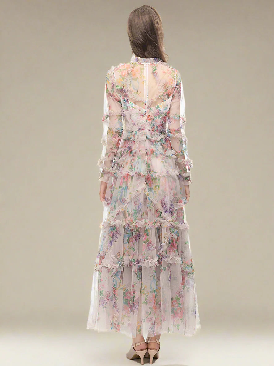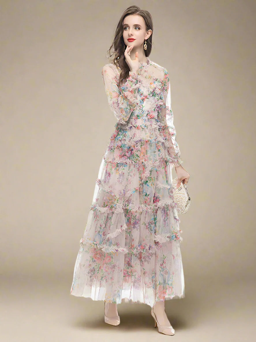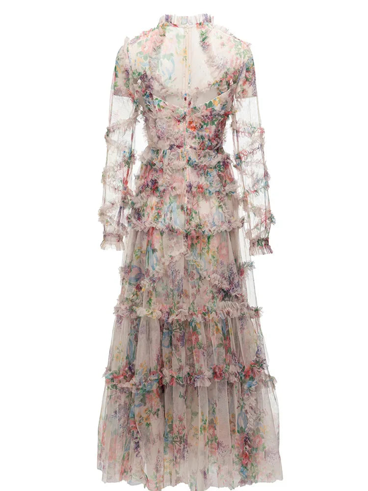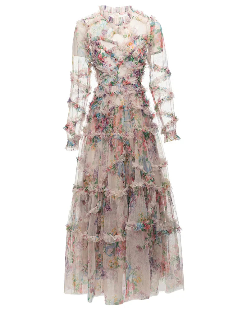 Designer-inspired and detailed with tiered florals and mesh sleeves, it’s your invitation to feel unforgettable.