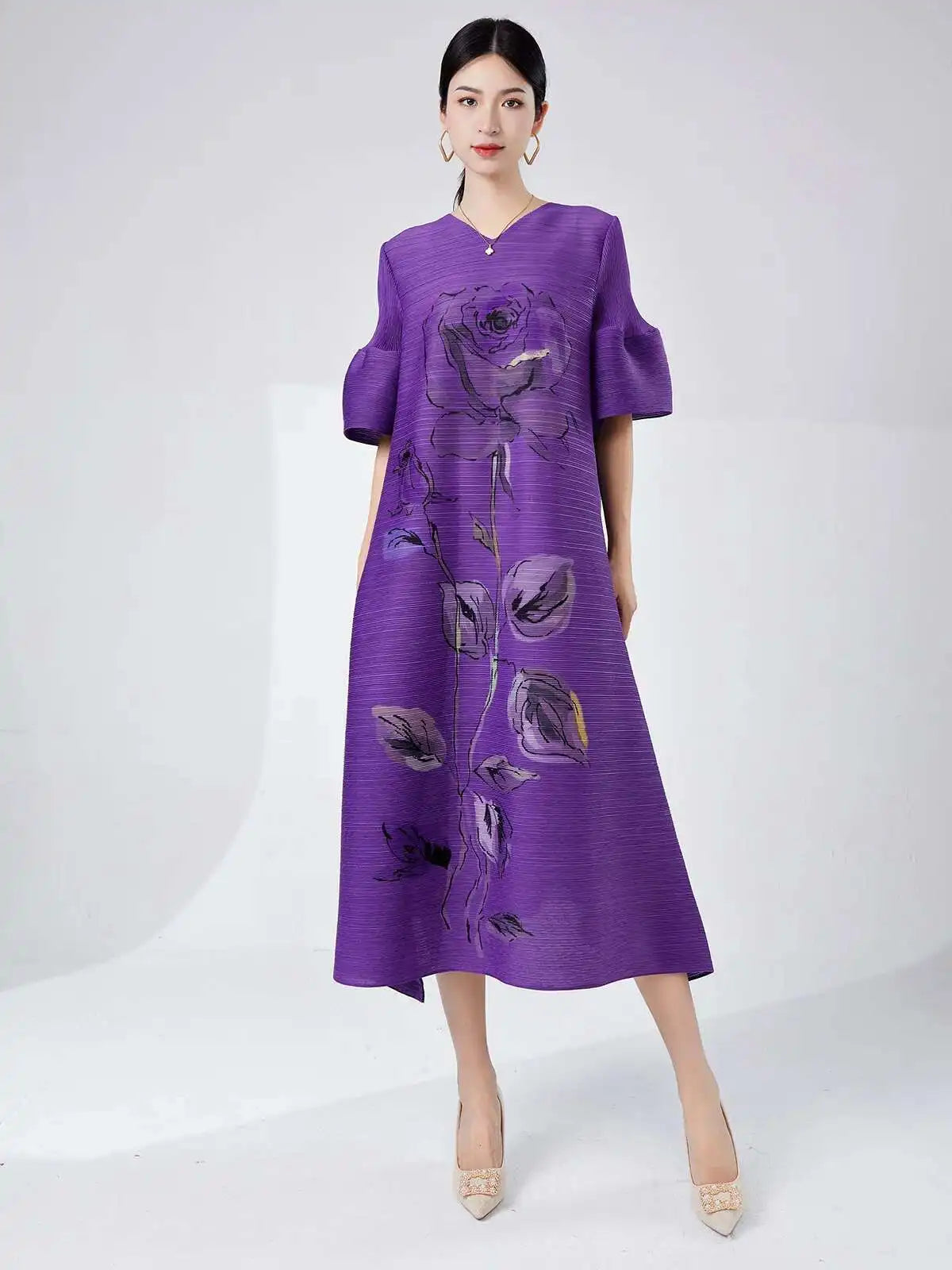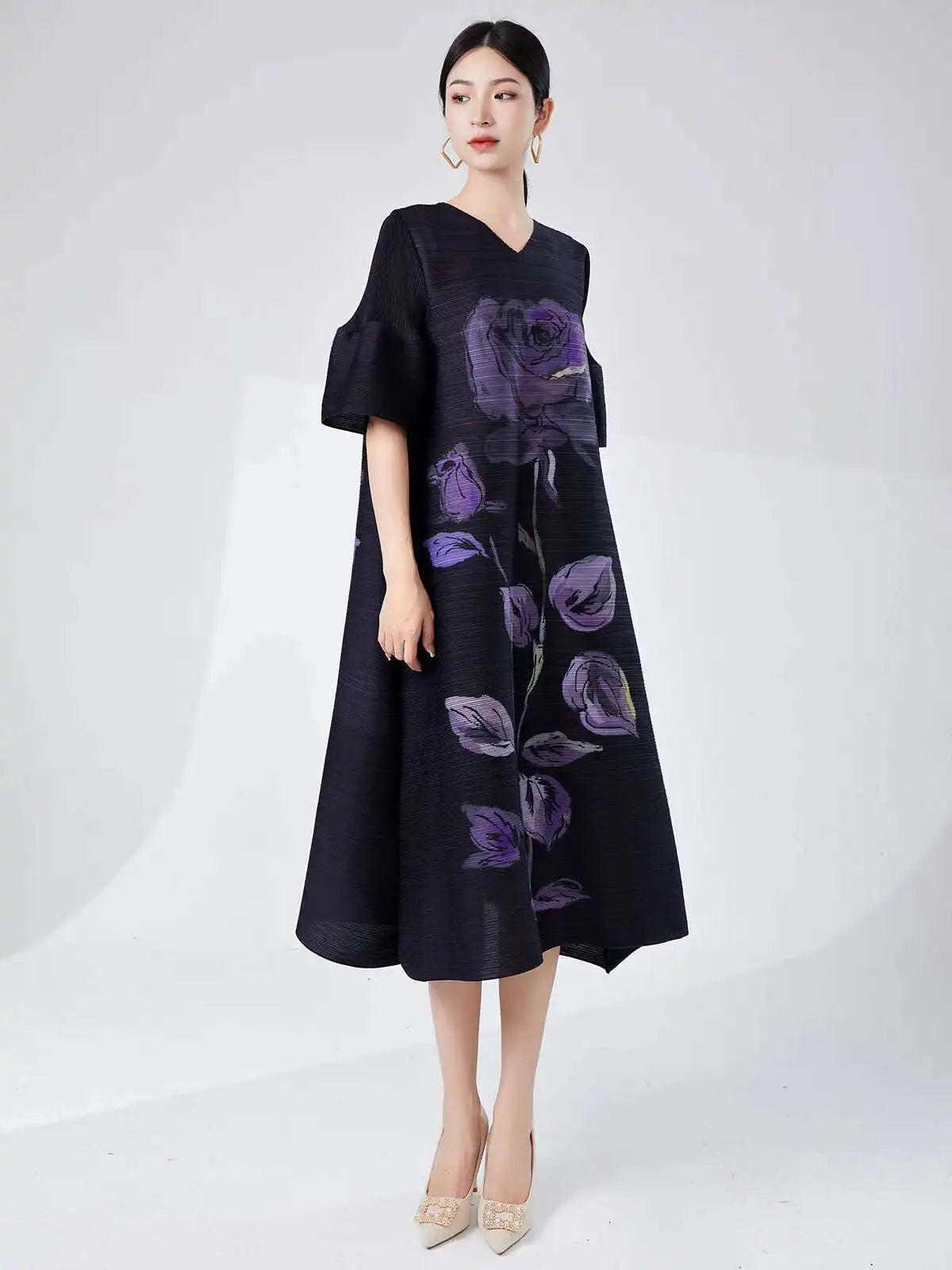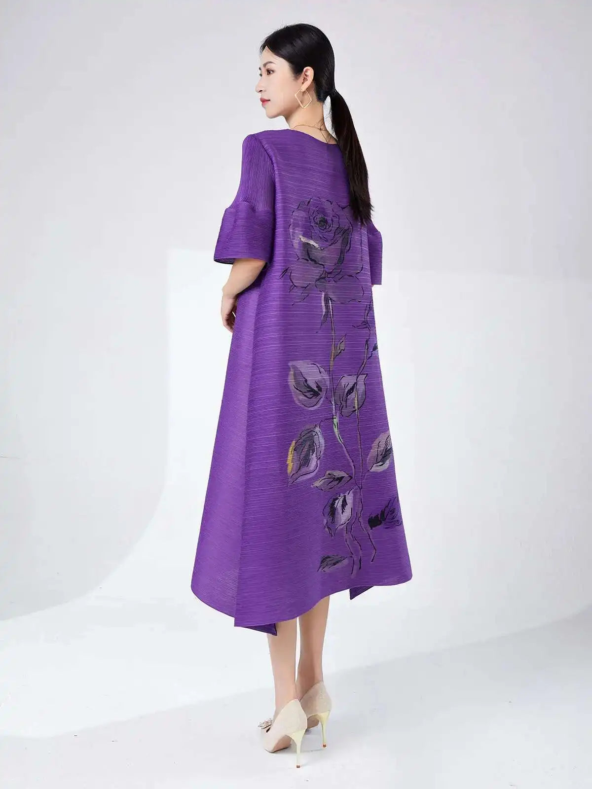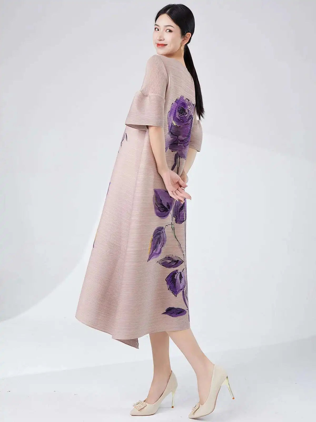 A statement in Japanese pleats, this luxurious midi dress features flowing cape sleeves and a graceful silhouette.