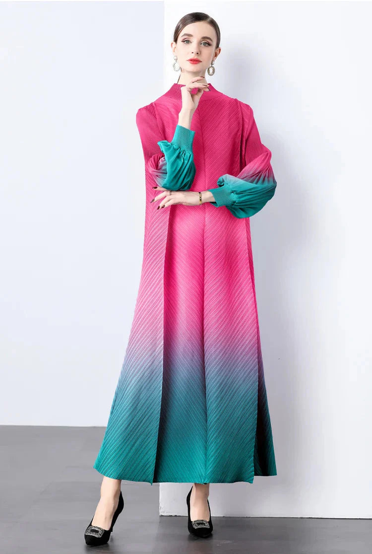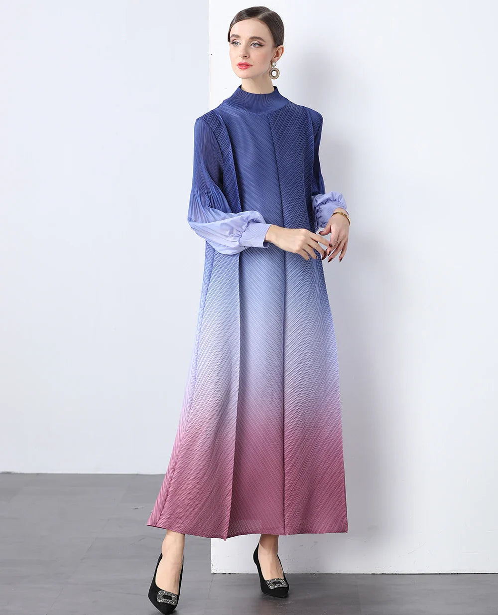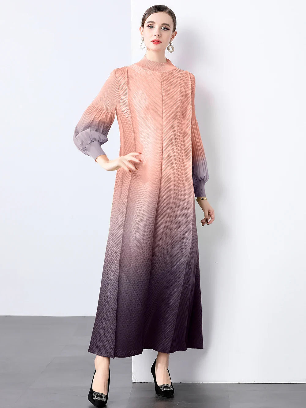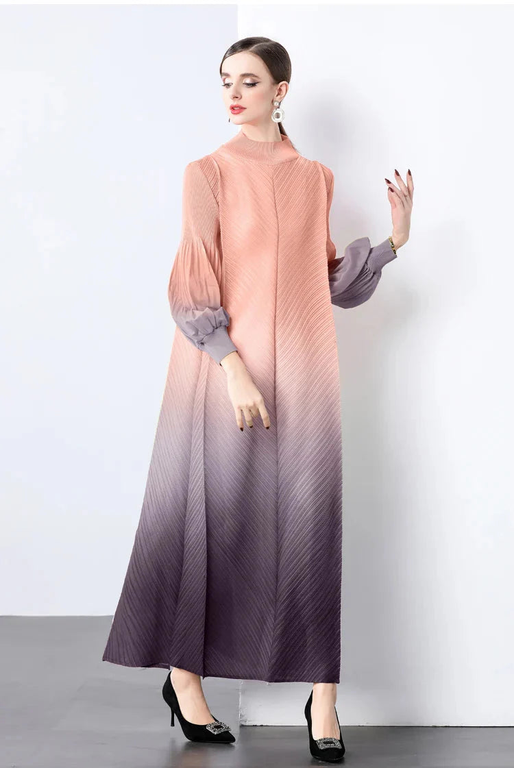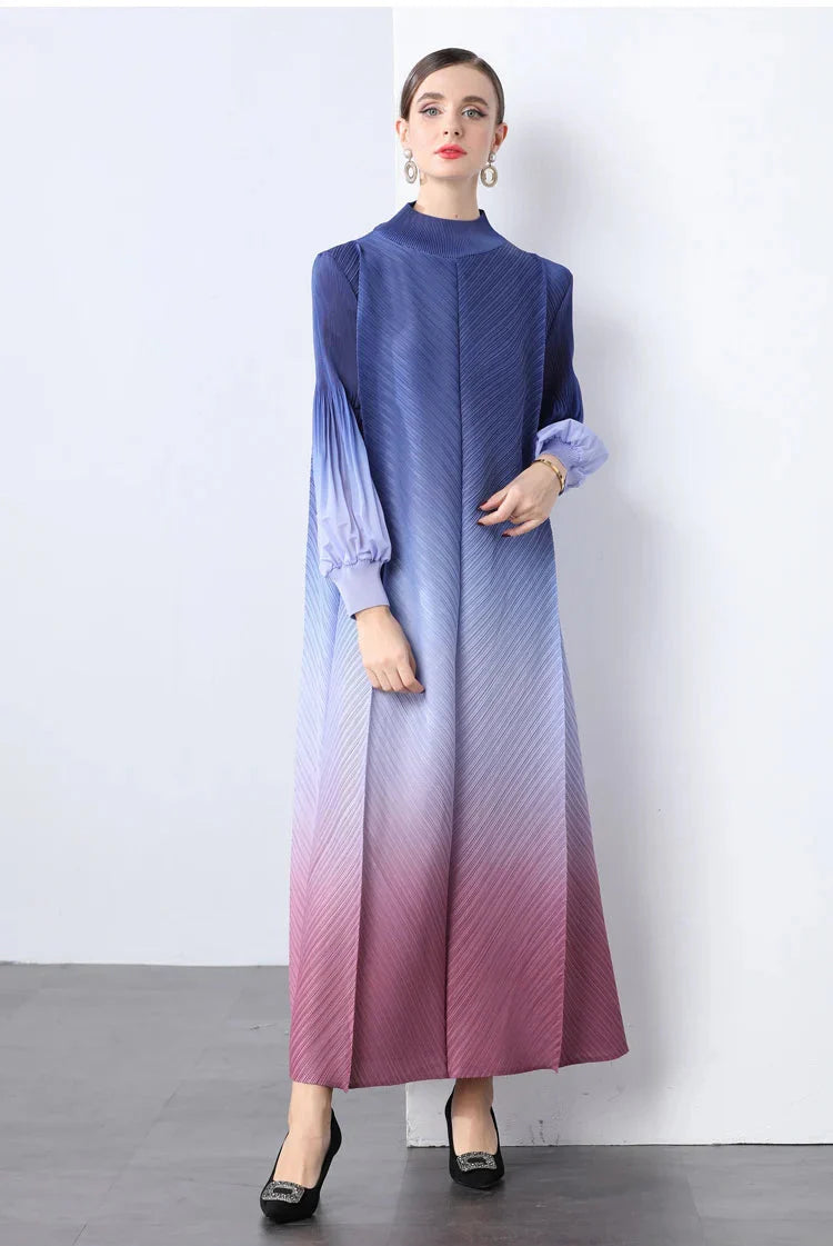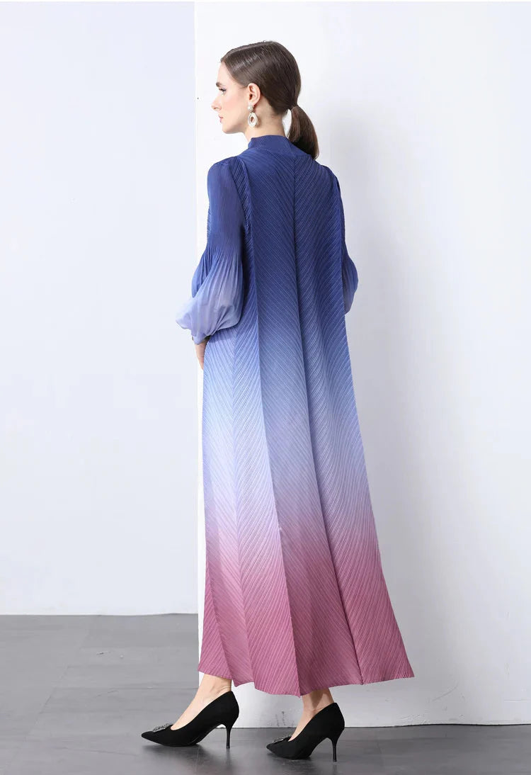 This Japanese designer dress blends comfort and beauty in one striking piece. With ombré plissé texture and long cuffed sleeves, it moves easily and feels light on the body.