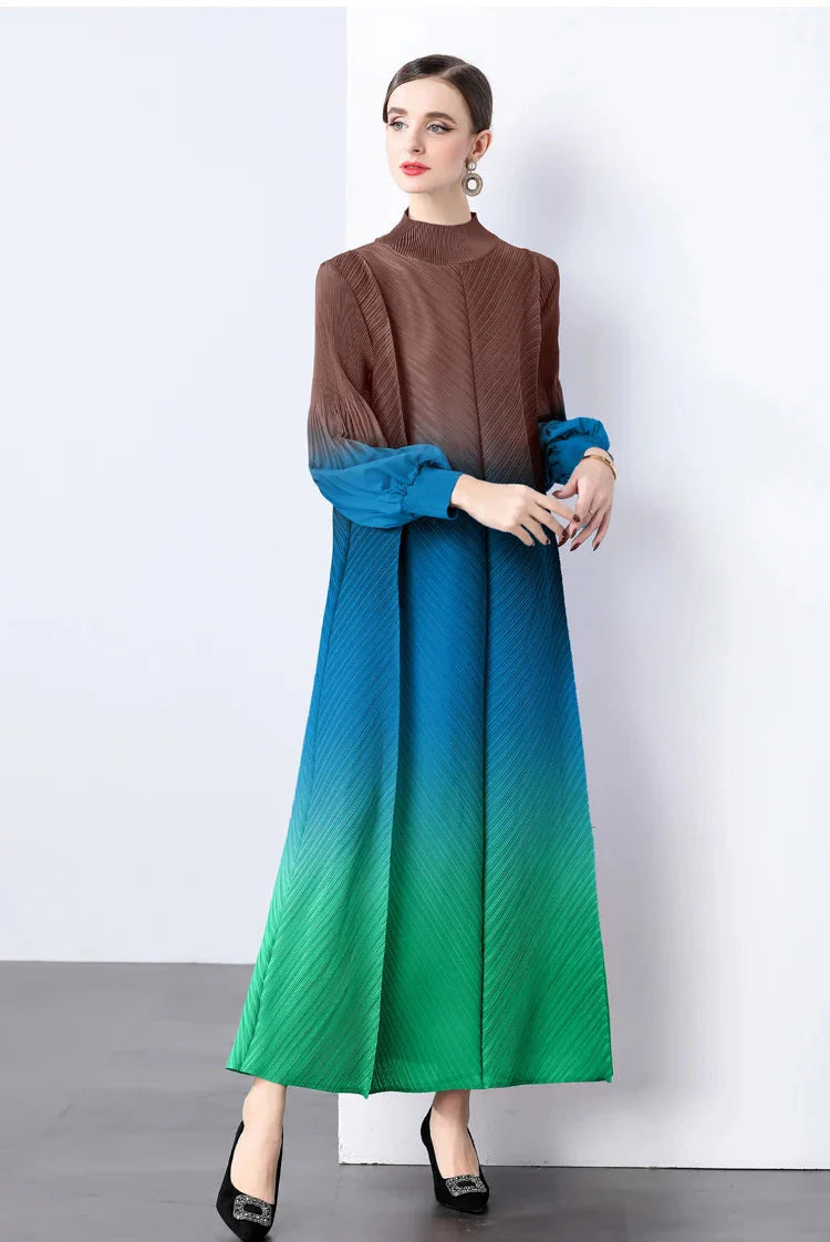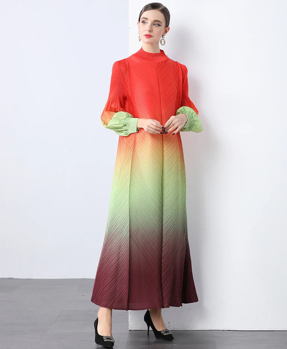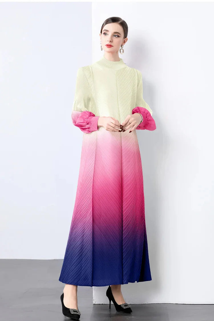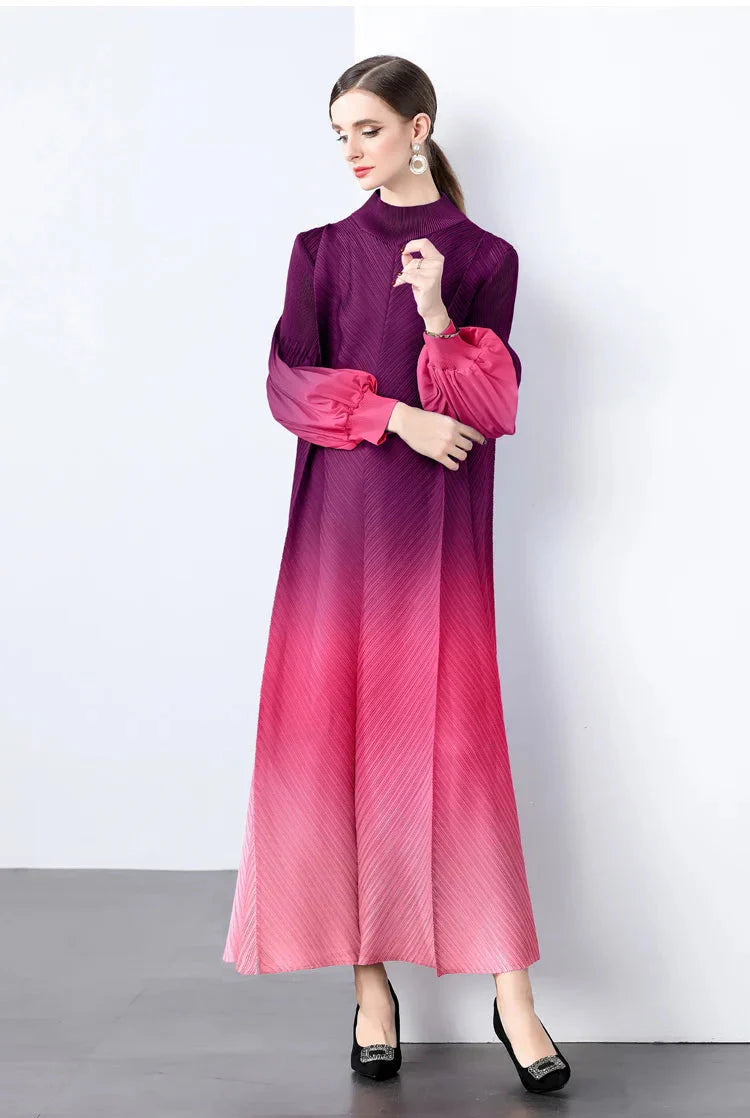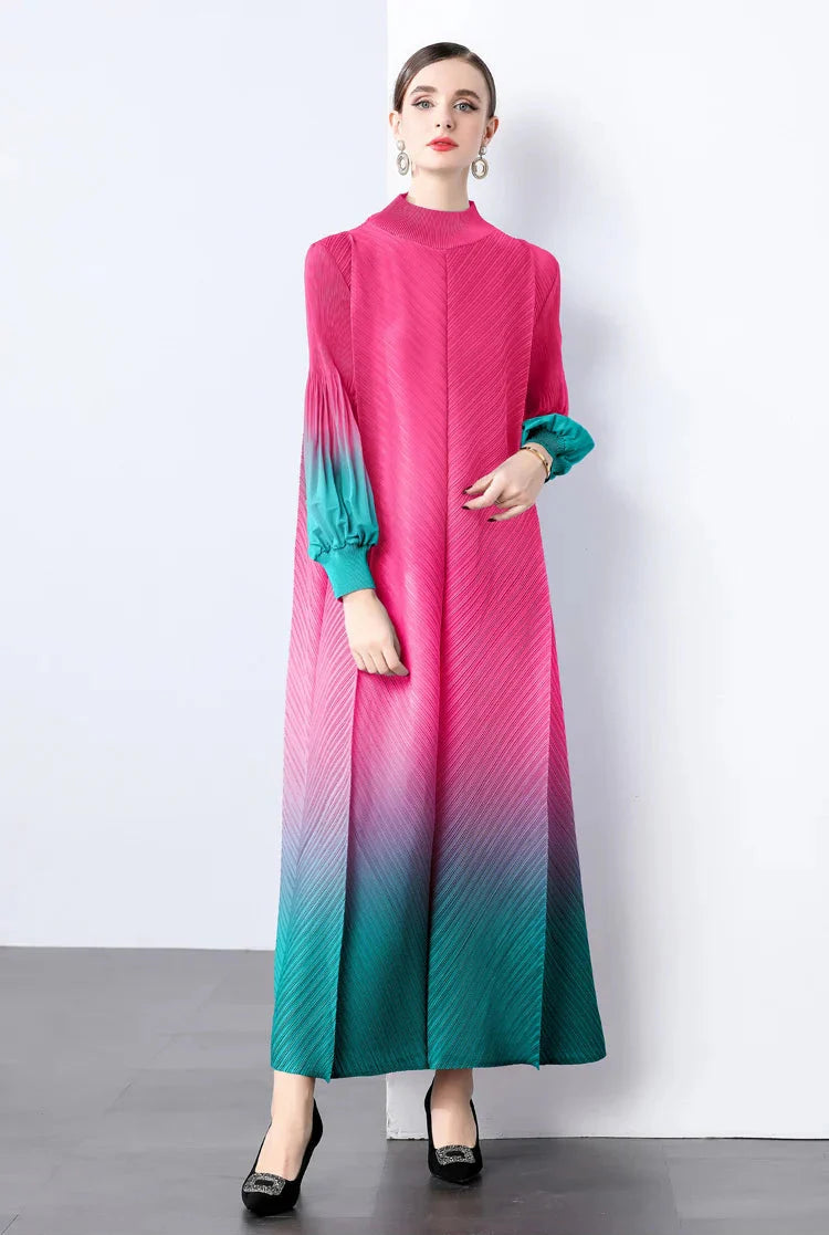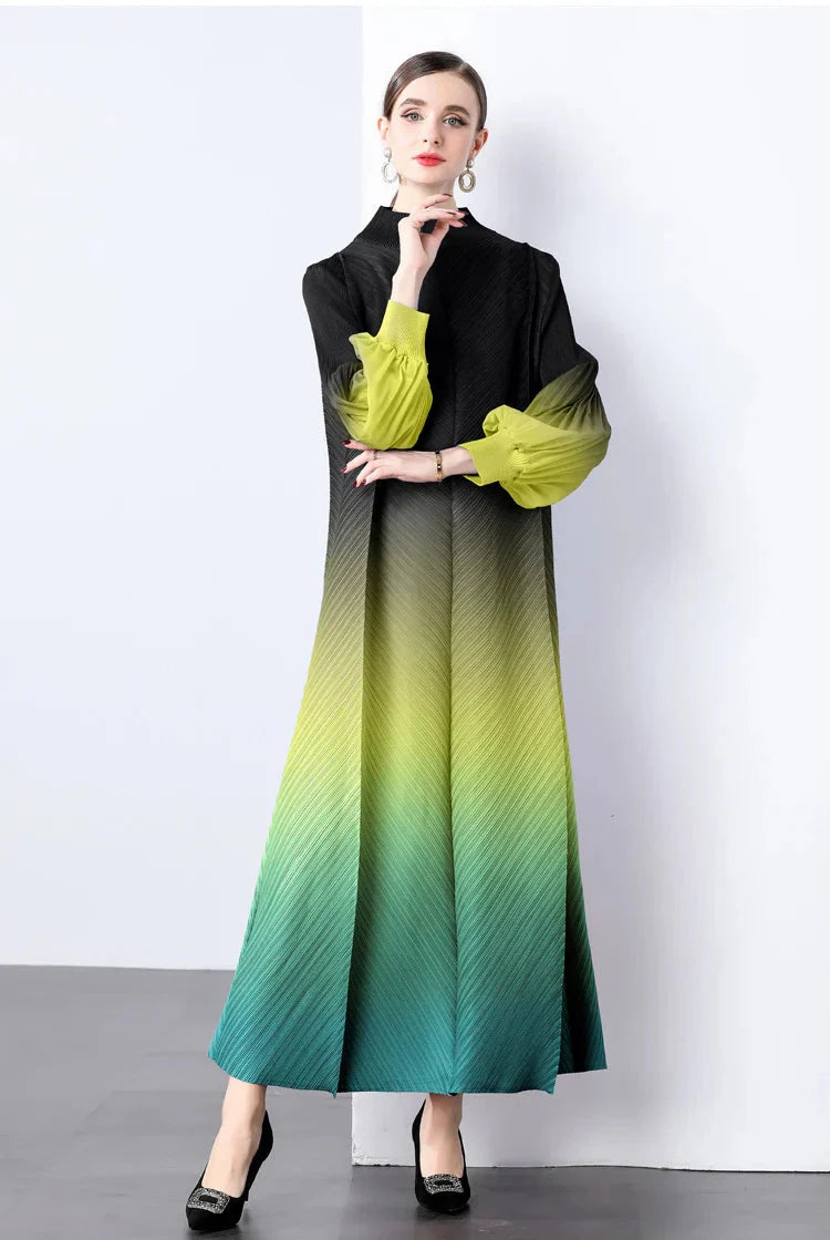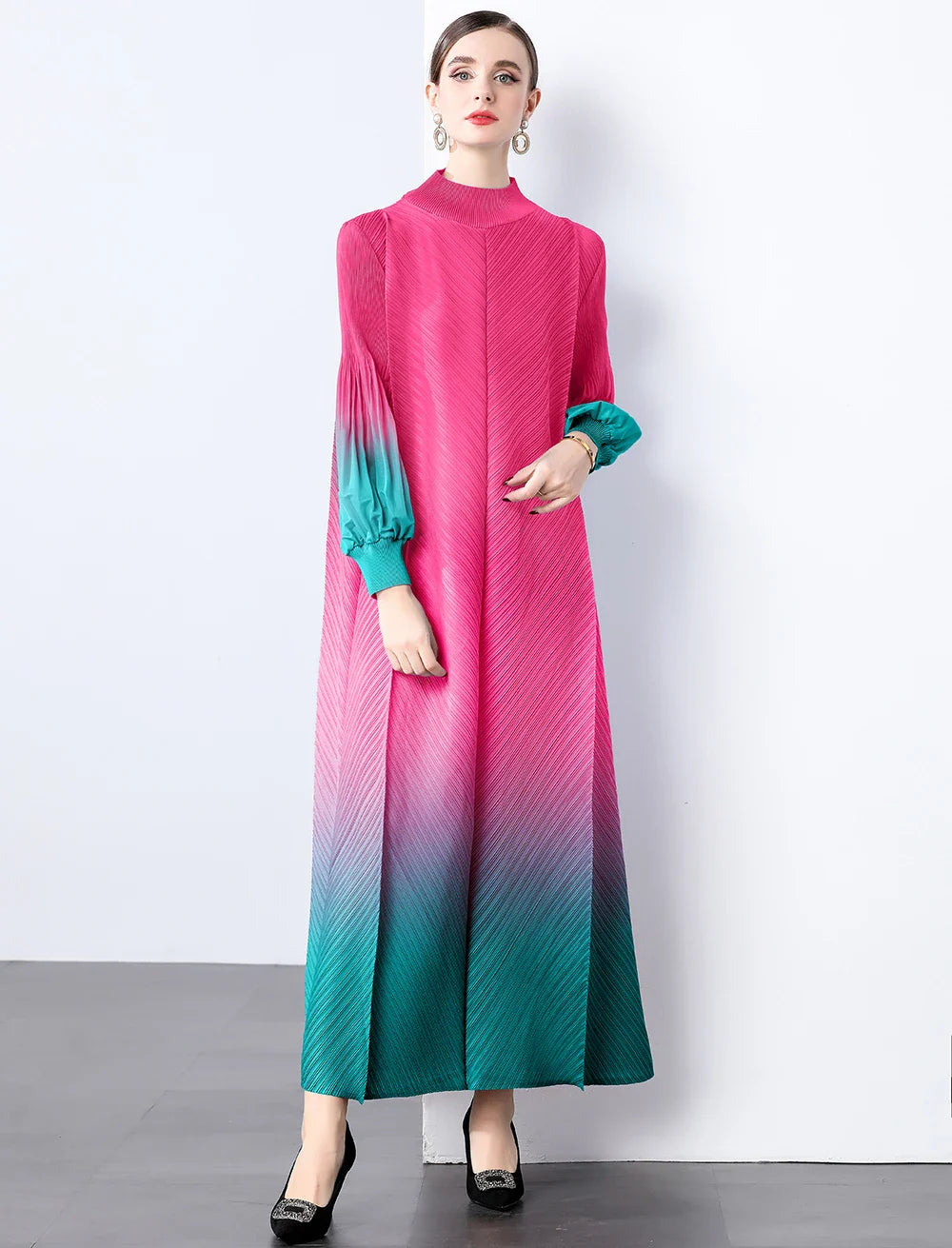 This Japanese designer dress blends comfort and beauty in one striking piece. With ombré plissé texture and long cuffed sleeves, it moves easily and feels light on the body.