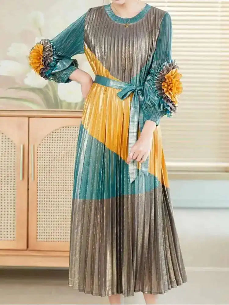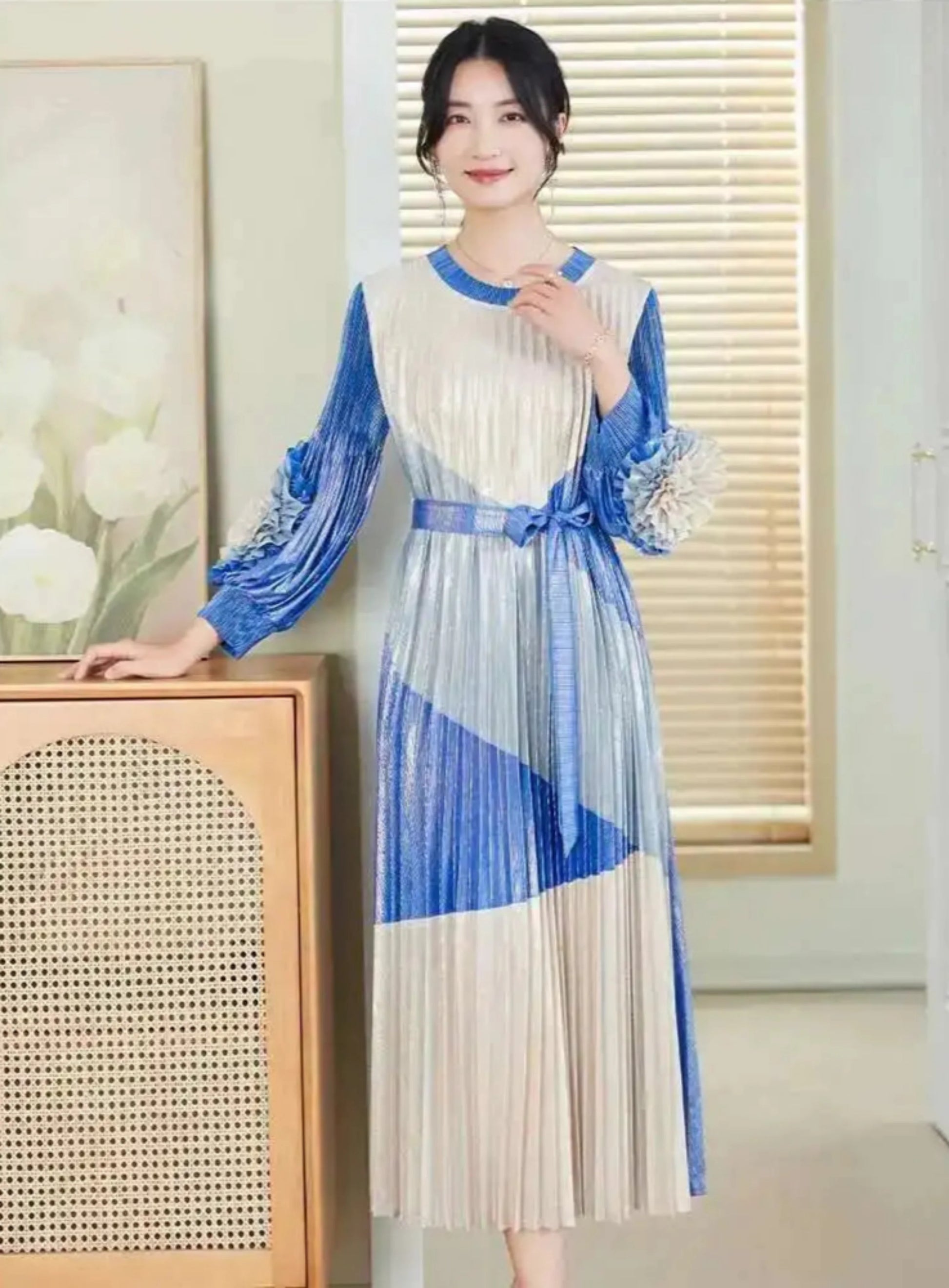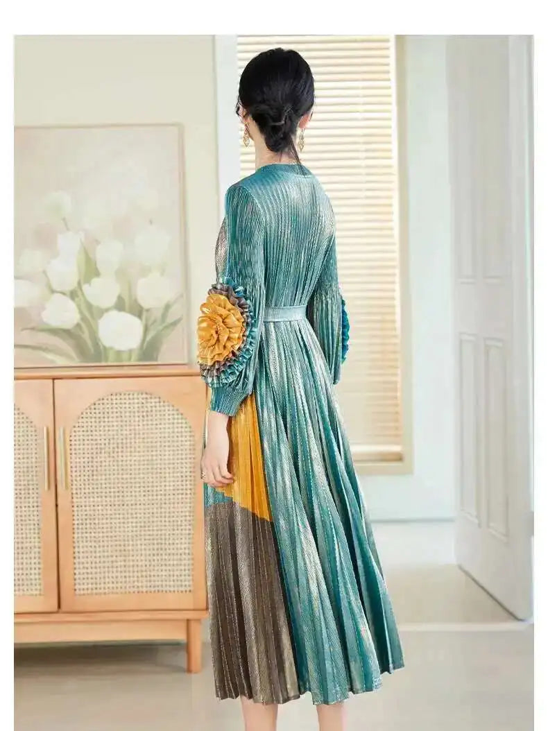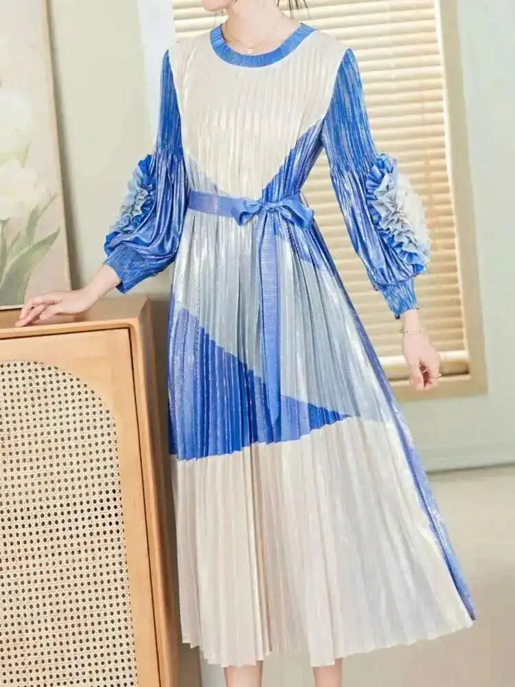 This elegant midi dress is made from premium Japanese pleated plissé fabric with a soft, stretchy, and wrinkle-free finish. It features long sleeves with sculpted 3D floral ruffles, a clean O-neckline, and a flattering midi length.