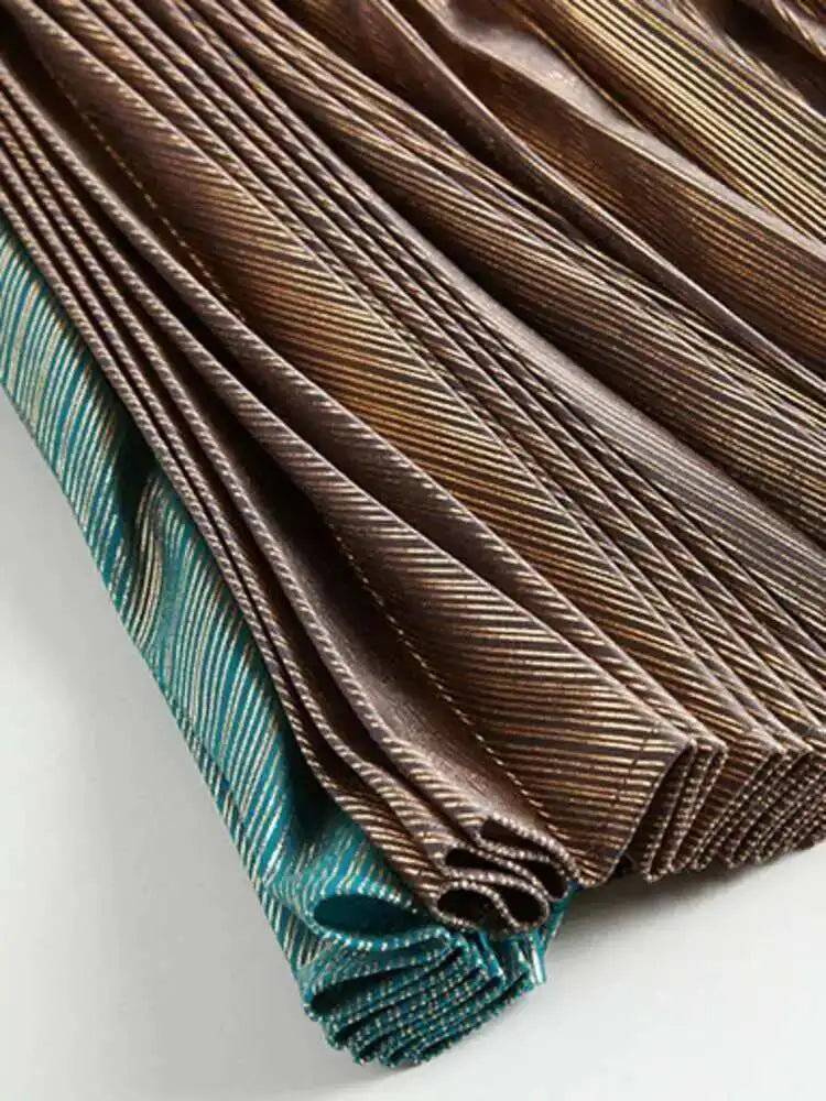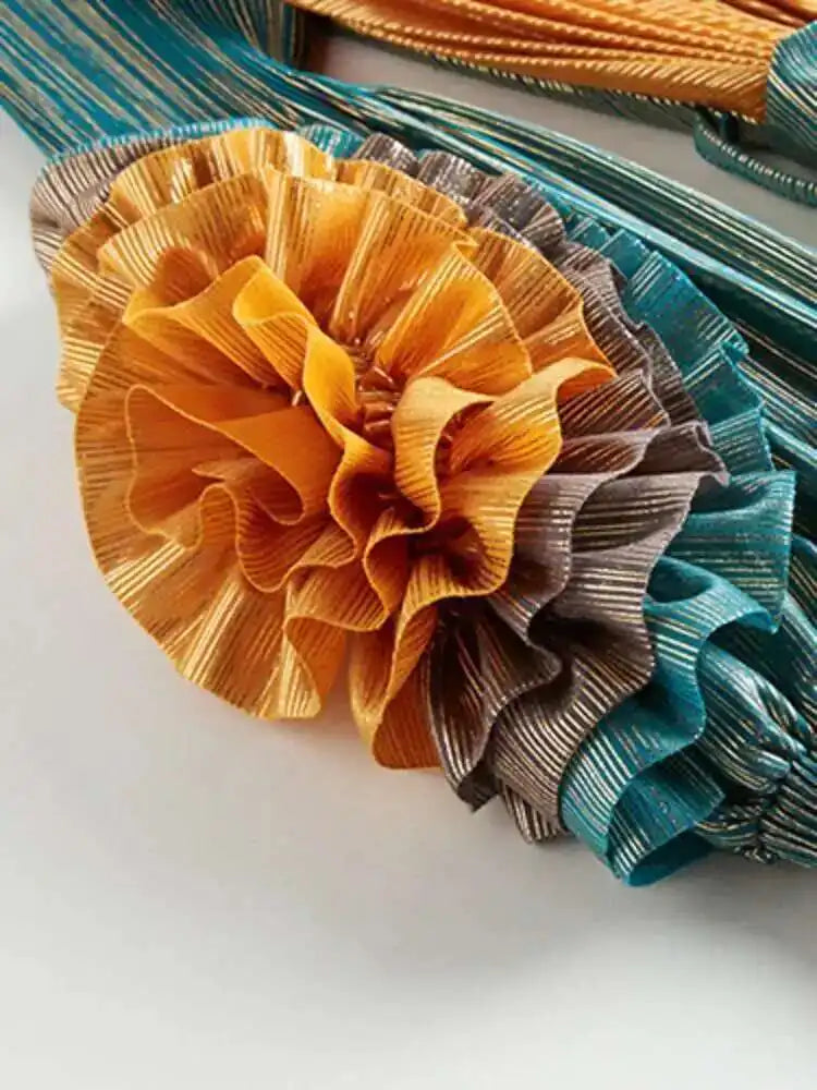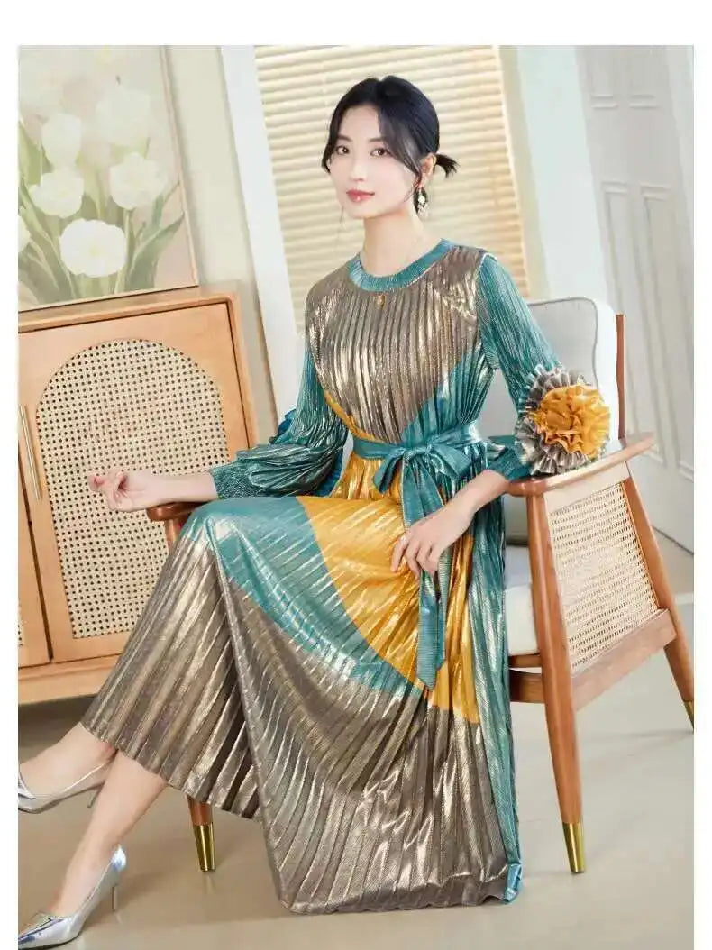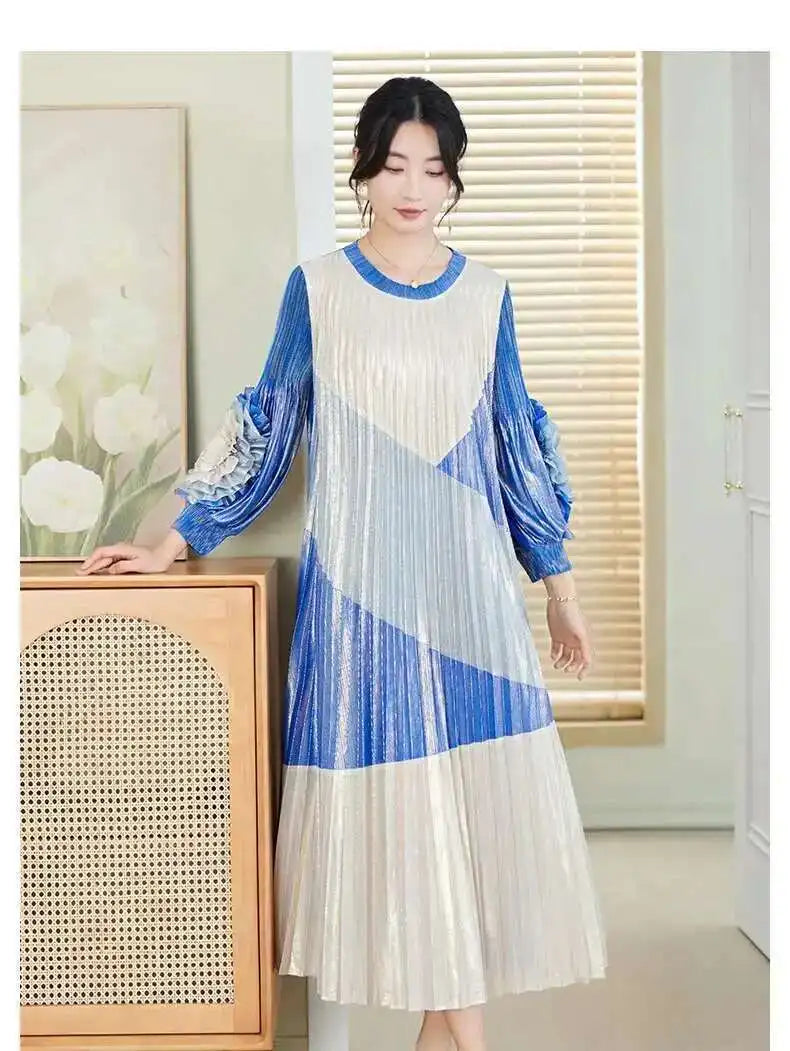 This elegant midi dress is made from premium Japanese pleated plissé fabric with a soft, stretchy, and wrinkle-free finish. It features long sleeves with sculpted 3D floral ruffles, a clean O-neckline, and a flattering midi length.