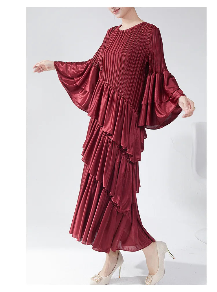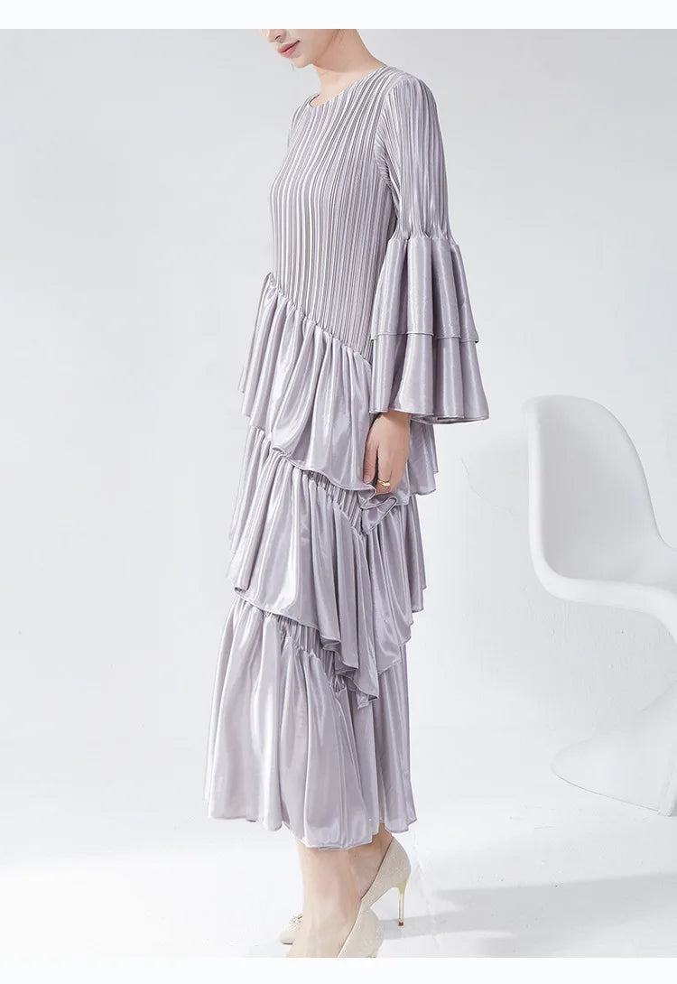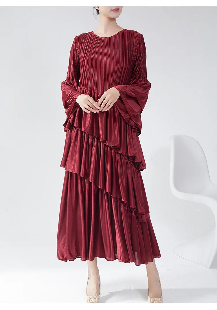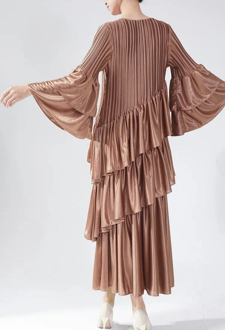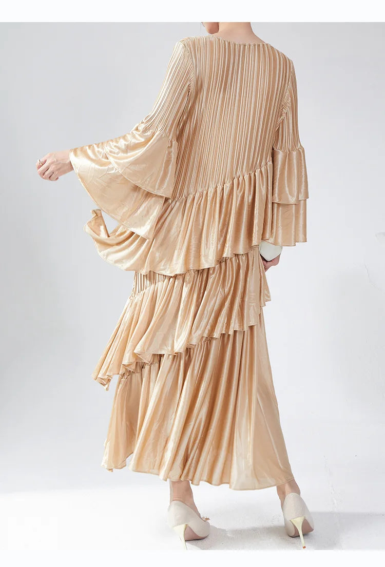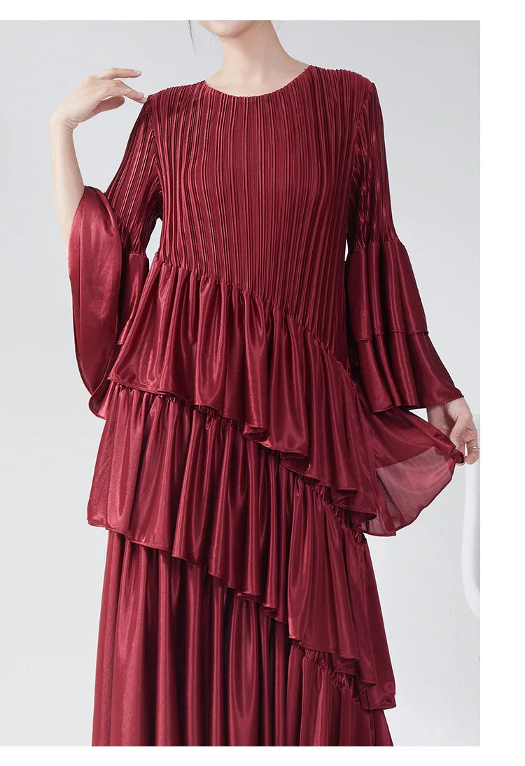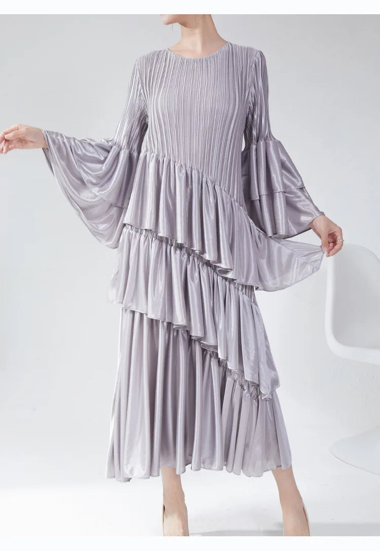 Move with grace in this dramatic midi dress, featuring flowing Japanese plissé pleats and bold ruffles that sweep across the sleeves and body. Designed for moments that demand presence, its stretchy, wrinkle-free fabric offers a blend of luxury and comfort, making it perfect for standout events and elegant evenings.