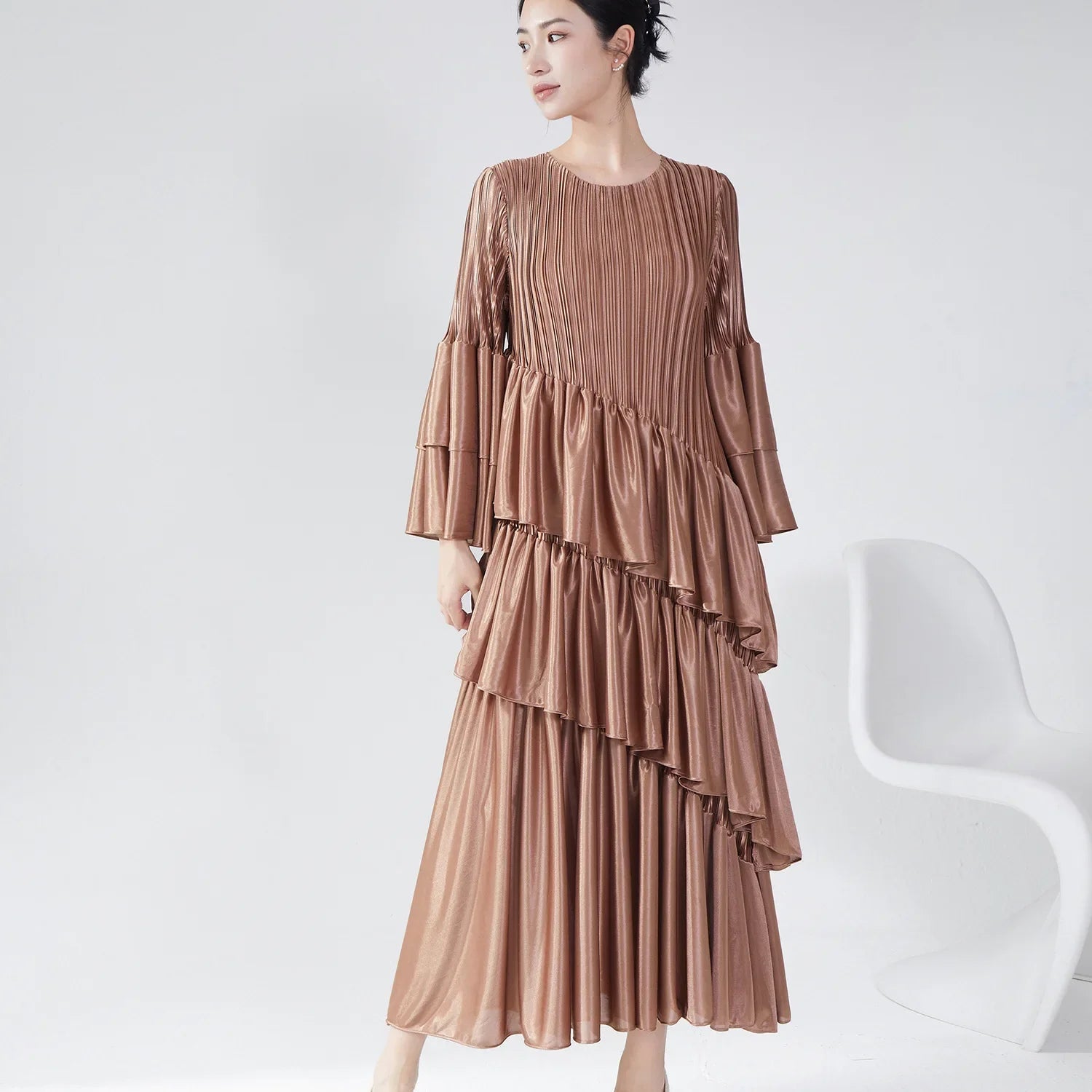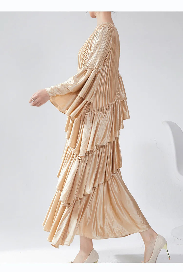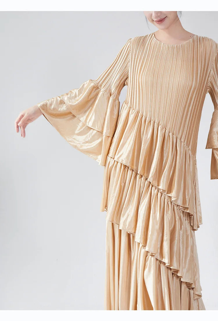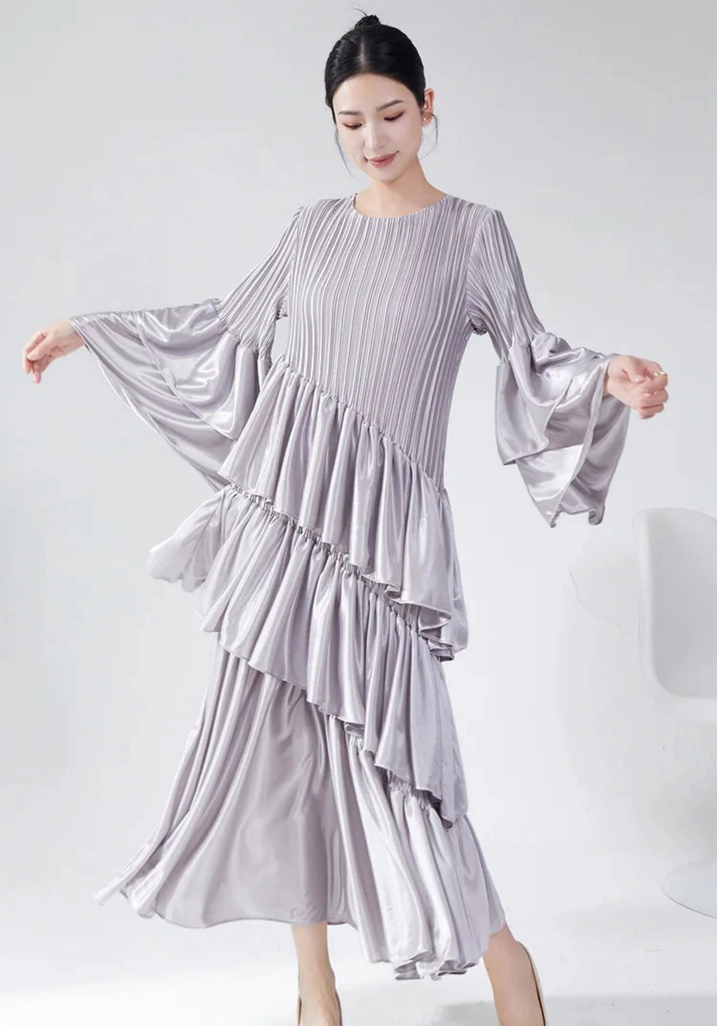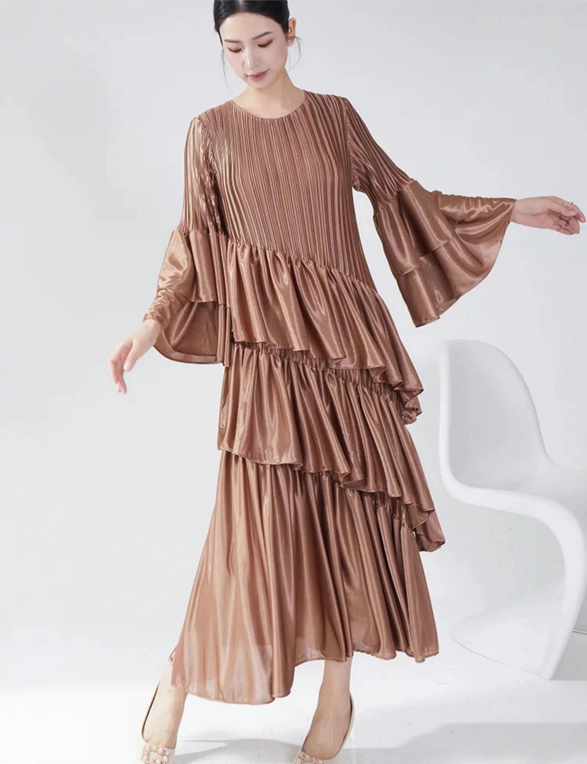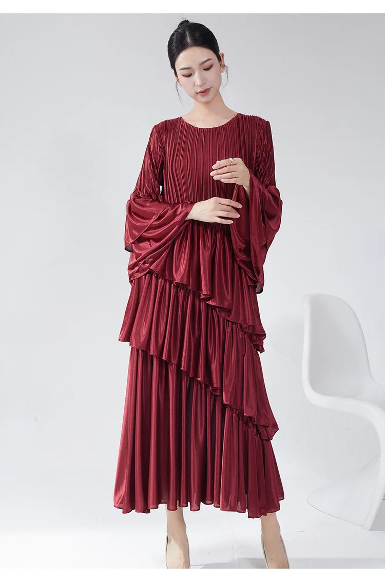 Move with grace in this dramatic midi dress, featuring flowing Japanese plissé pleats and bold ruffles that sweep across the sleeves and body. Designed for moments that demand presence, its stretchy, wrinkle-free fabric offers a blend of luxury and comfort, making it perfect for standout events and elegant evenings.