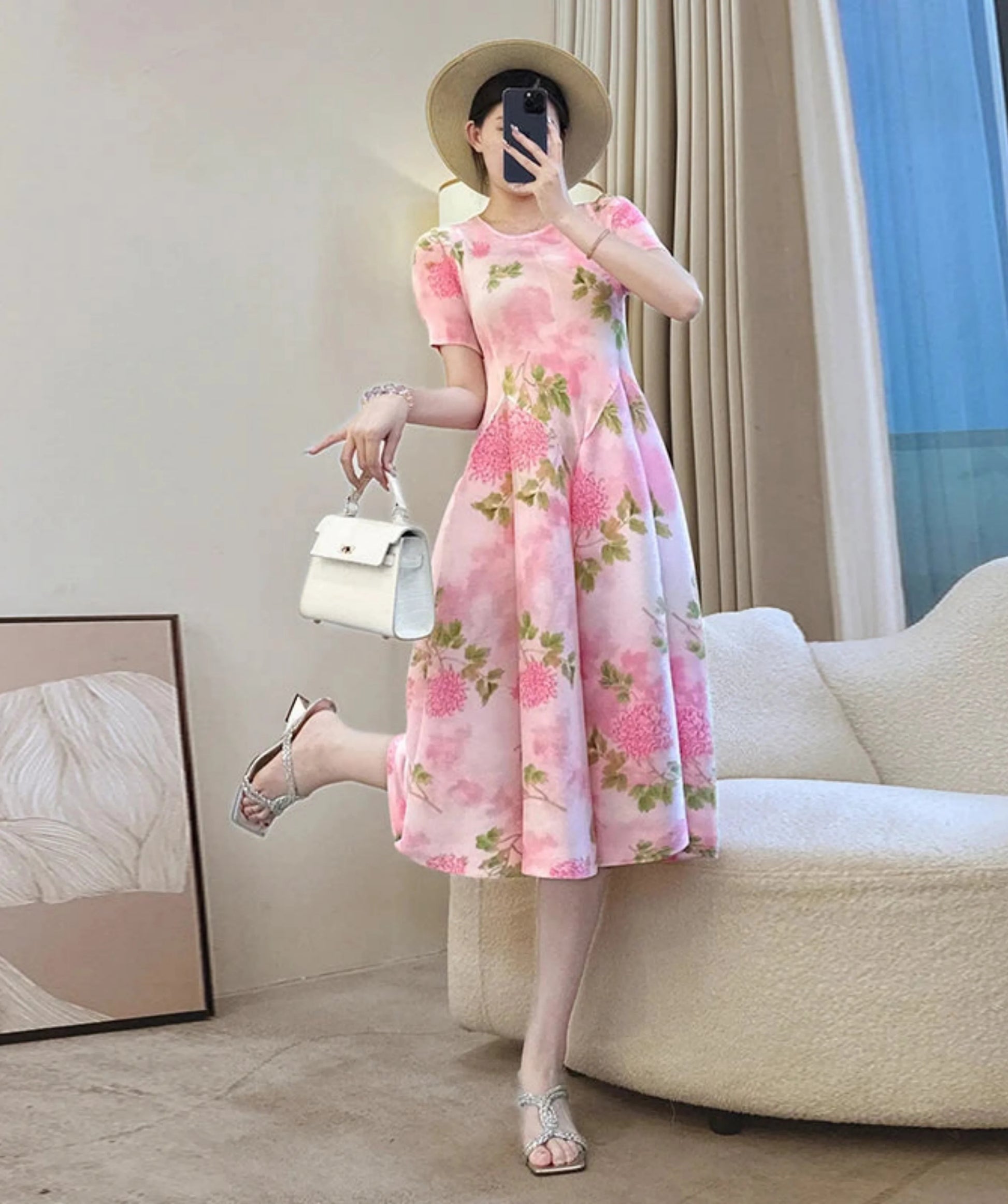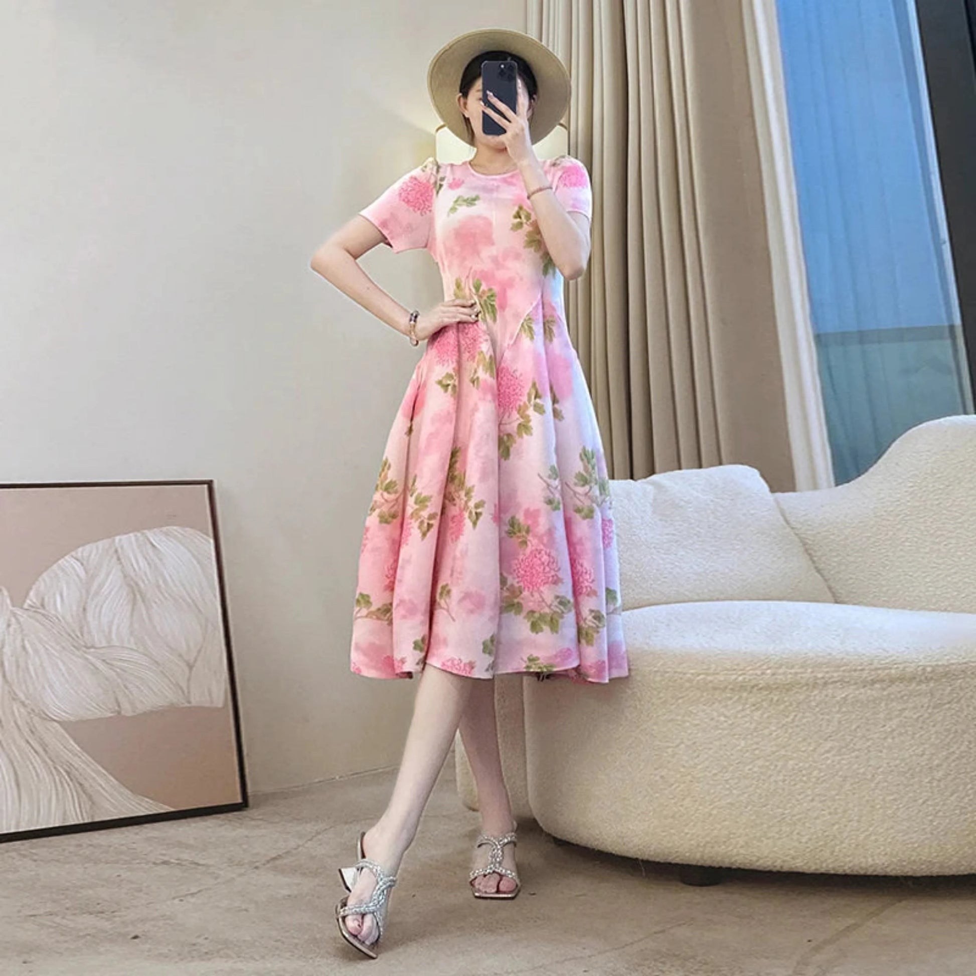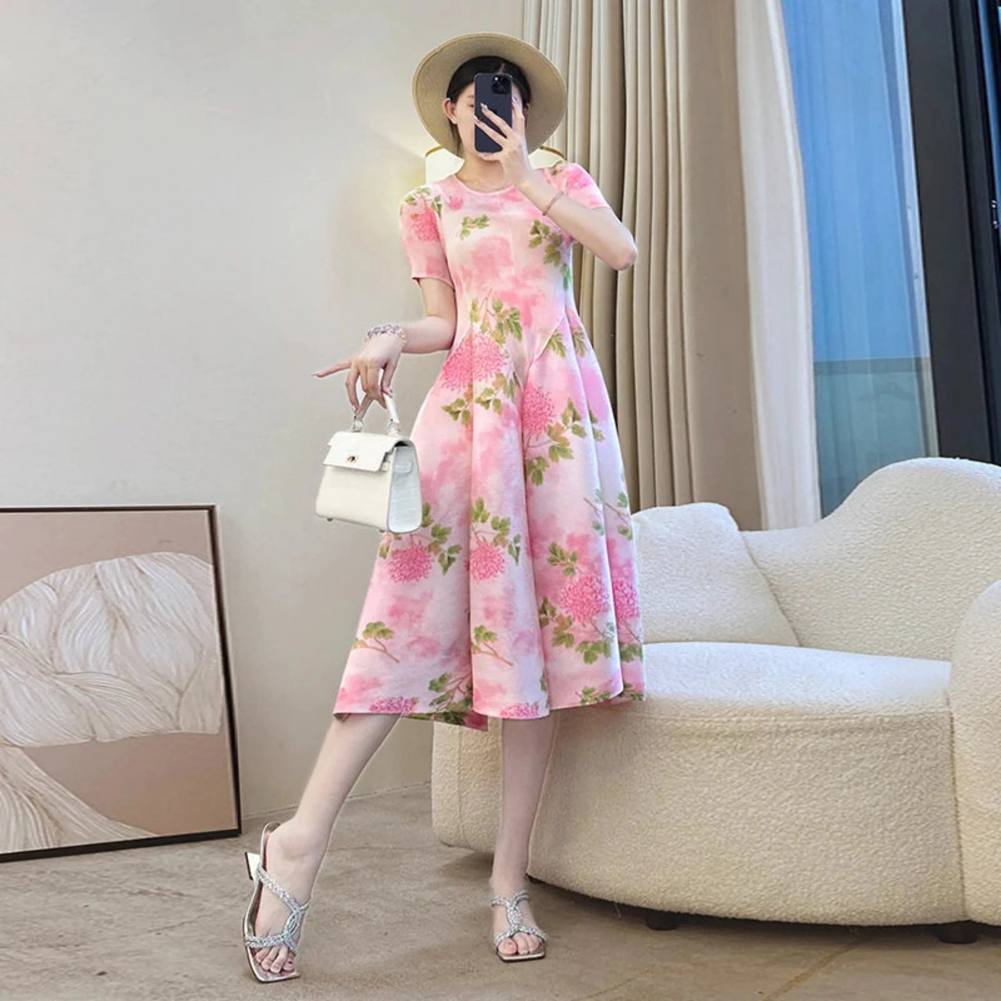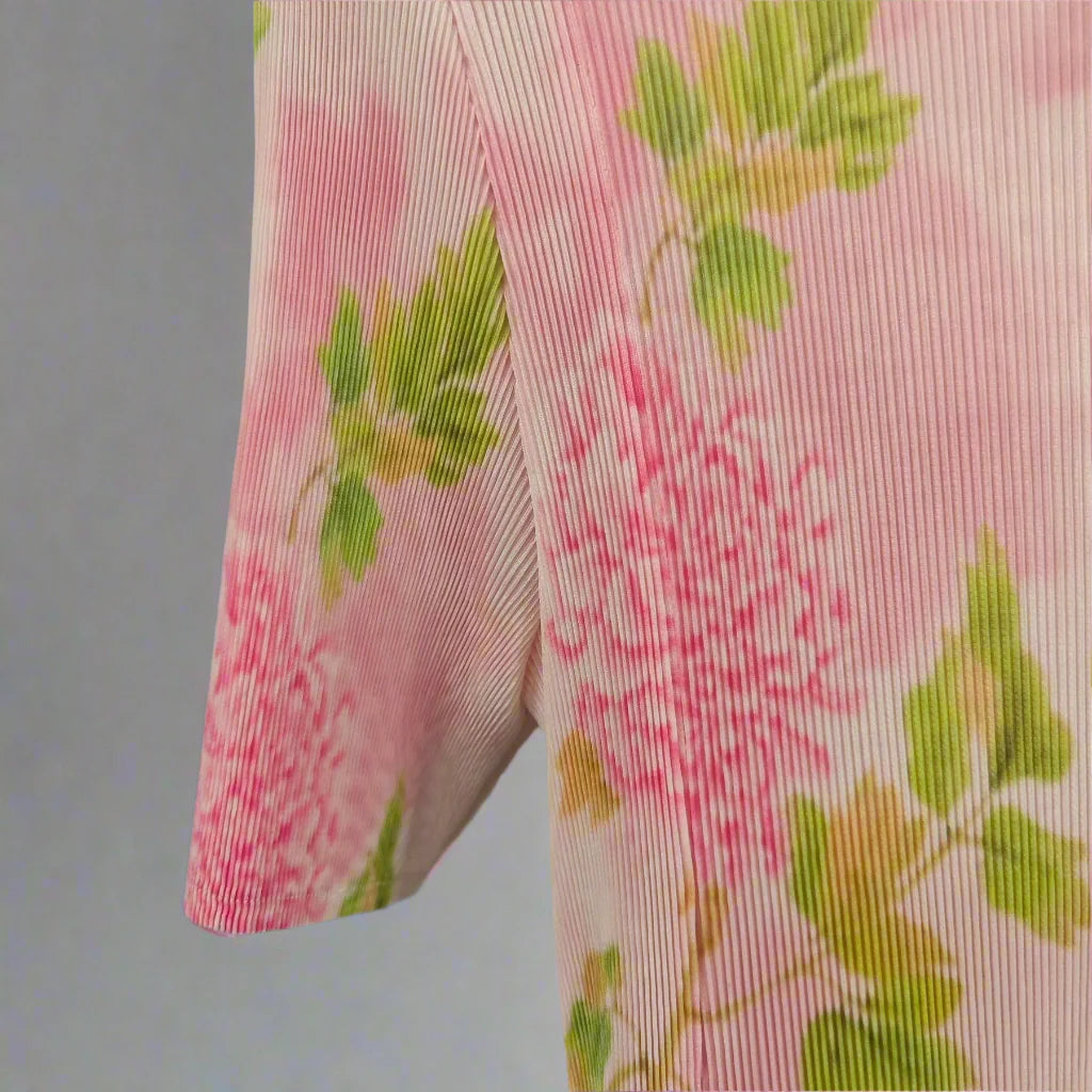 This short-sleeve dress showcases premium Japanese plissé fabric adorned with delicate pink floral patterns. The stretchy material offers a comfortable fit, while the elegant silhouette and luxurious texture create a refined look perfect for any occasion.