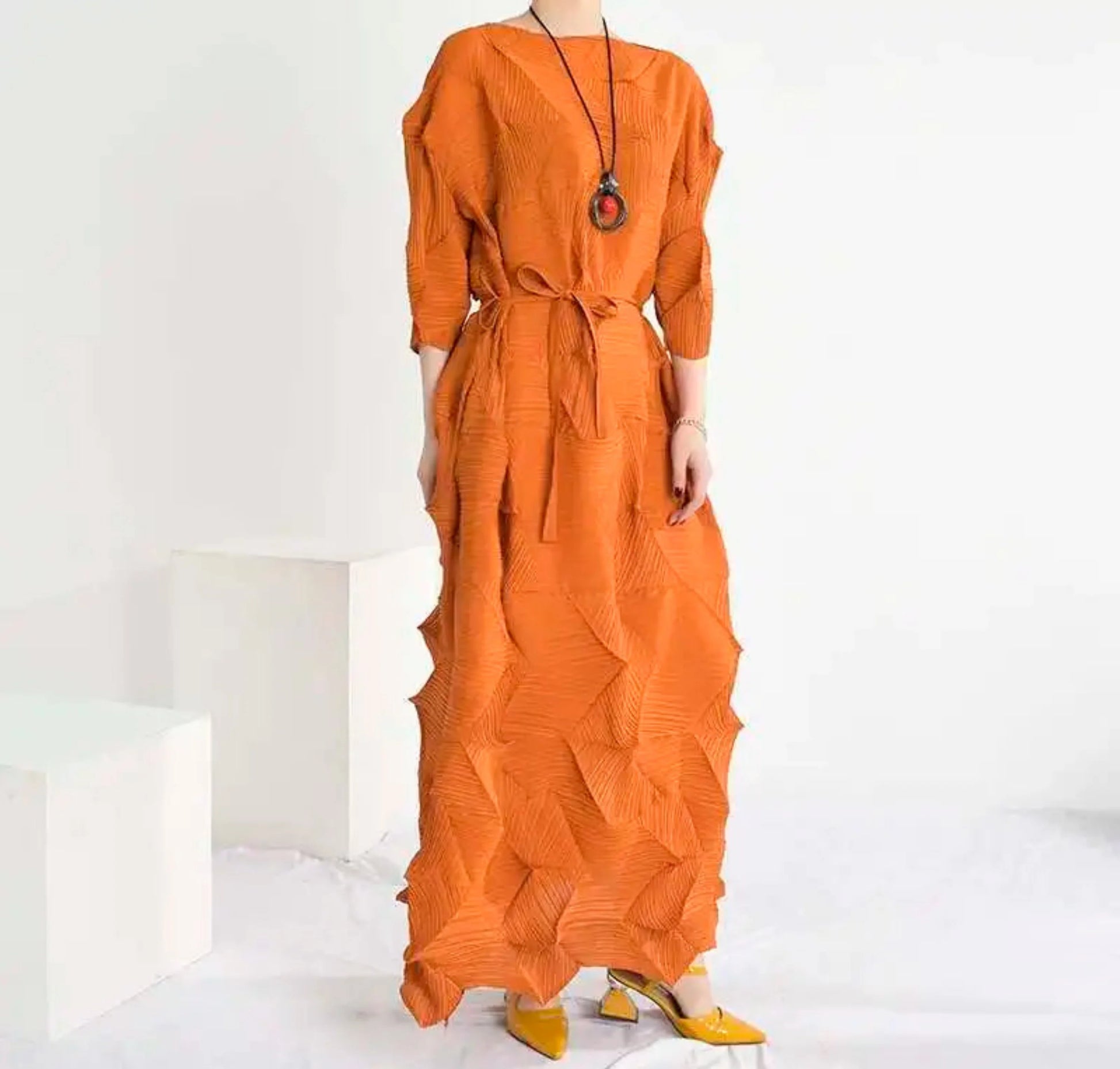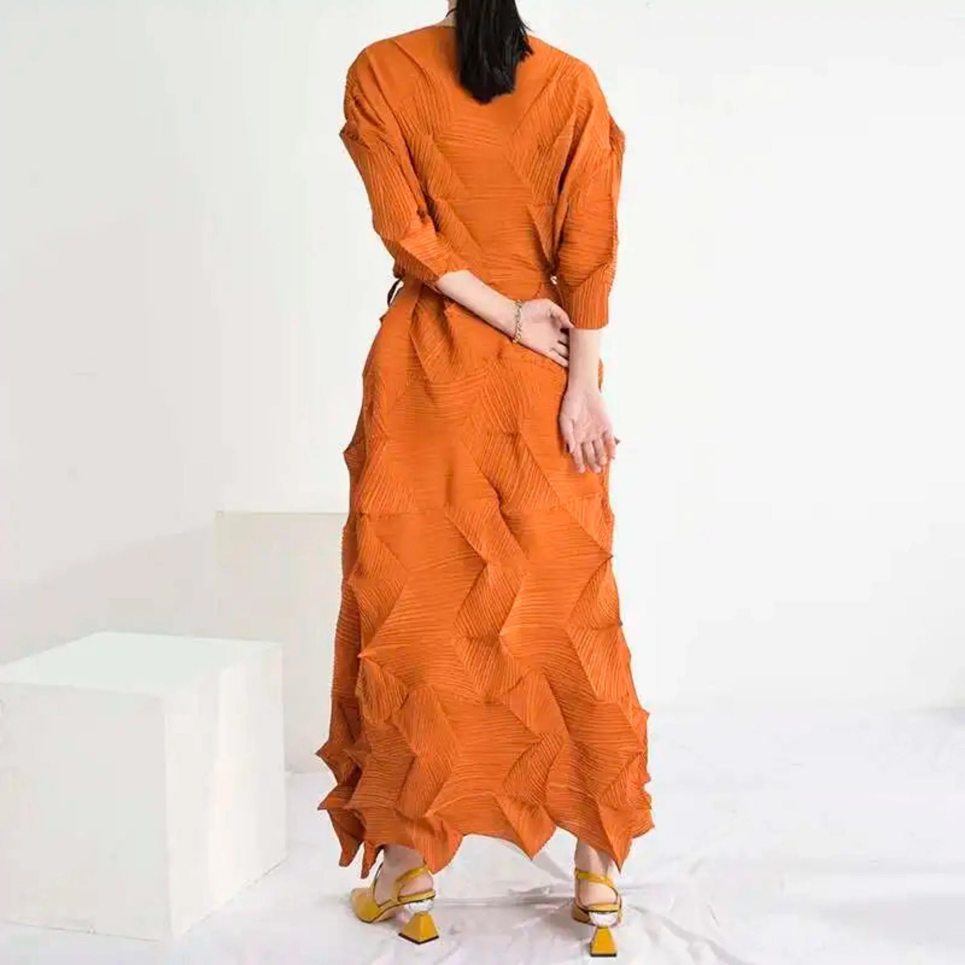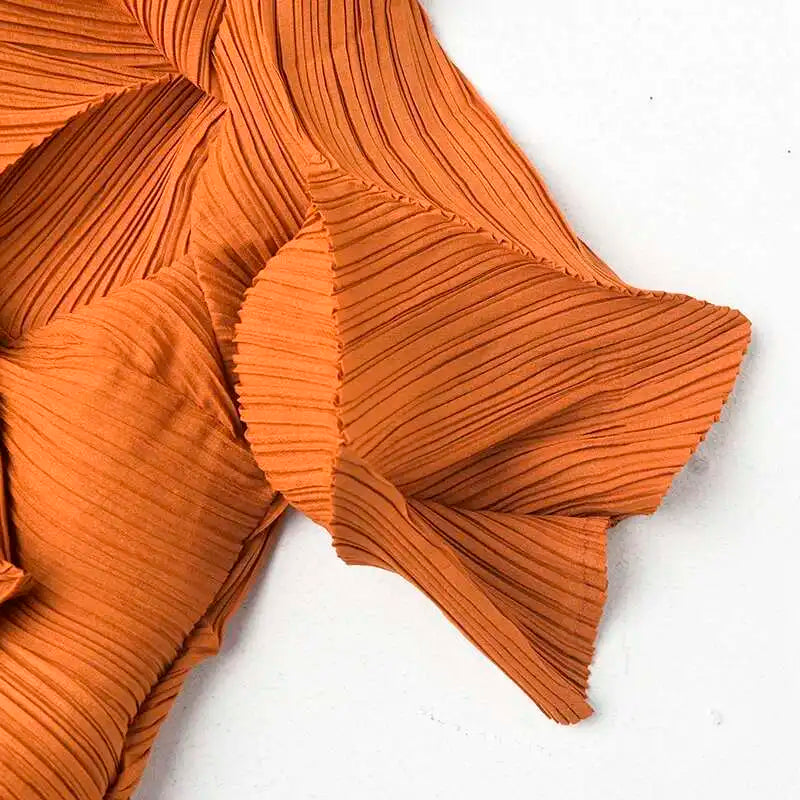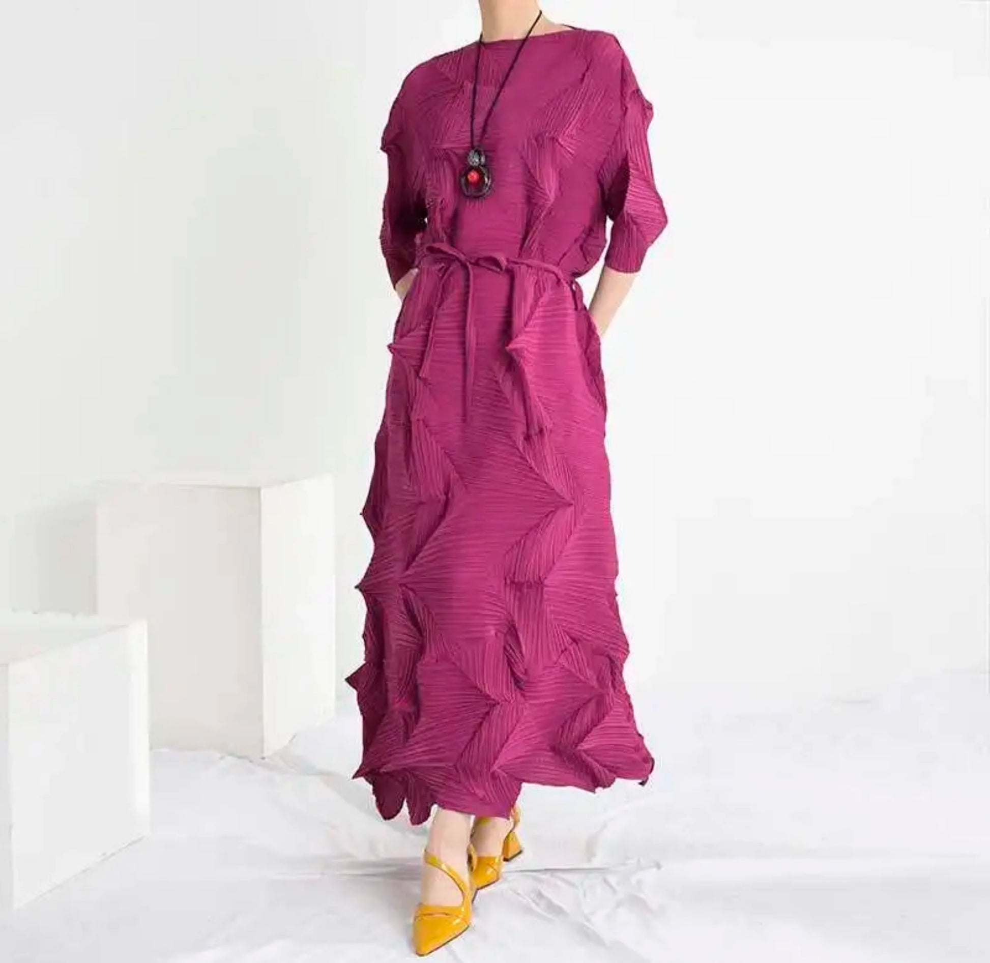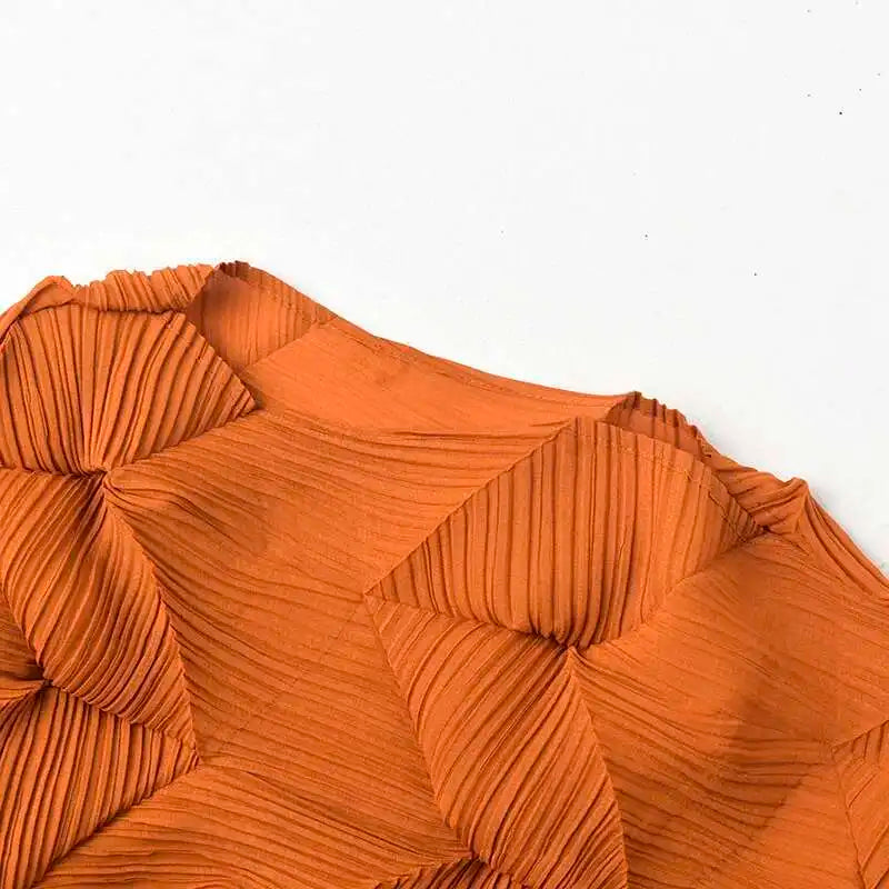 The dimensional pleats and mid-length cut make it a statement for casual or dressy occasions.