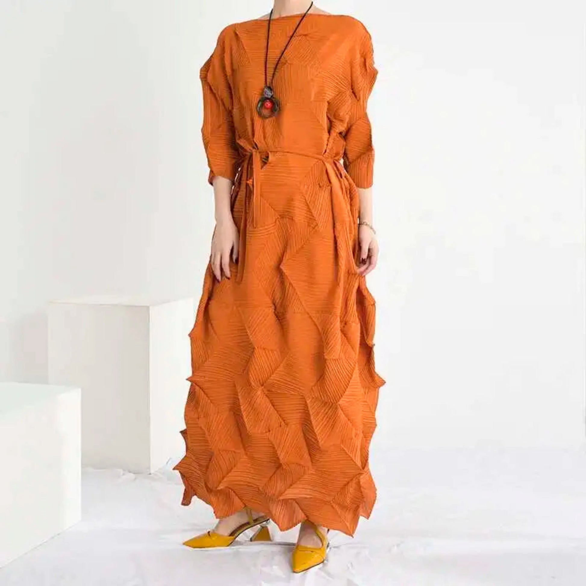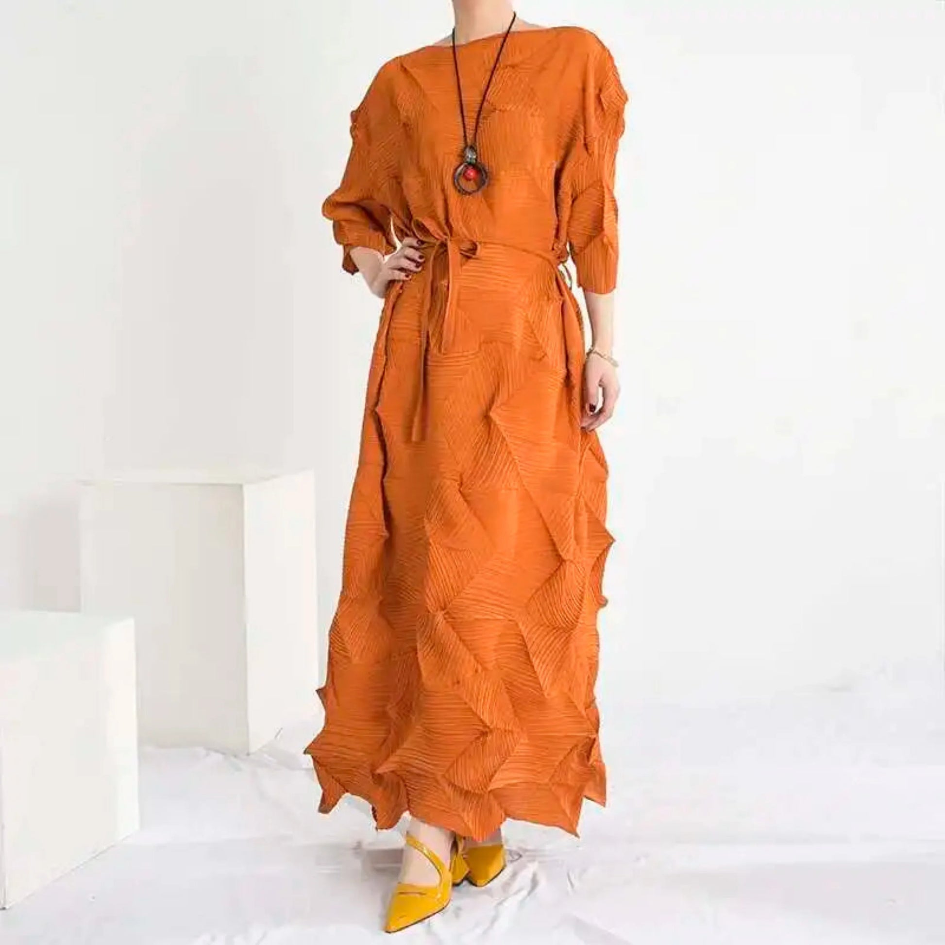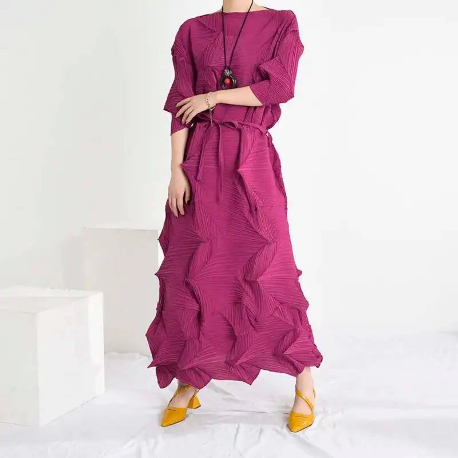 The dimensional pleats and mid-length cut make it a statement for casual or dressy occasions.