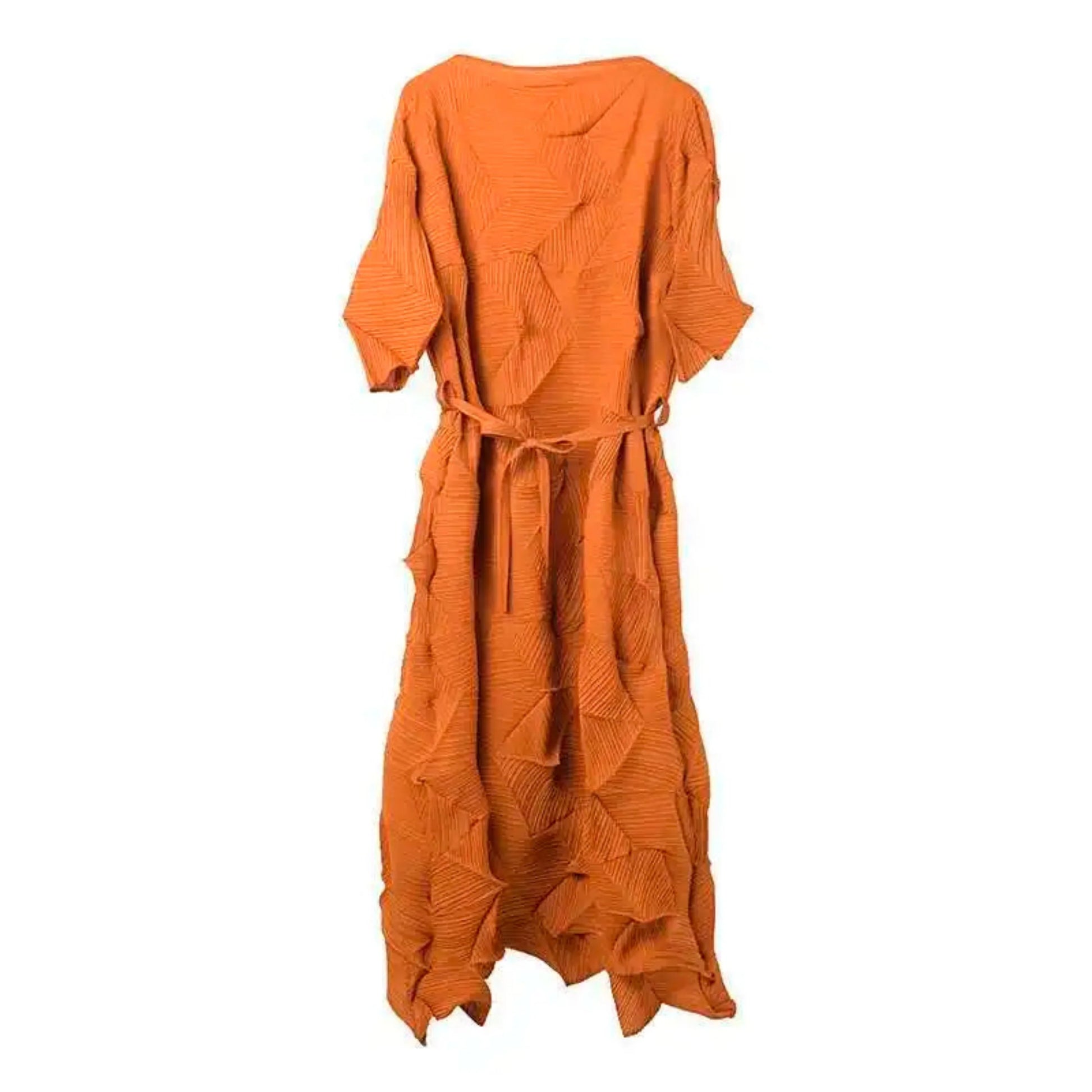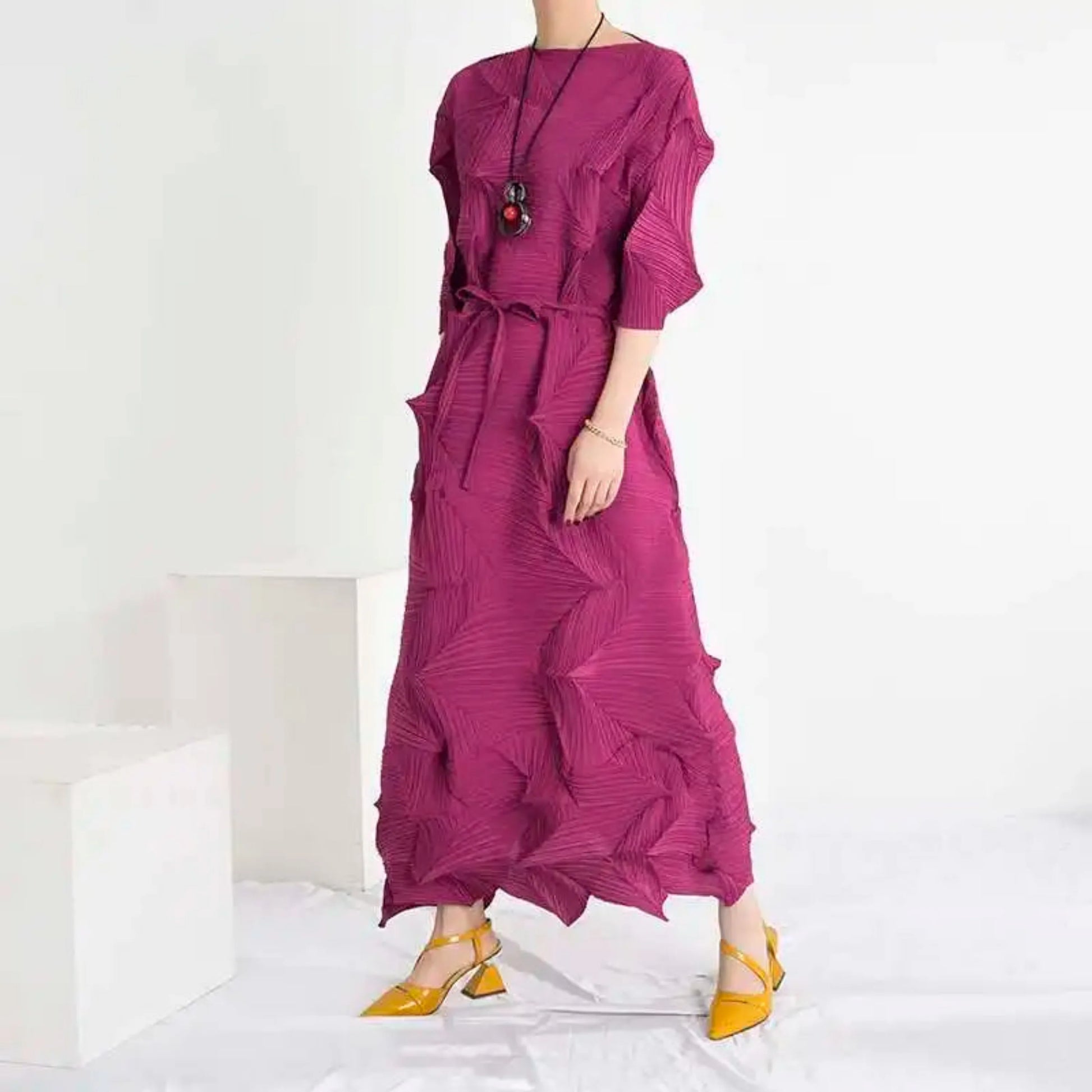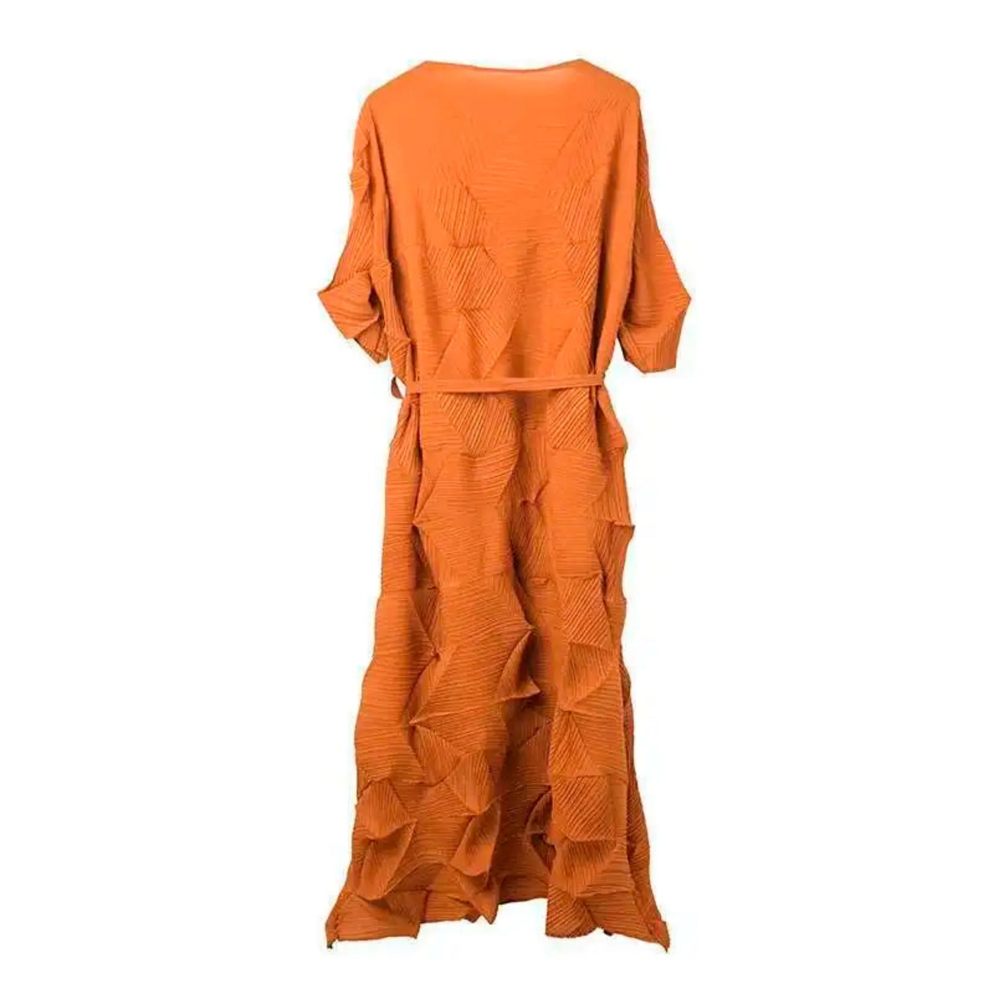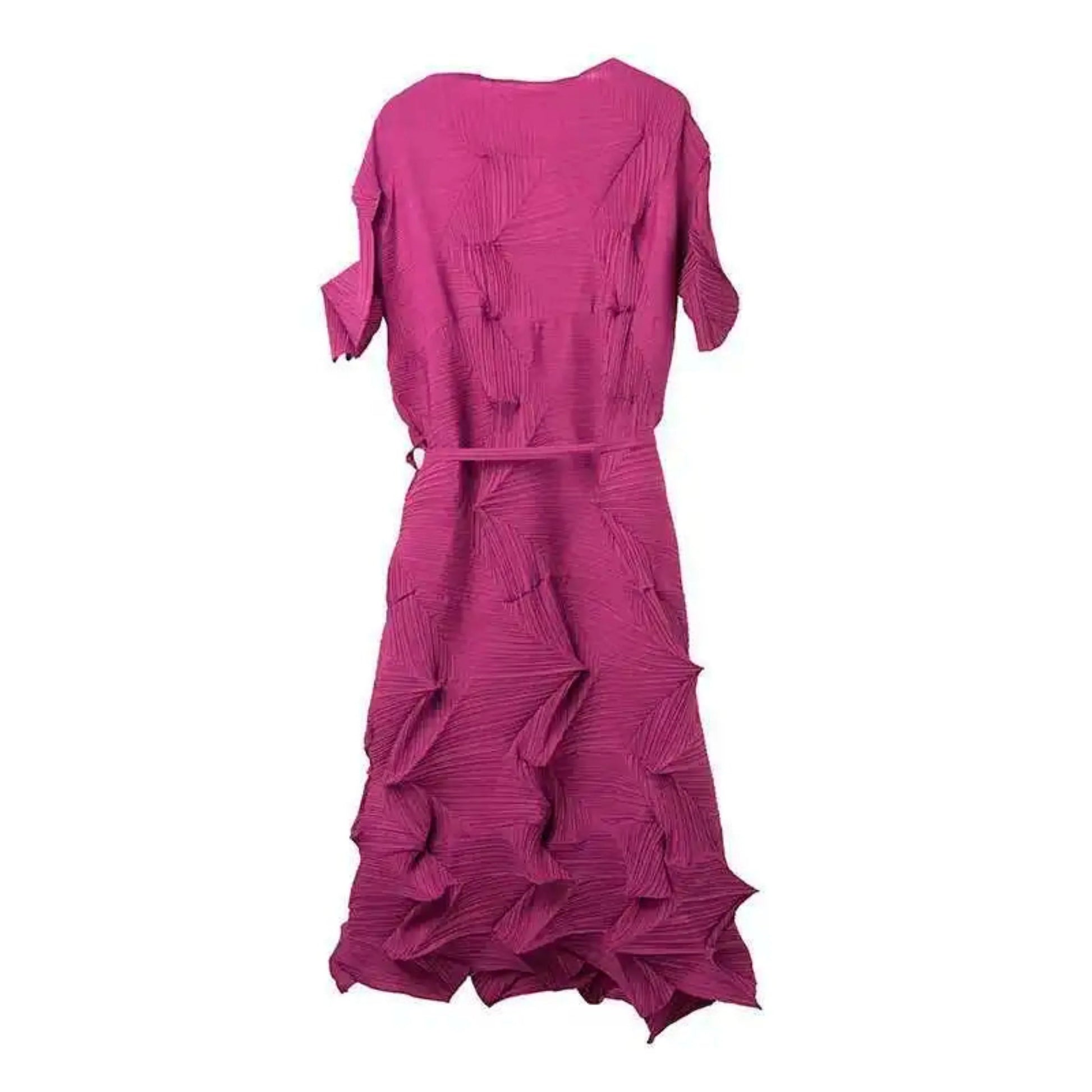 The dimensional pleats and mid-length cut make it a statement for casual or dressy occasions.