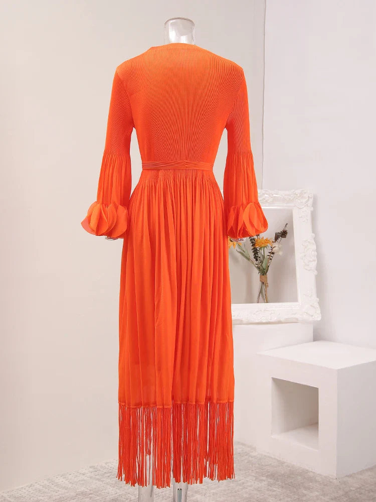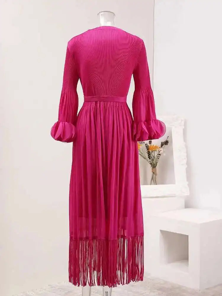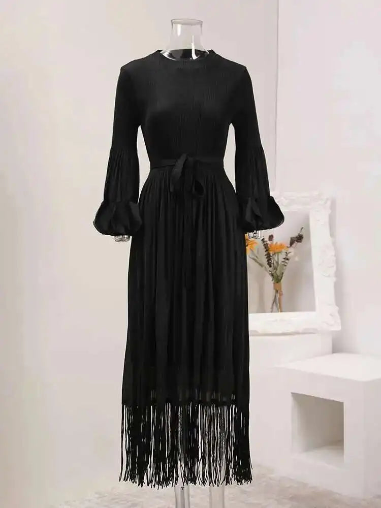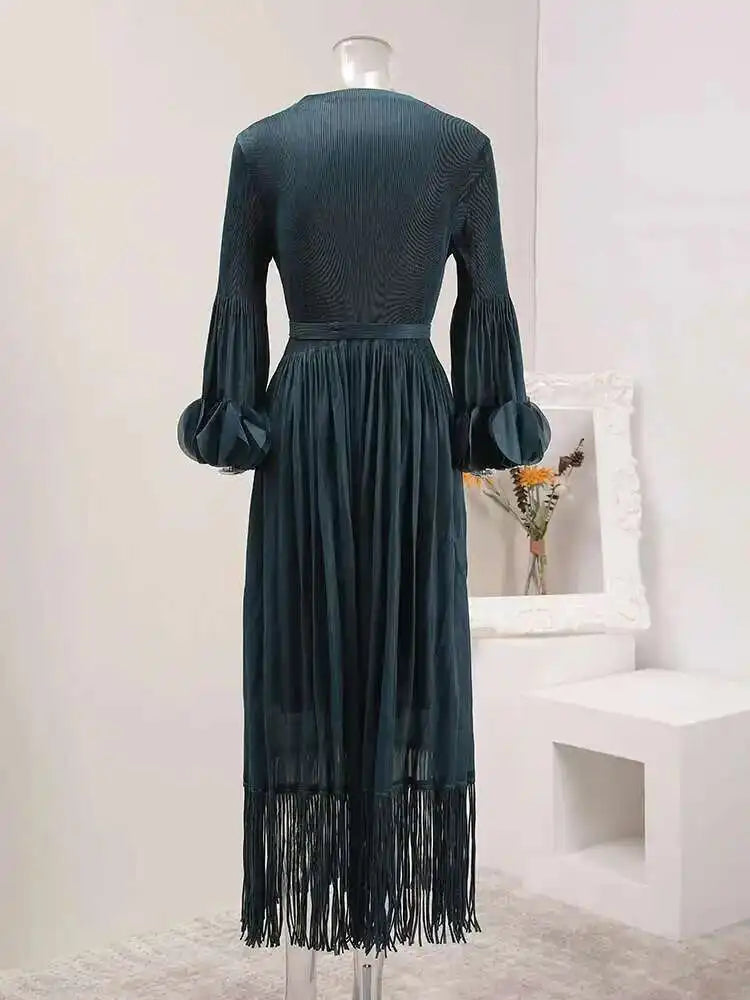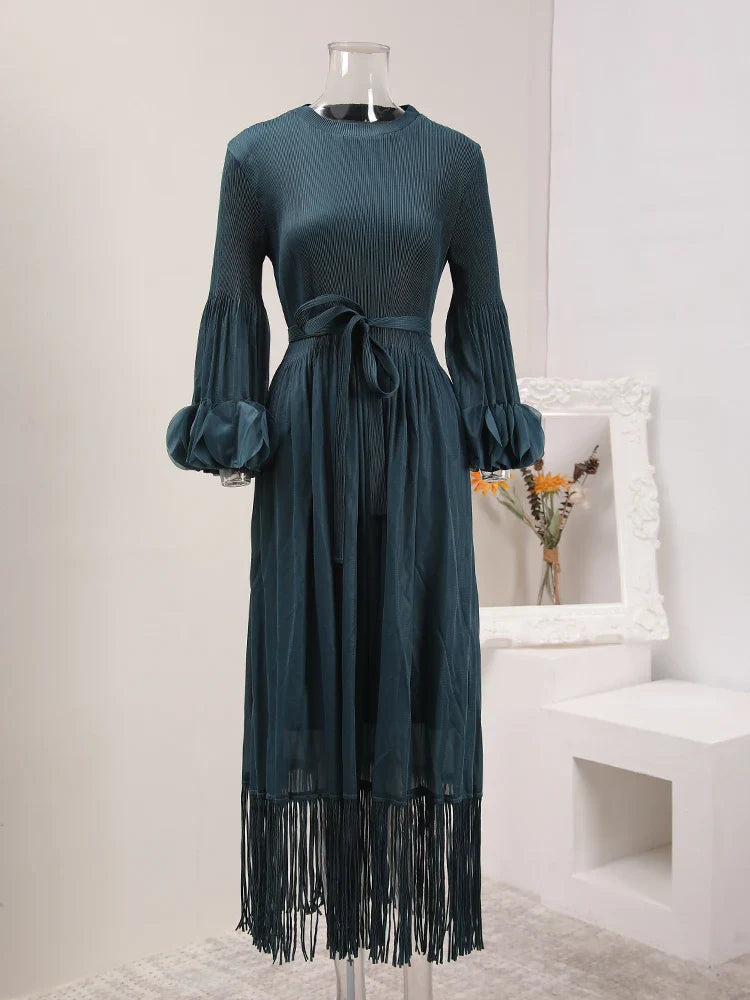 This sleek midi dress features premium Japanese plissé fabric, bubble cuff sleeves, and a fringe hem that adds movement and edge.