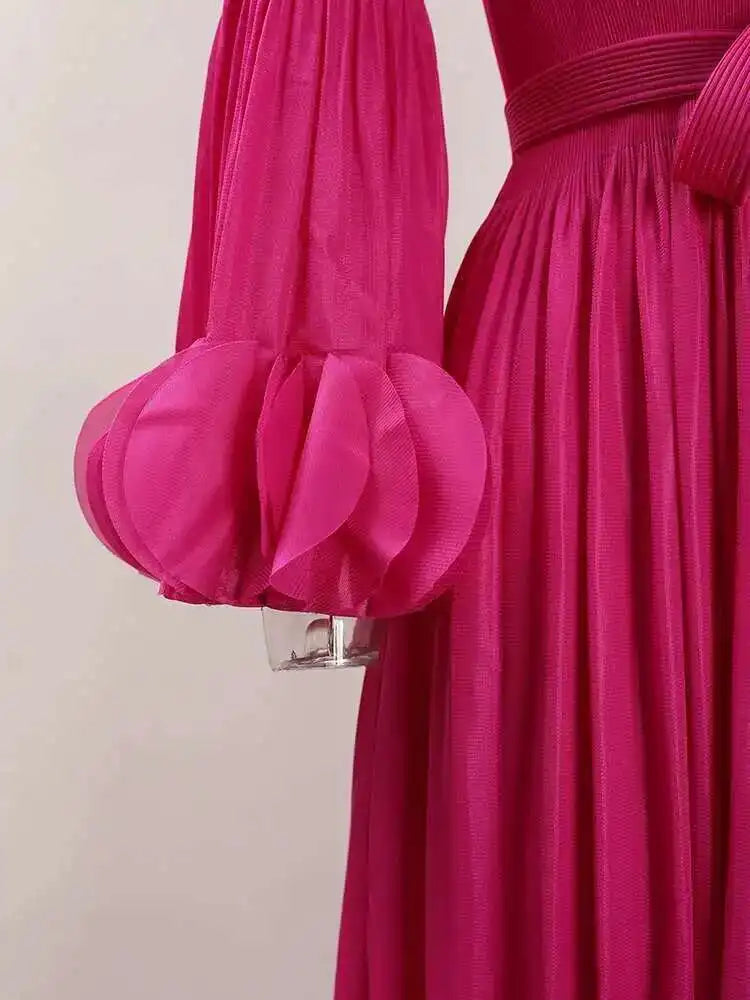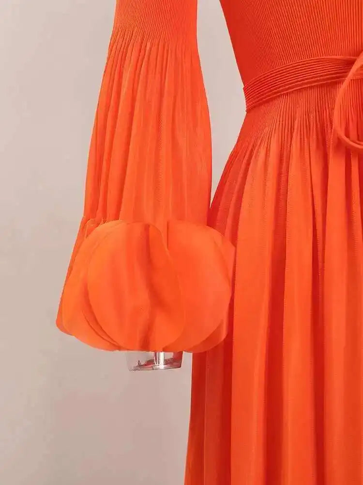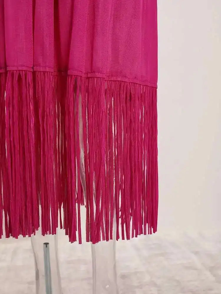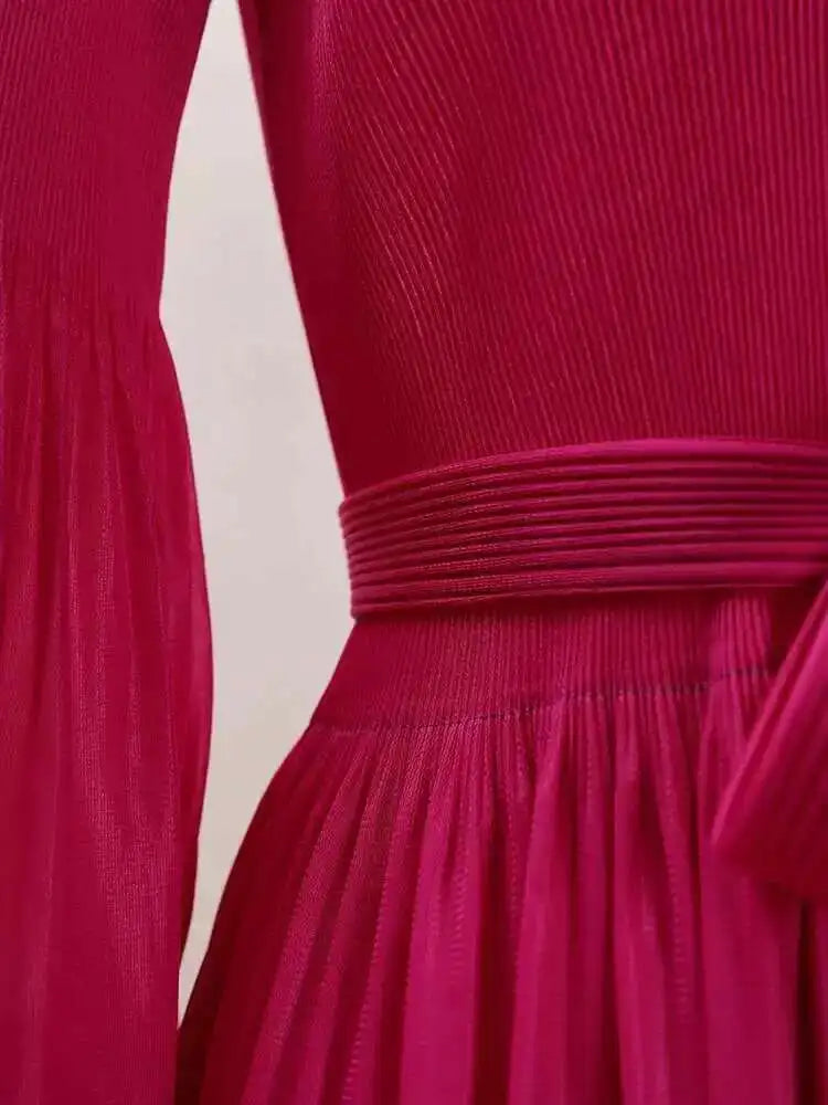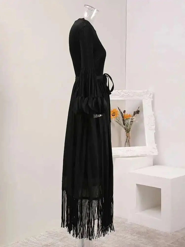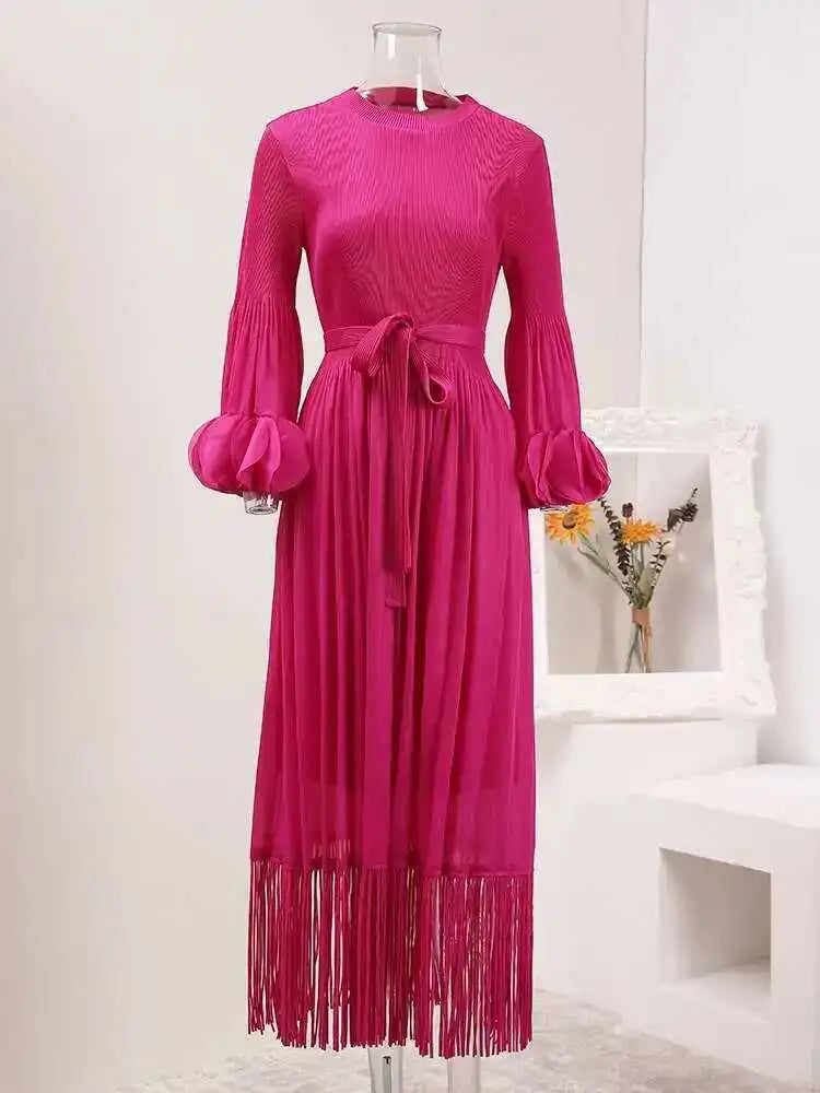 This sleek midi dress features premium Japanese plissé fabric, bubble cuff sleeves, and a fringe hem that adds movement and edge.