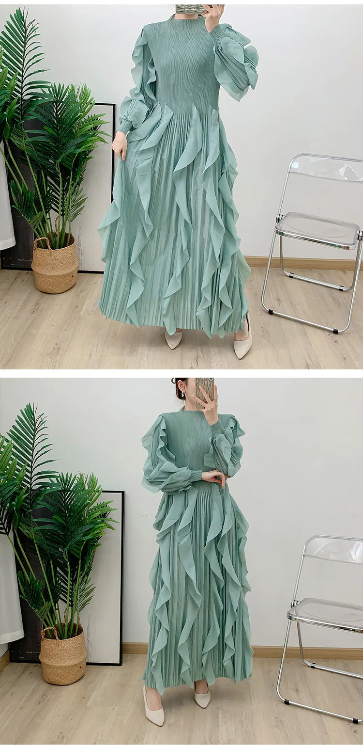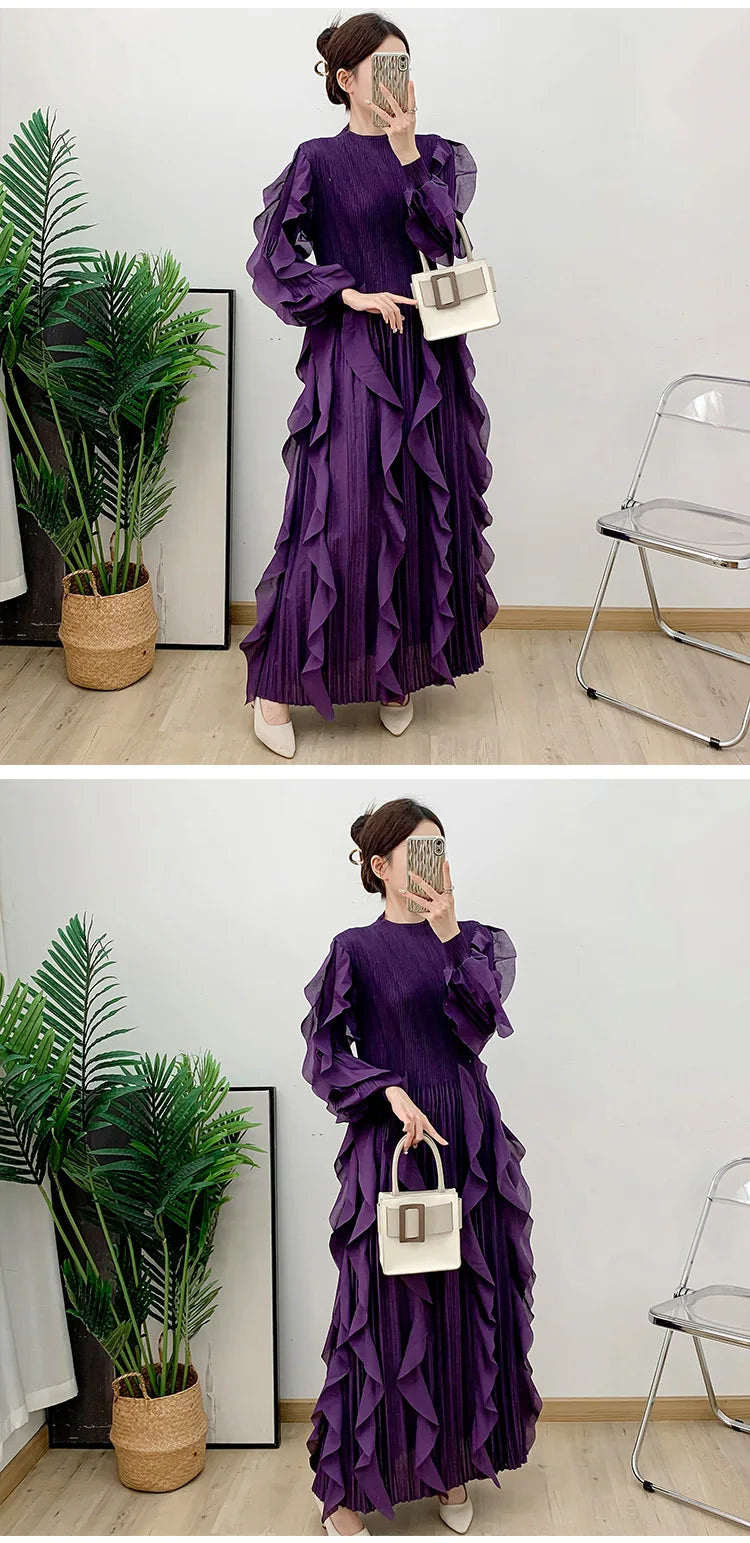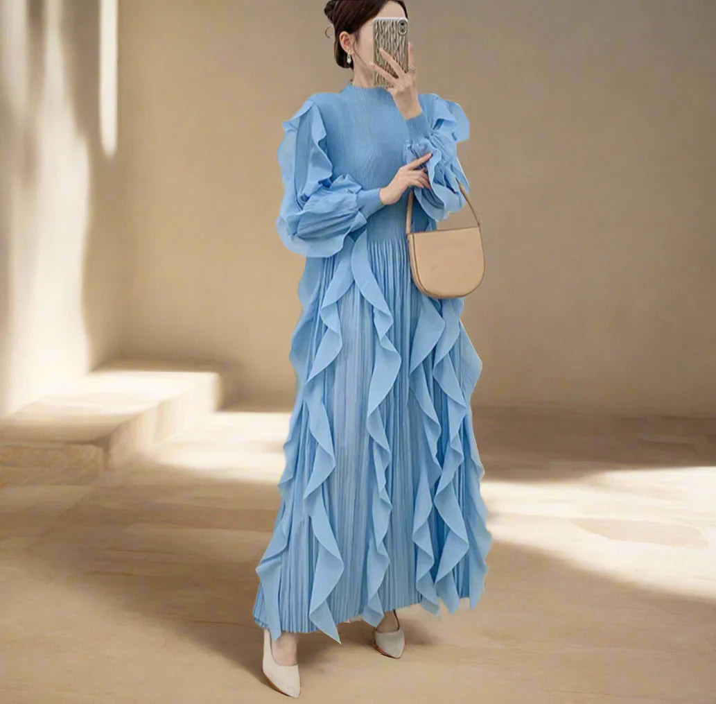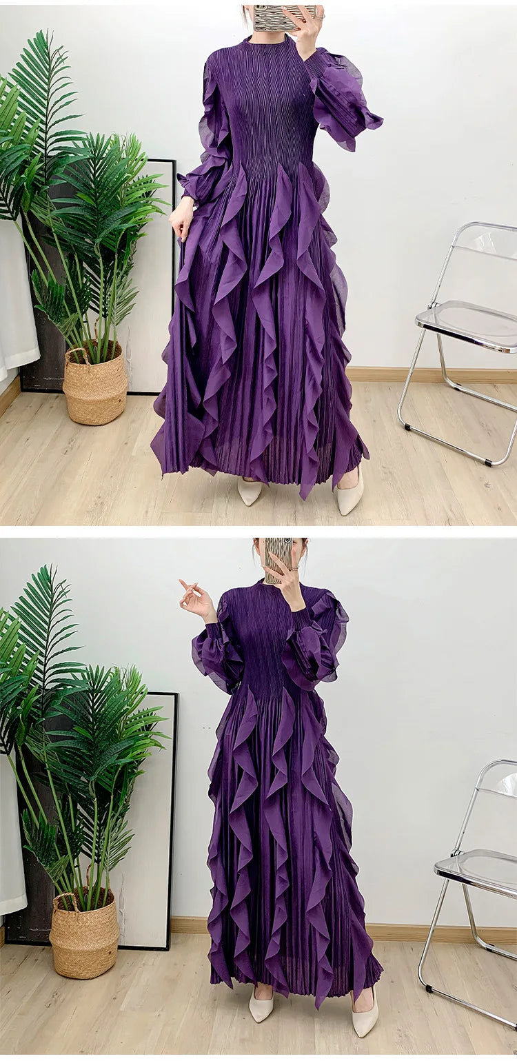This midi dress showcases Japanese pleats with layered ruffle detailing throughout for a unique, luxurious look.