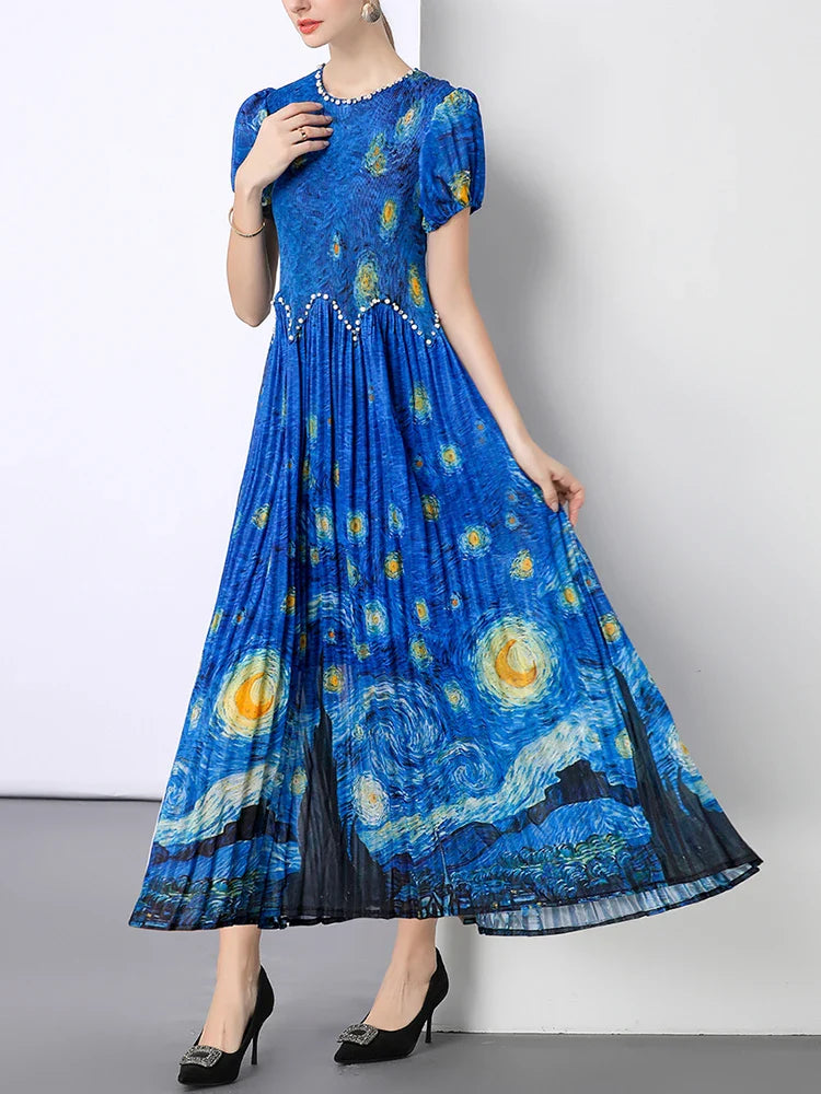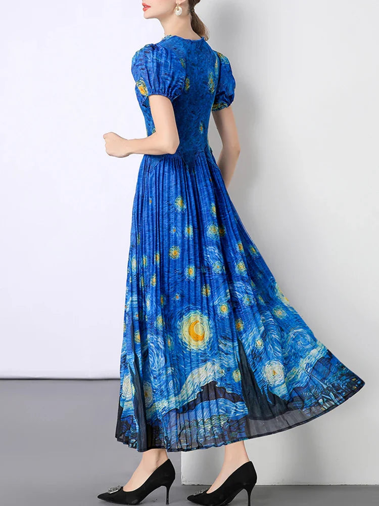 This midi dress is made from premium Japanese pleated plissé fabric with a soft, stretchy drape. It features short puff sleeves, a round neckline, and a flattering midi length.