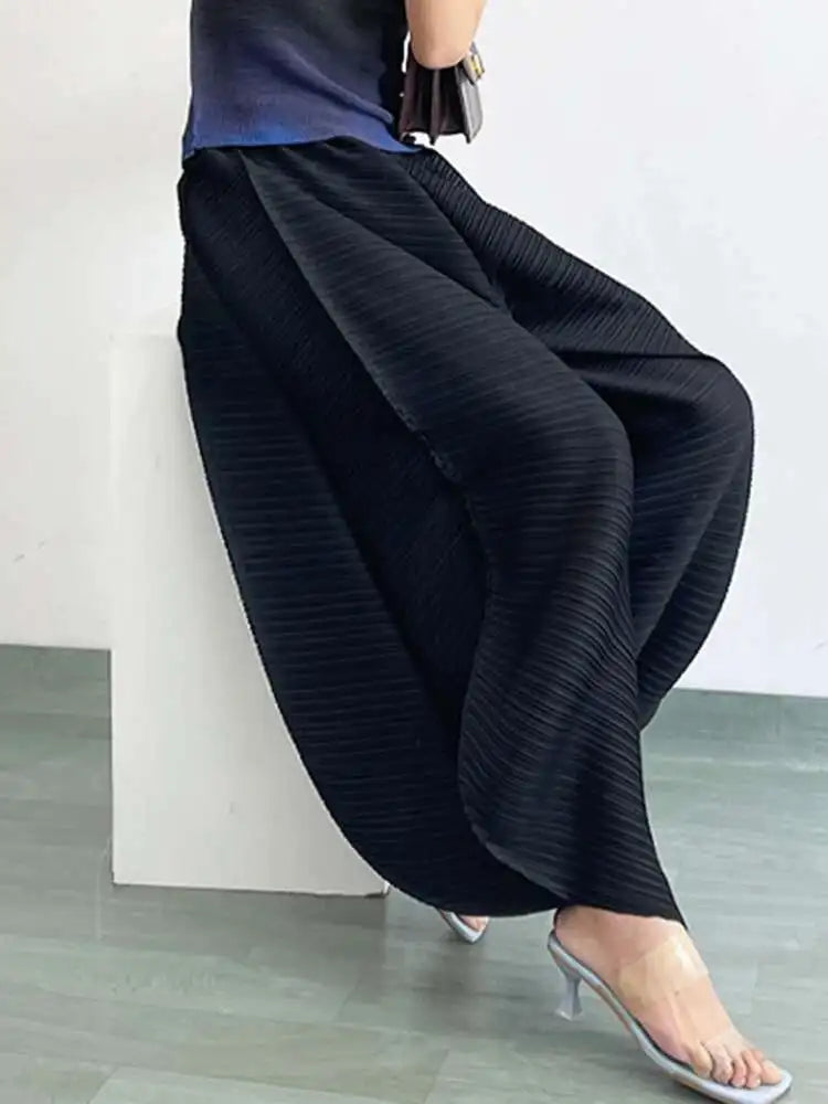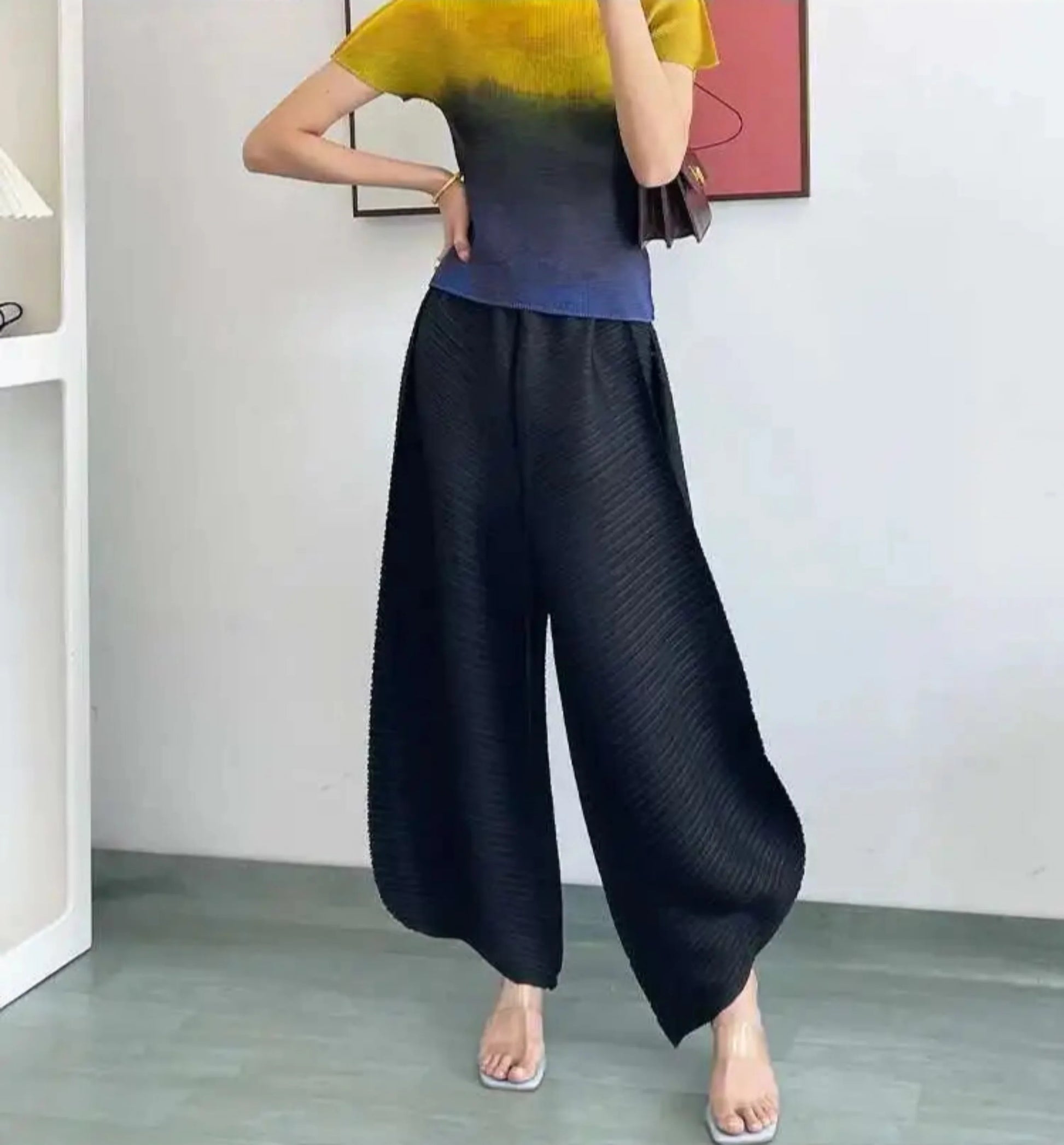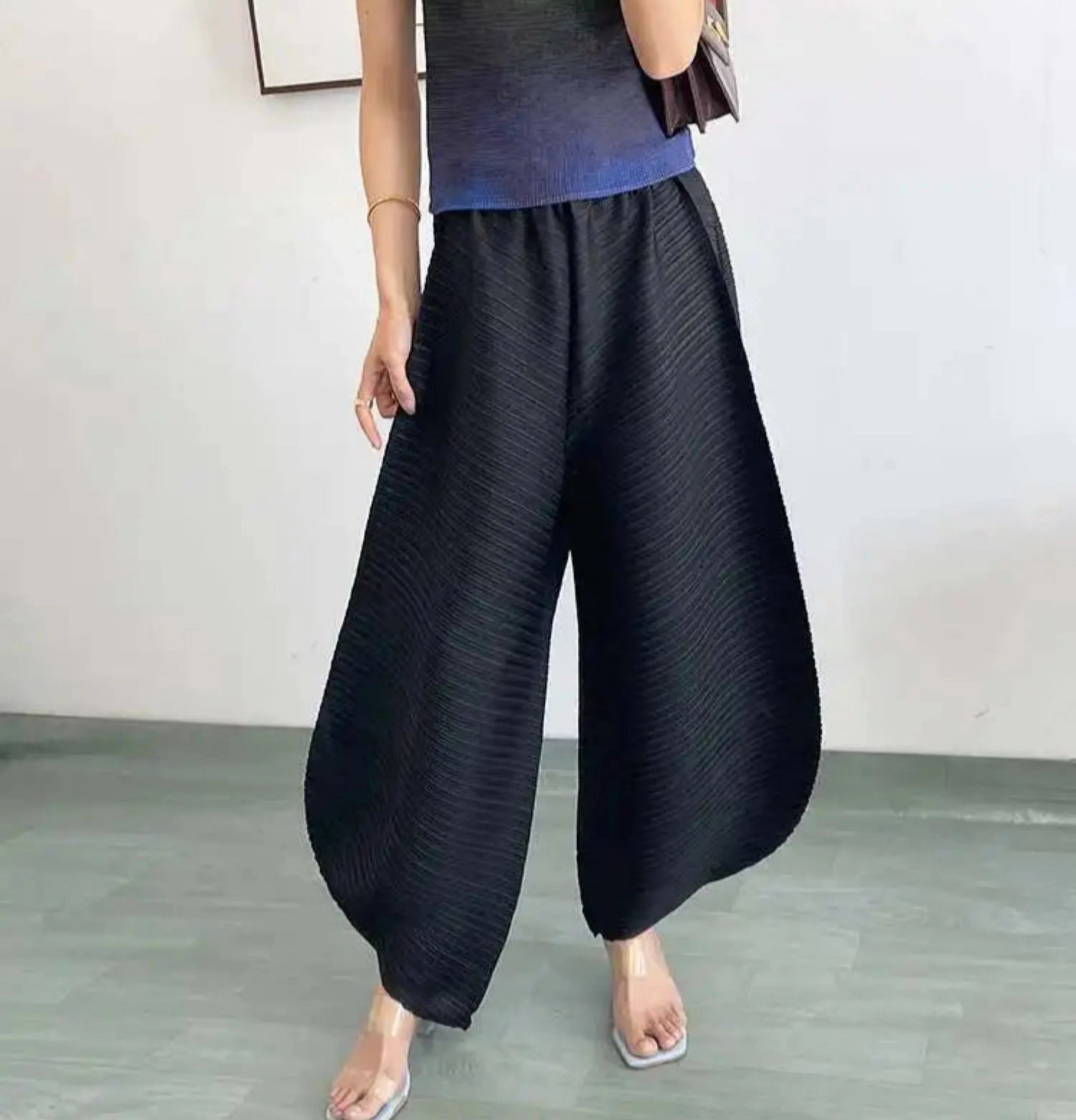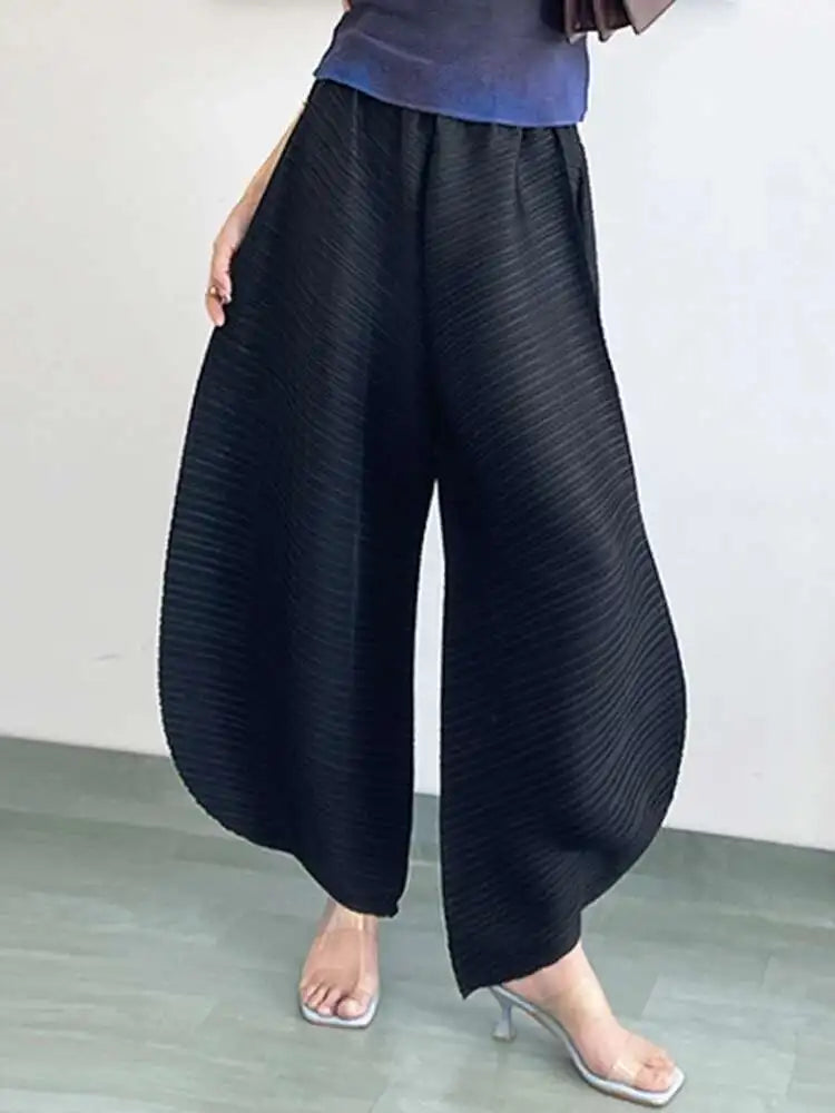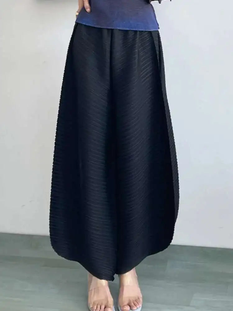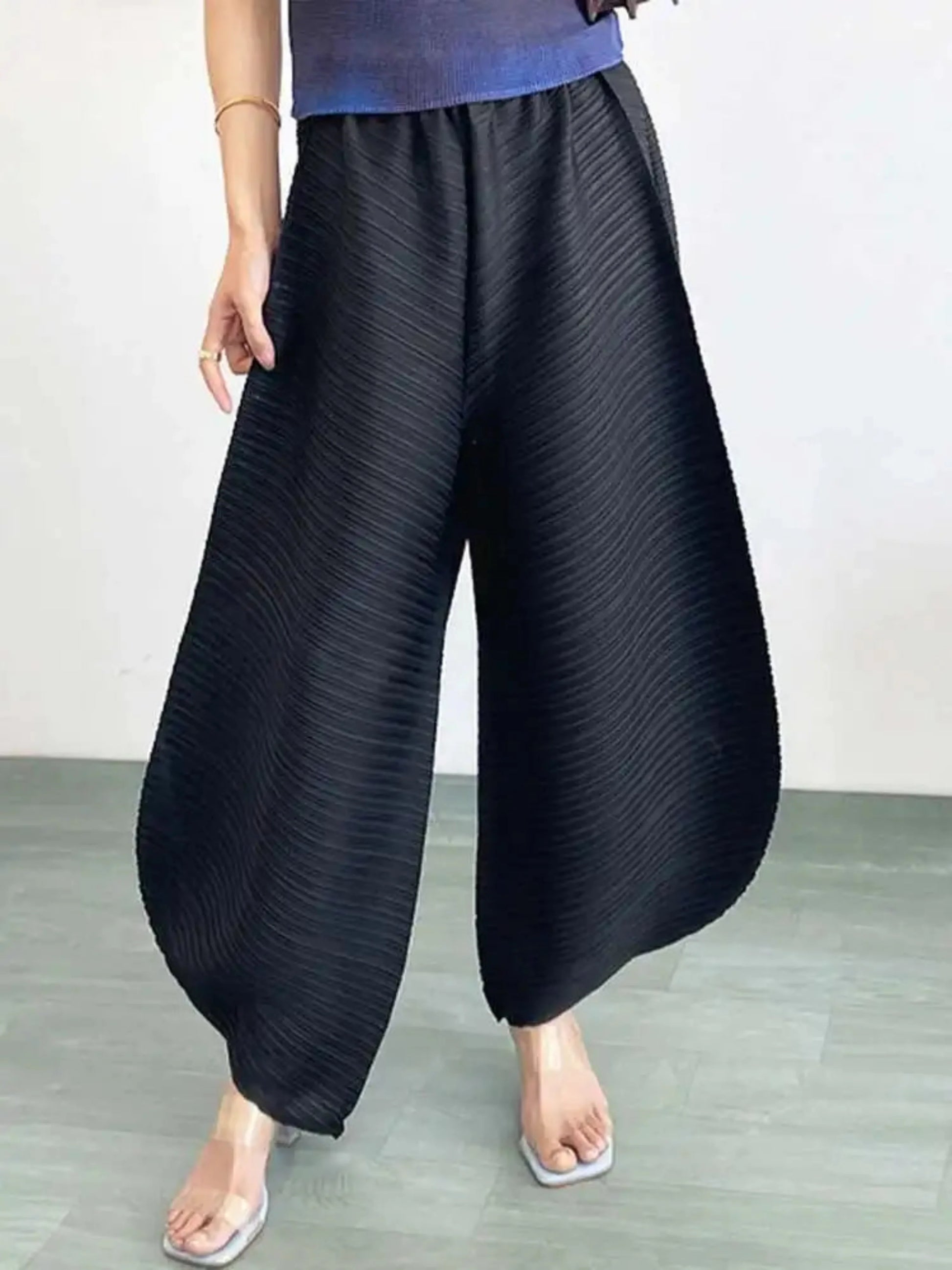Designed for bold style and comfort, these Japanese plissé wide-leg pants offer structured flow with ease.