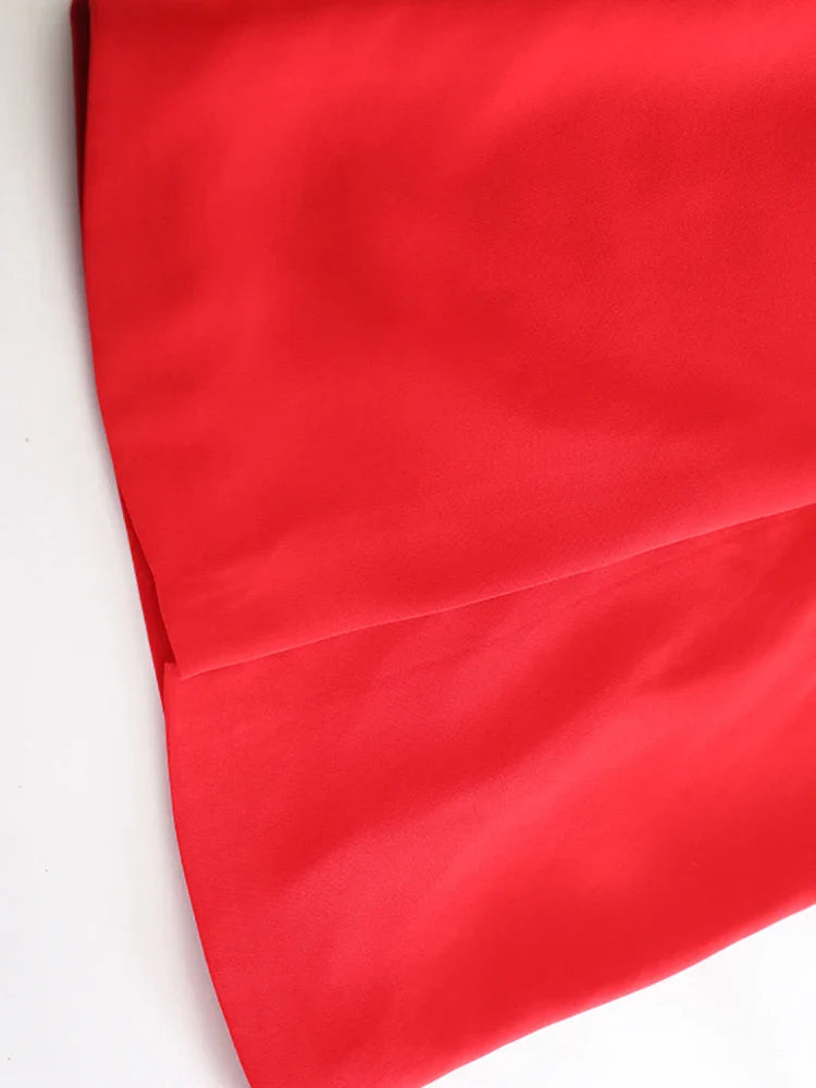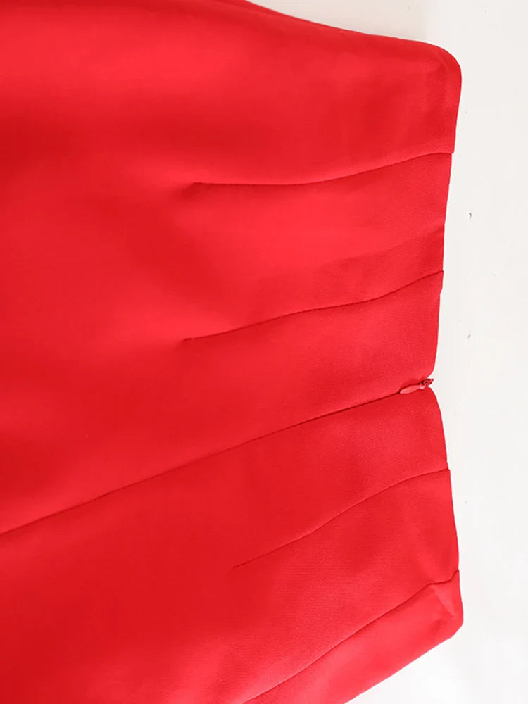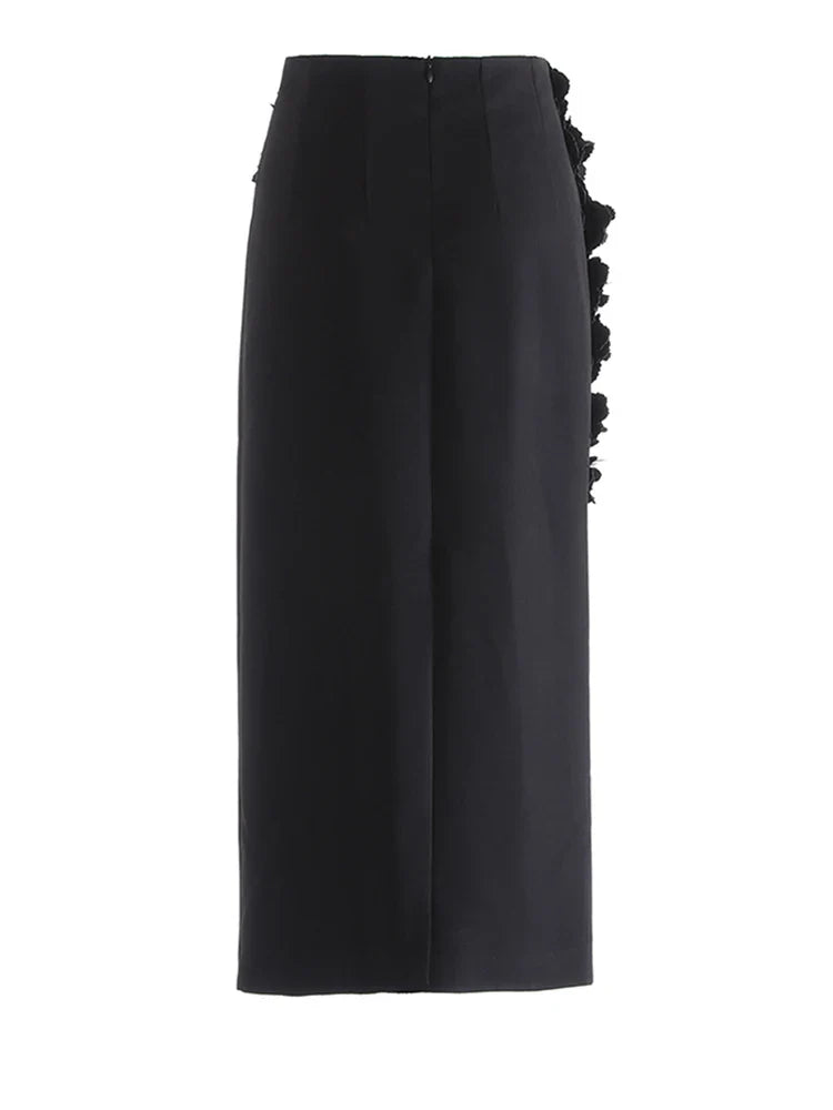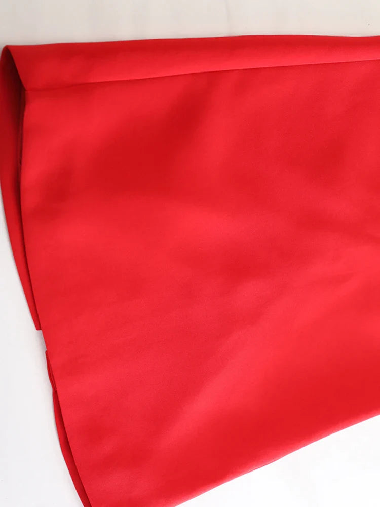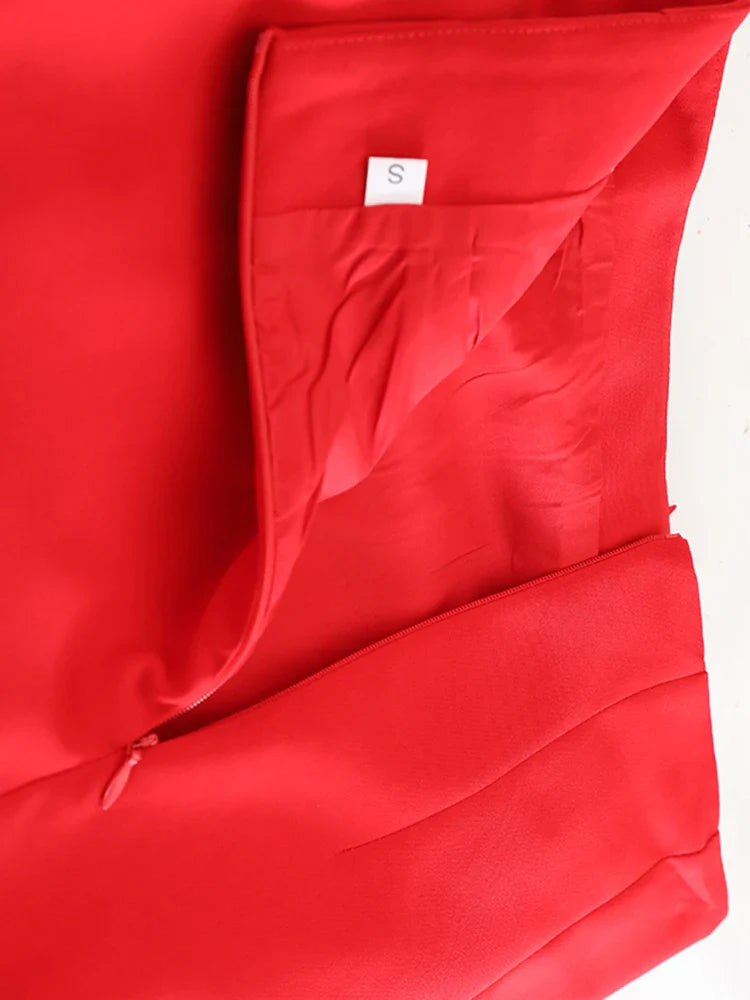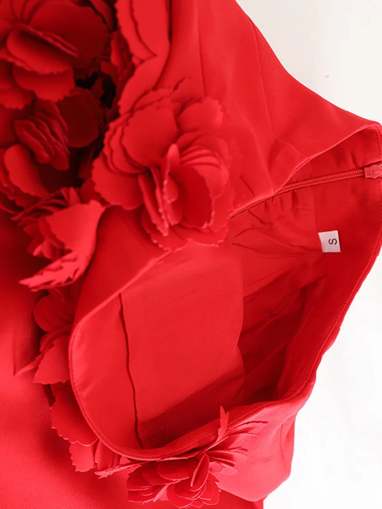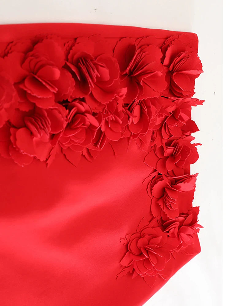 A gorgeous skirt featuring intricate 3D floral appliqué against a bold red base. The midi length offers timeless sophistication, while the tailored shape creates a graceful, feminine silhouette.