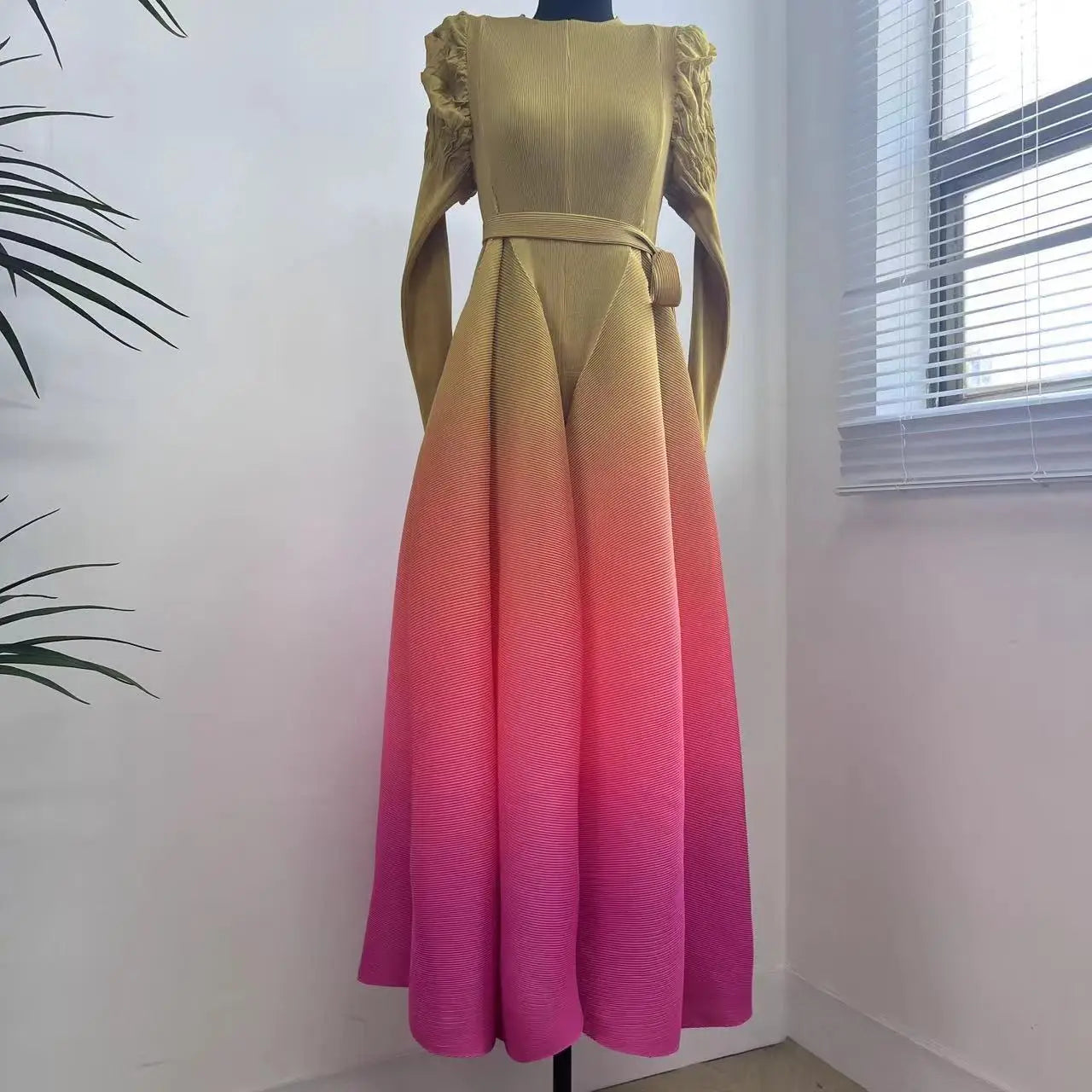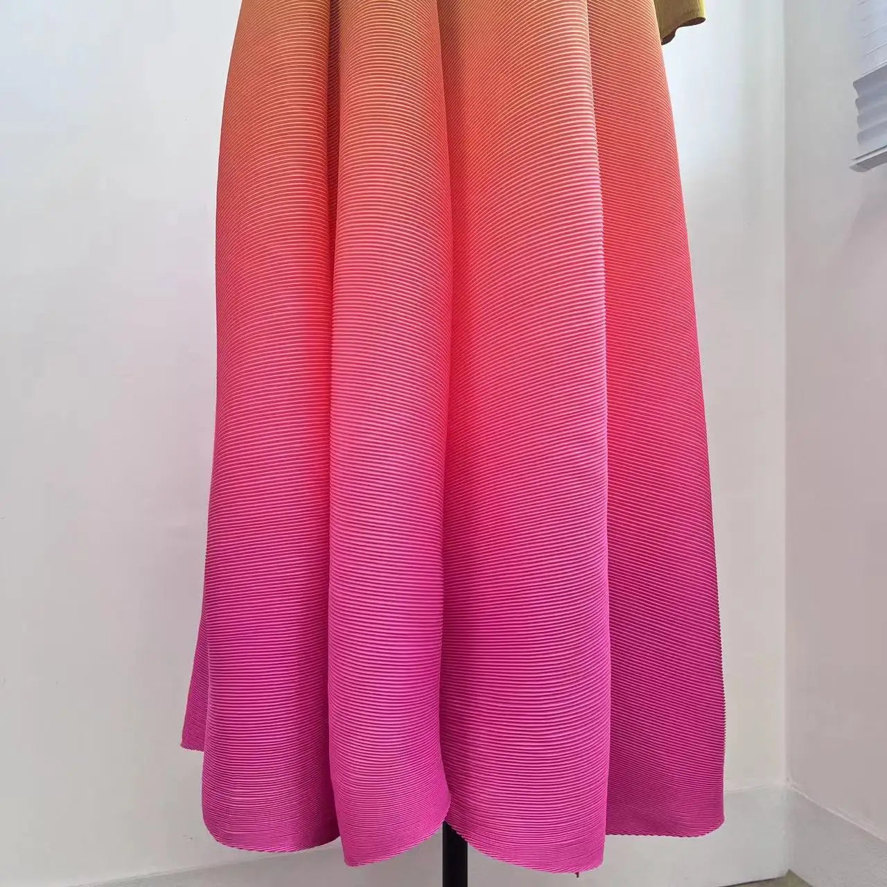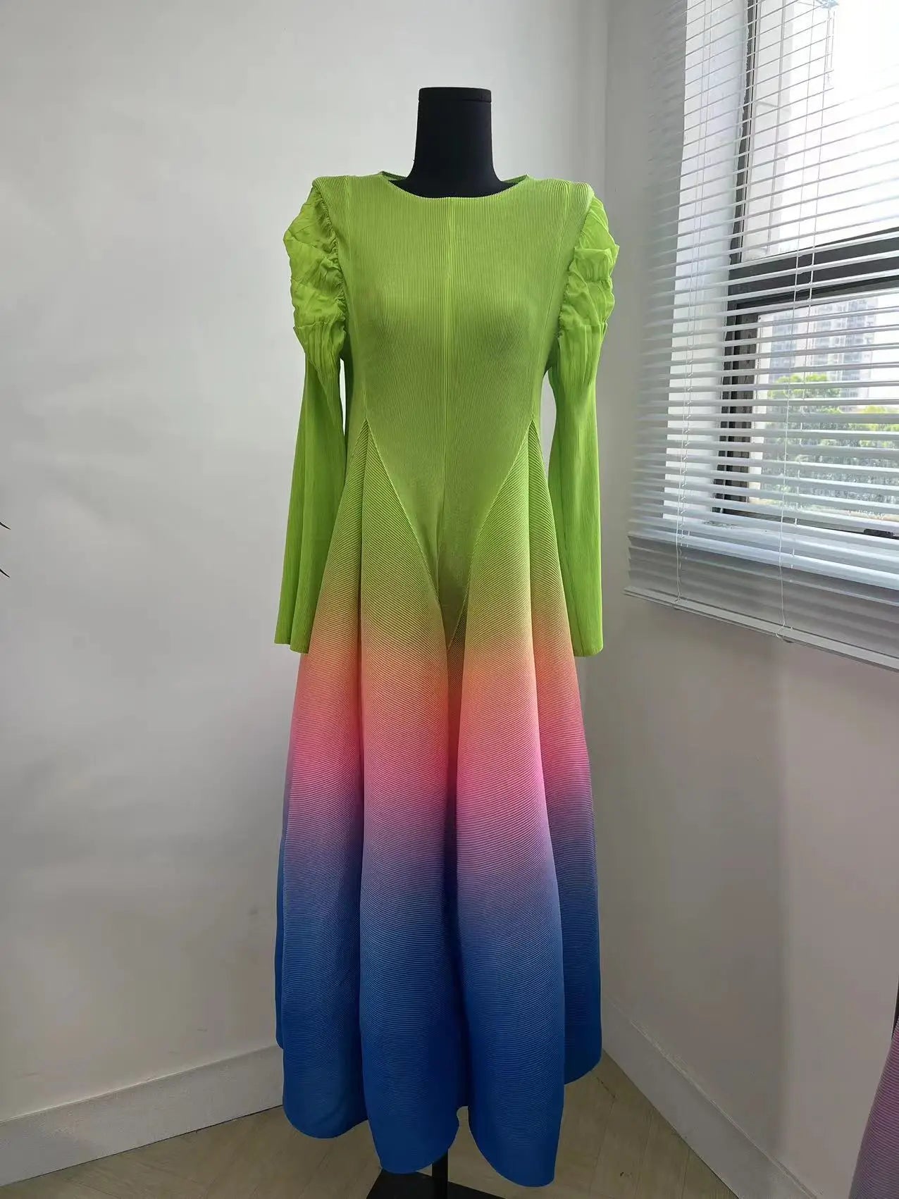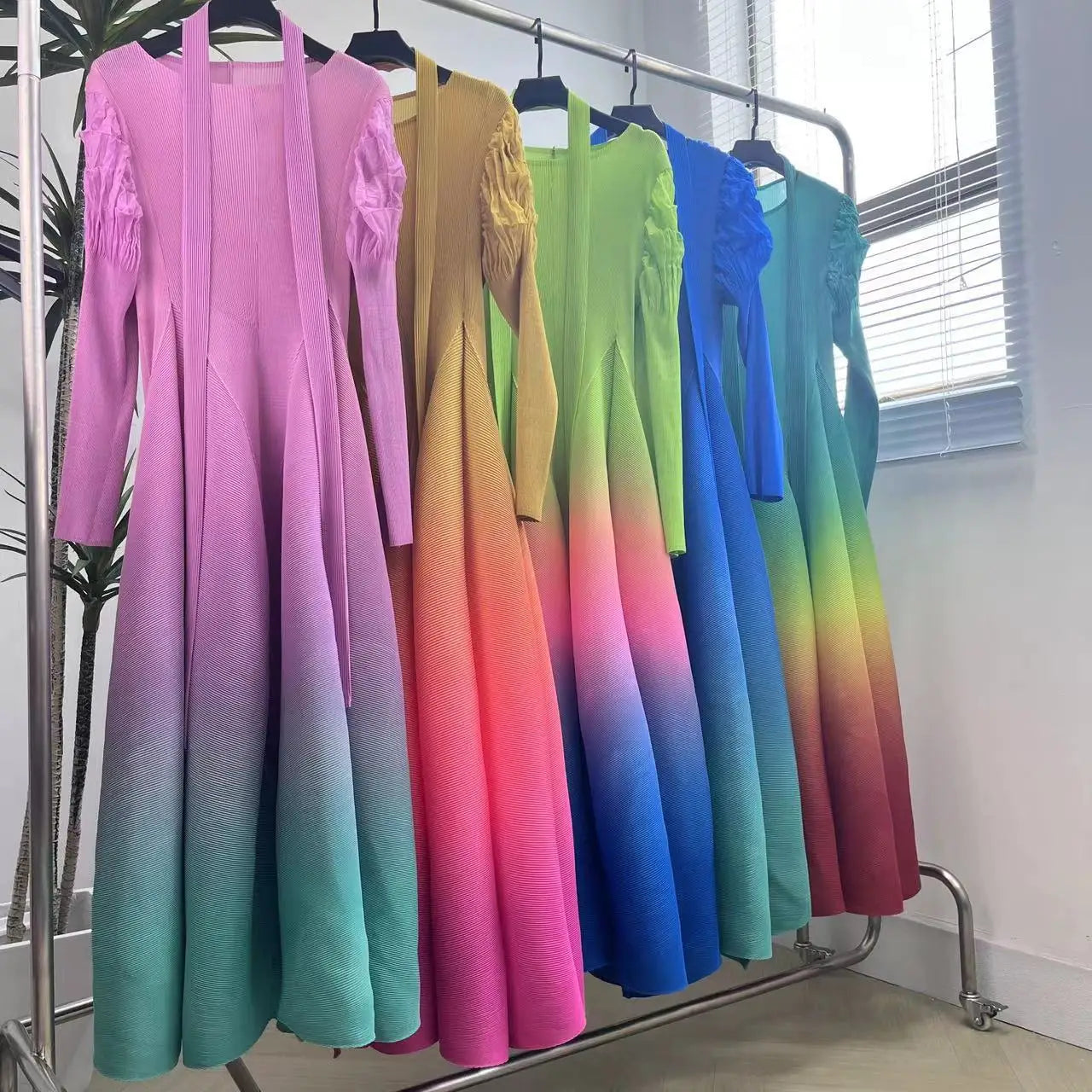 The gradient of different colors flows seamlessly, creating a visually stunning effect. Made from authentic Japanese pleated fabric, it features chic puff shoulder sleeves and offers an elegant yet modest look.Perfect for both casual outings and special events, this limited edition piece is a must-have for your wardrobe.