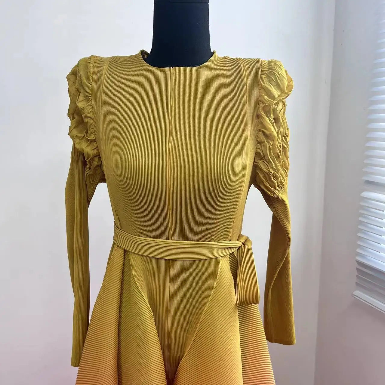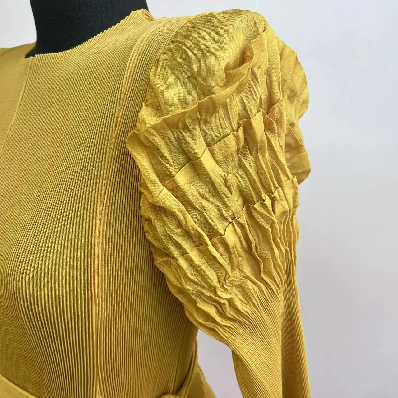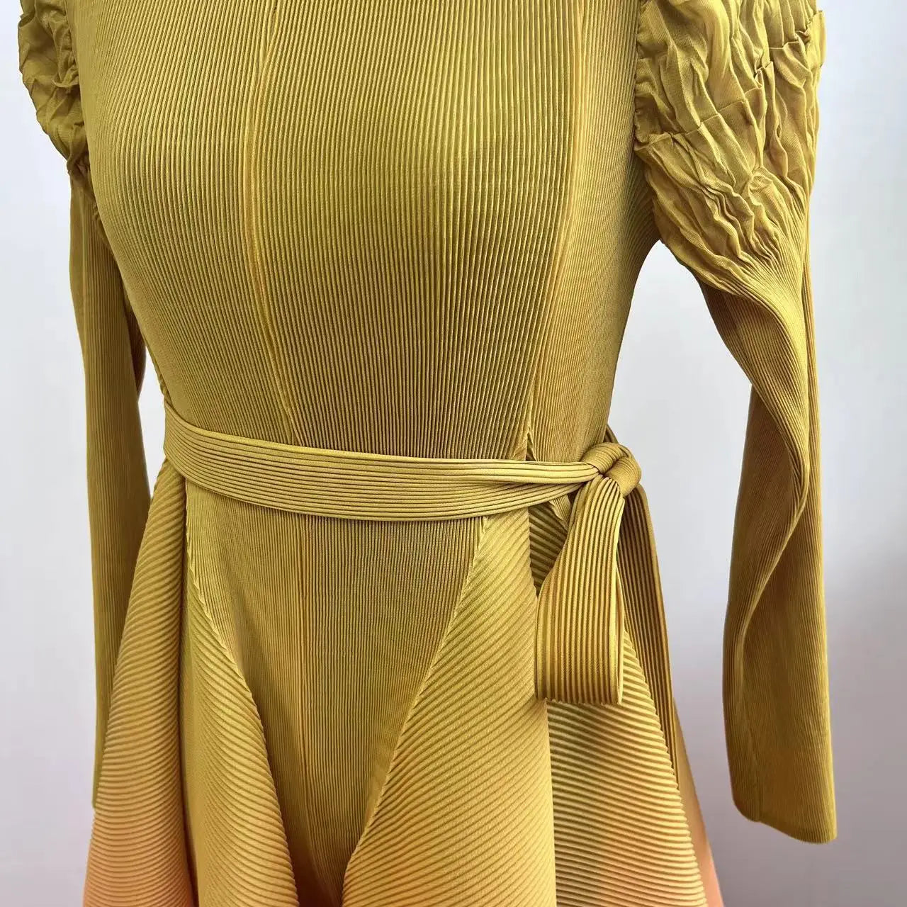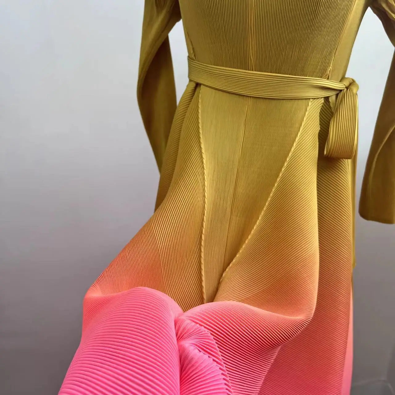The gradient of different colors flows seamlessly, creating a visually stunning effect. Made from authentic Japanese pleated fabric, it features chic puff shoulder sleeves and offers an elegant yet modest look.Perfect for both casual outings and special events, this limited edition piece is a must-have for your wardrobe.