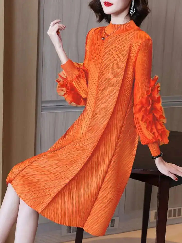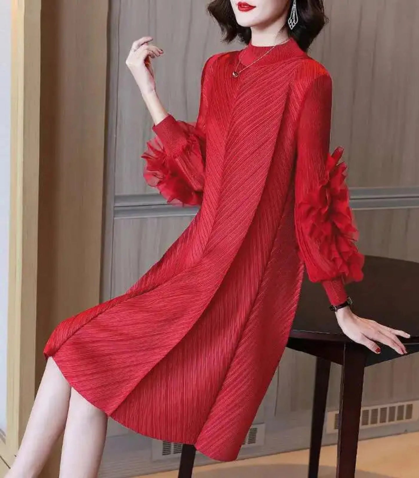 This elegant dress features premium Japanese plissé fabric with delicate floral embellishments on the sleeves. The stretchy material and ruffle details create a flattering, comfortable fit, while the perfect midi length balances style and ease.