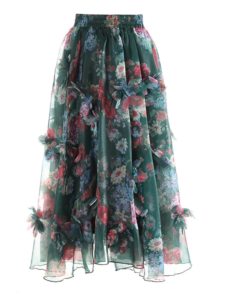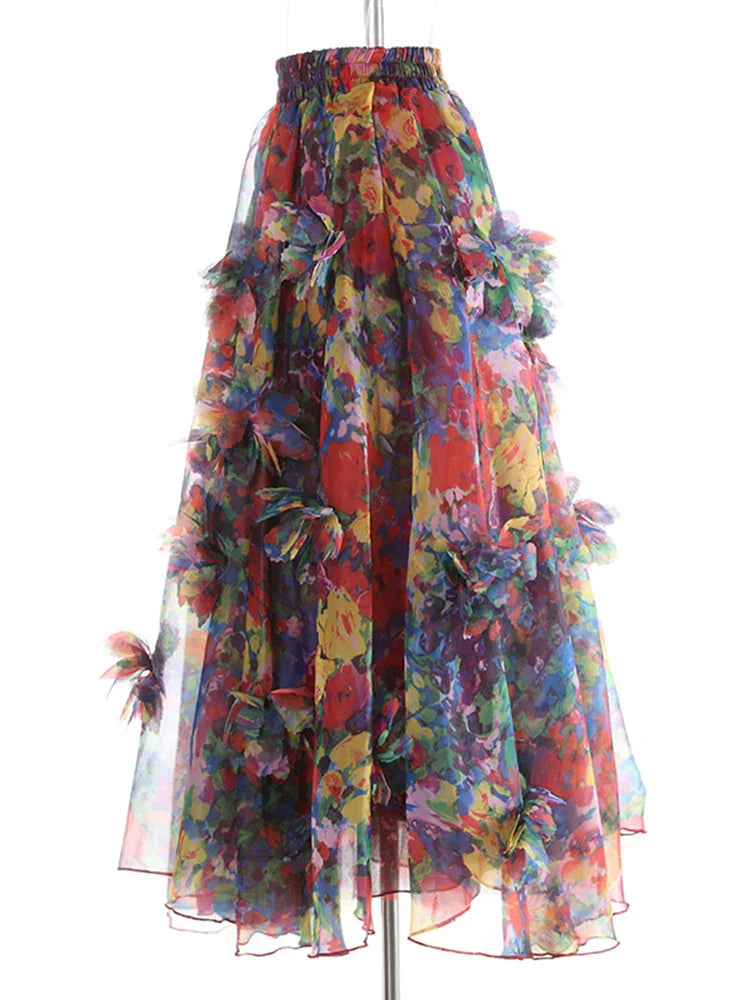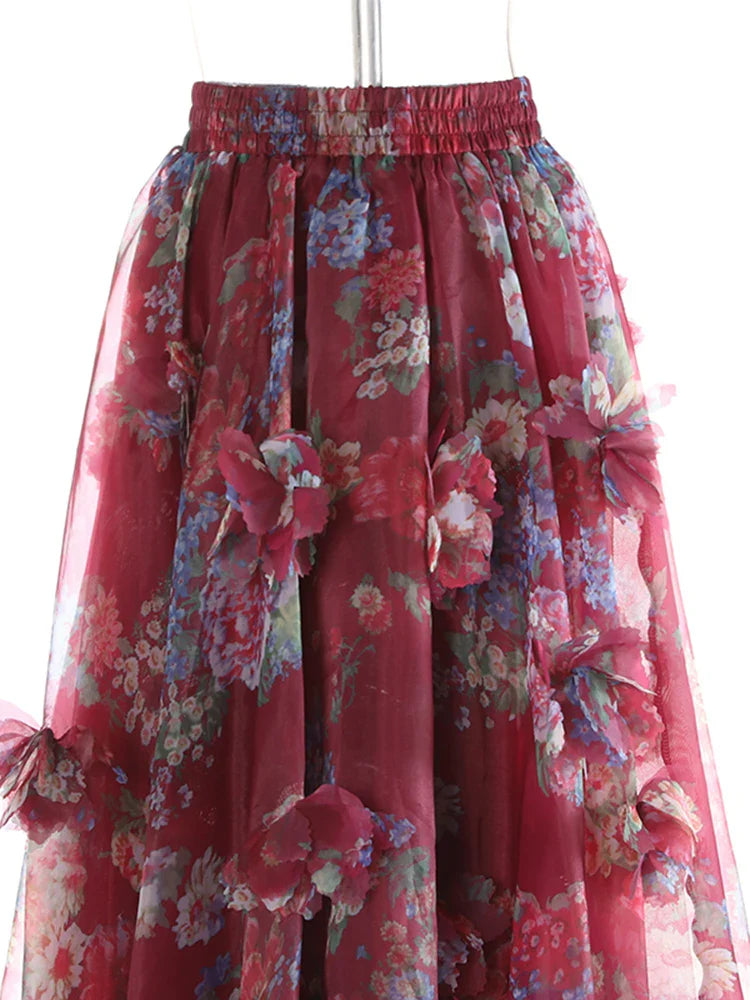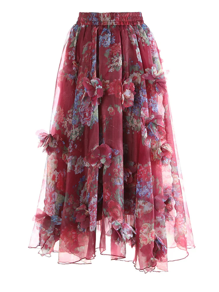 This midi skirt features elegant 3D floral appliqué on lightweight chiffon, creating a textured, luxurious look. Designed with a comfortable elastic waistband and pull-on style, it offers effortless fit and wear.
