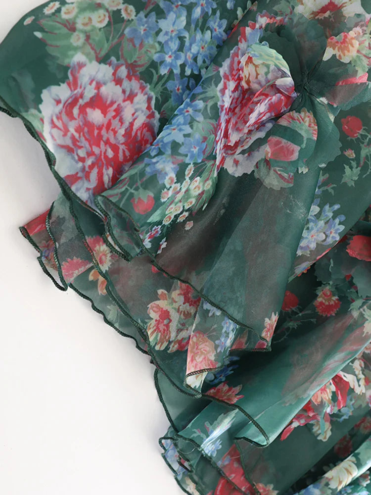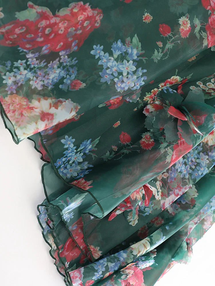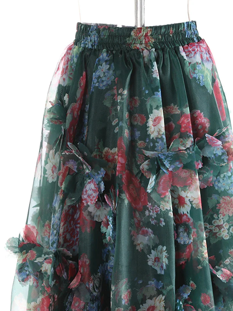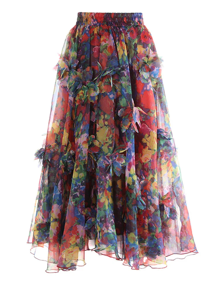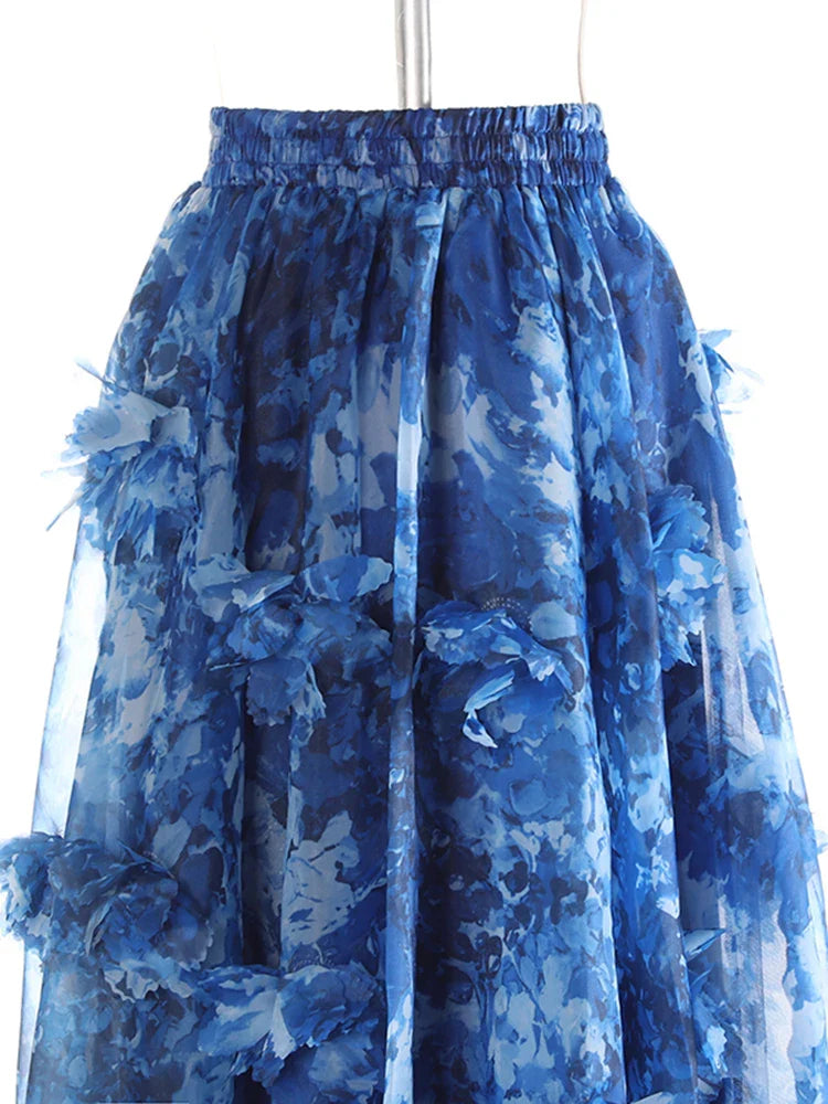 This midi skirt features elegant 3D floral appliqué on lightweight chiffon, creating a textured, luxurious look. Designed with a comfortable elastic waistband and pull-on style, it offers effortless fit and wear.
