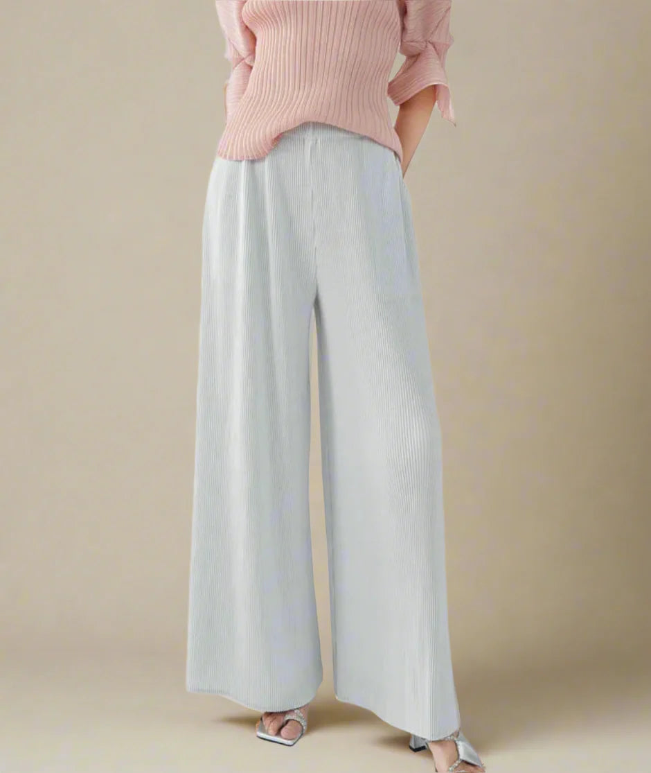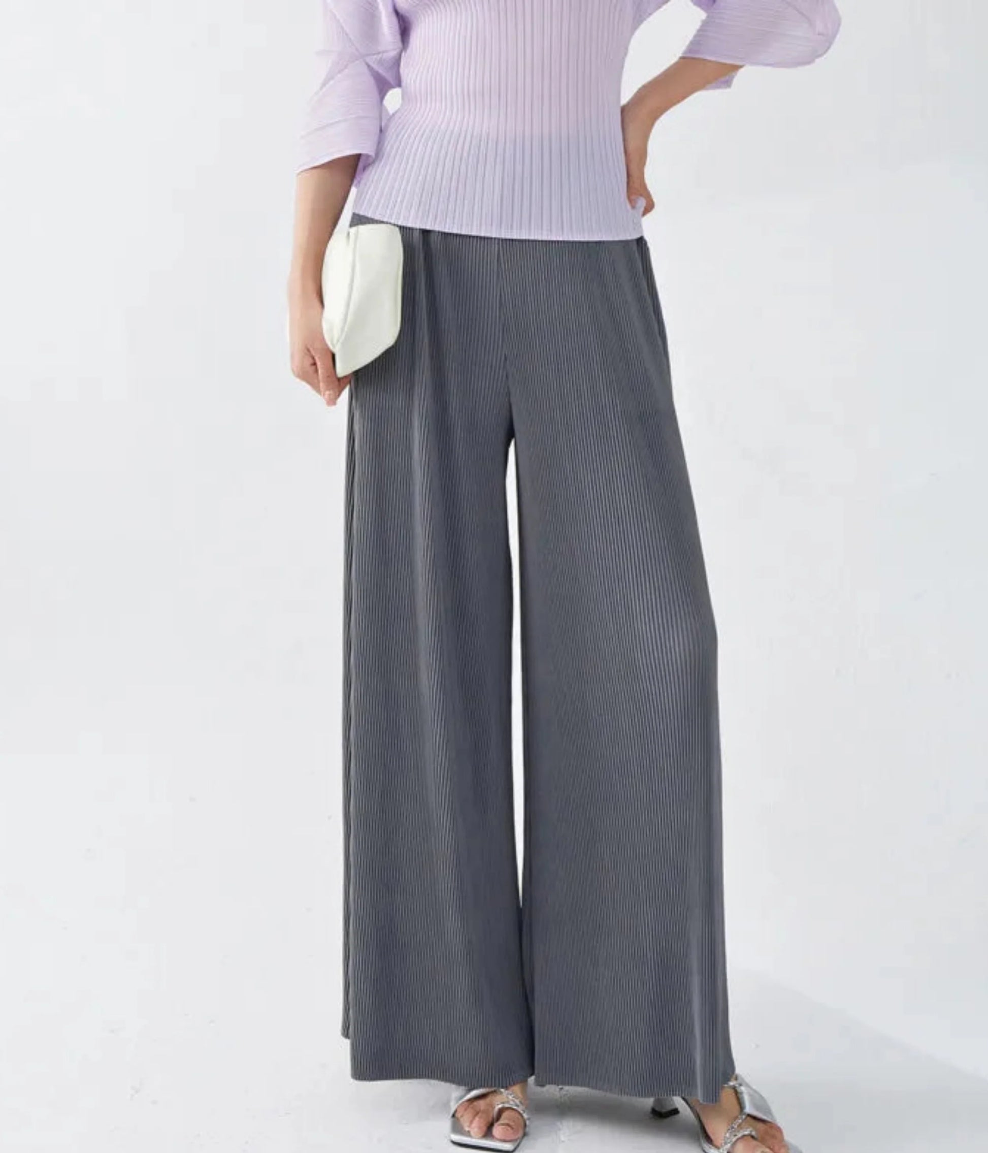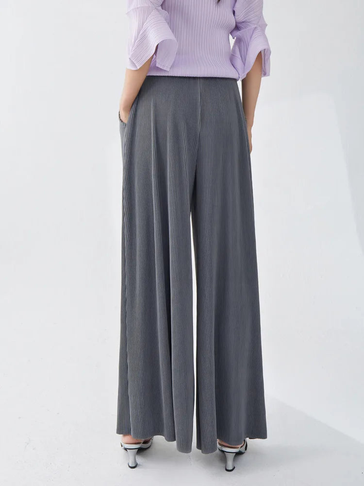 These wide-leg palazzo trousers combine style and comfort. Featuring Japanese pleats, a high-waisted design, and a stretchy elastic waistband, they drape elegantly while allowing easy movement.