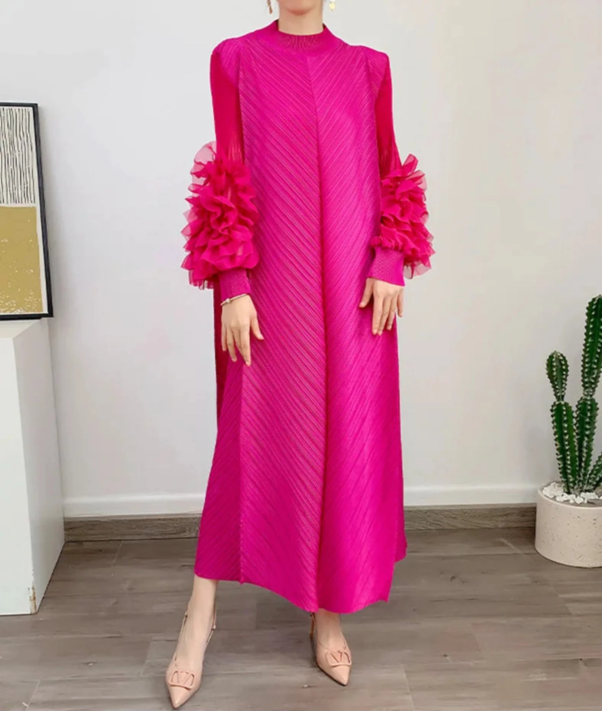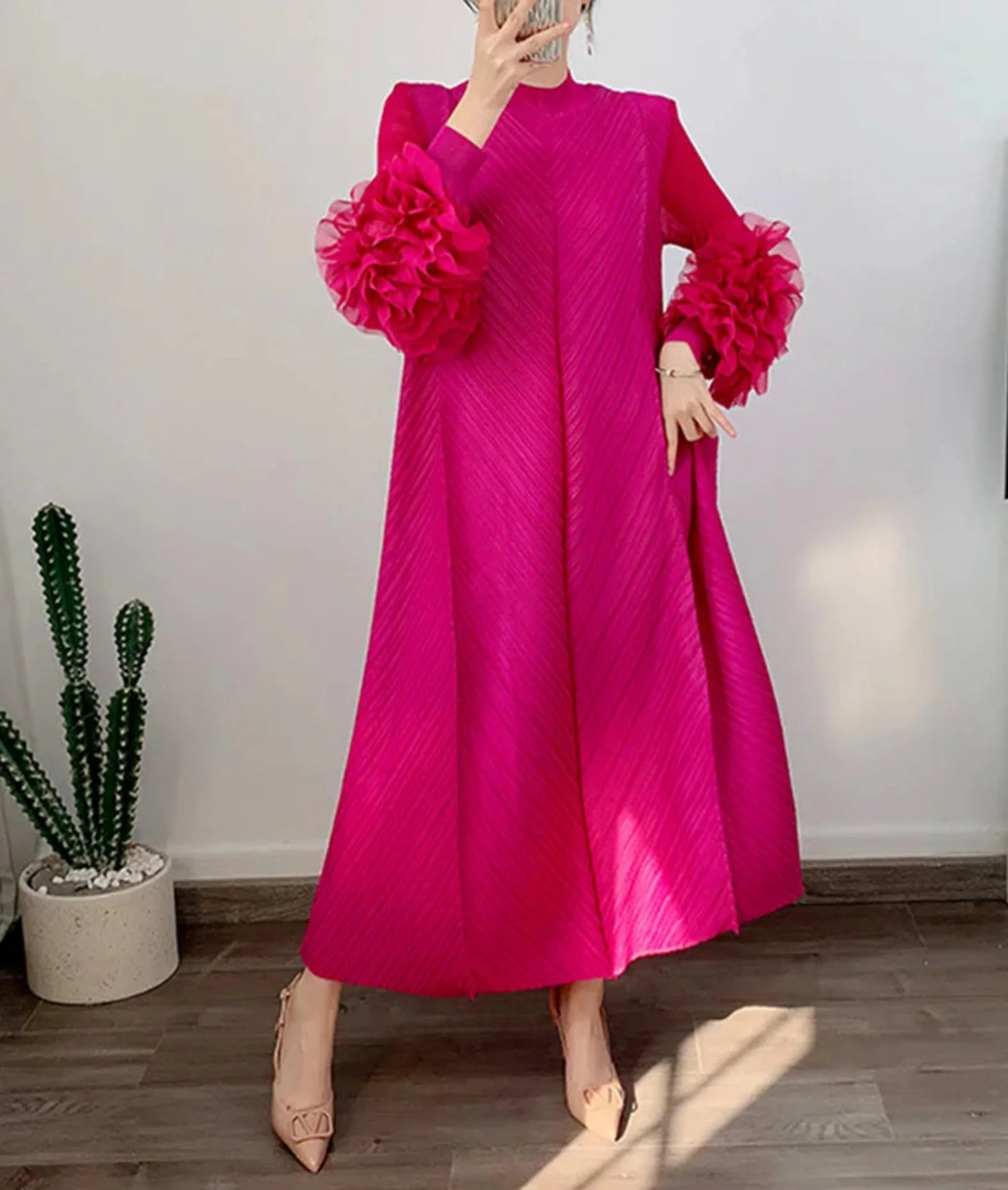 This Japanese Plissé Pleated Midi Dress combines artistry and elegance with delicate pleats and ruffled sleeves shaped like flowers. Designed with long sleeves and a flattering silhouette, it offers a unique, sophisticated style perfect for any refined occasion.