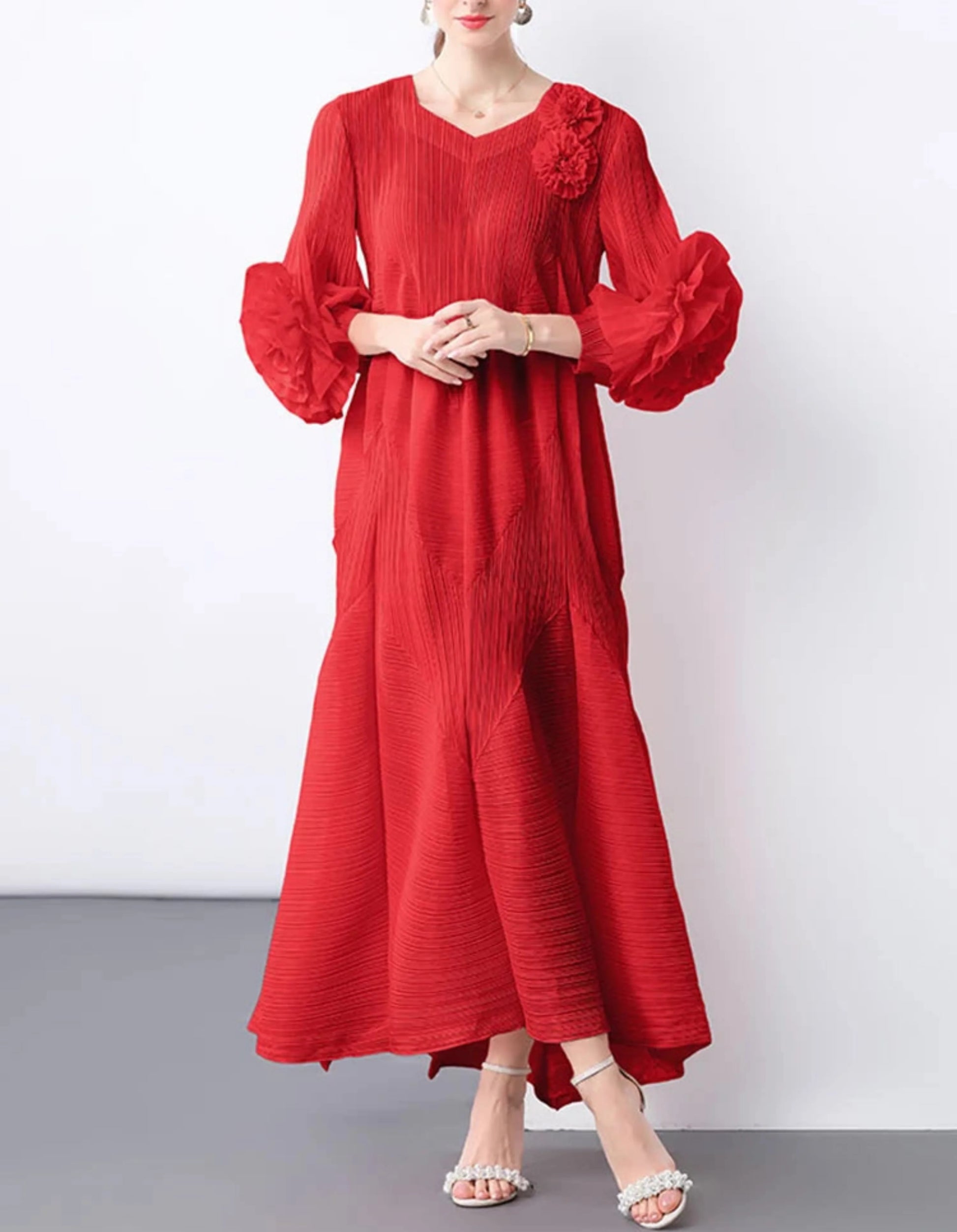 This midi dress is made from authentic Japanese plissé fabric with a sculpted, stretchy drape. Designed with 3D floral ruffles, it creates a unique shape that moves with you.