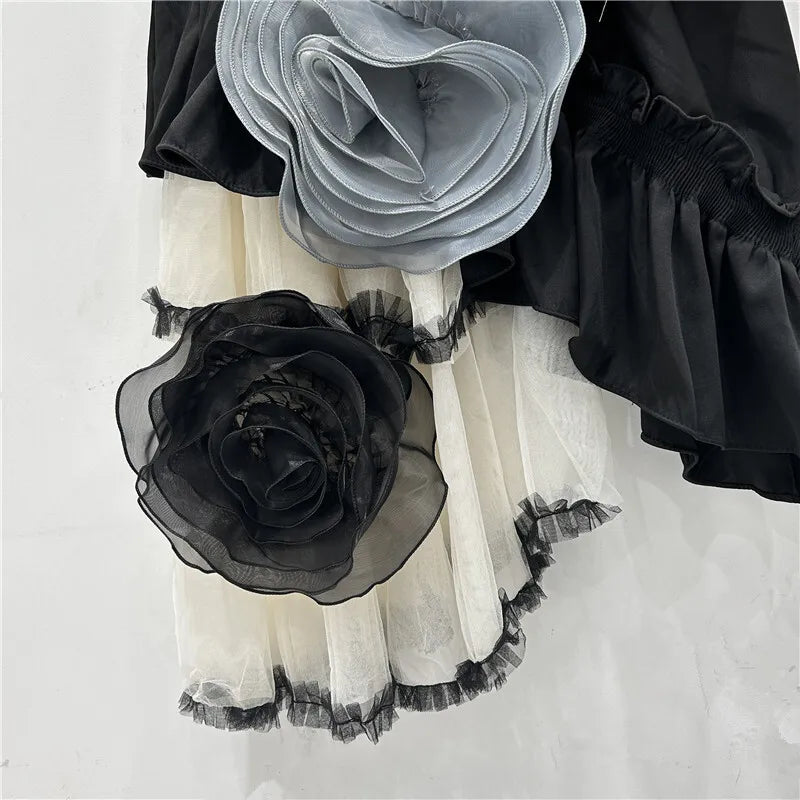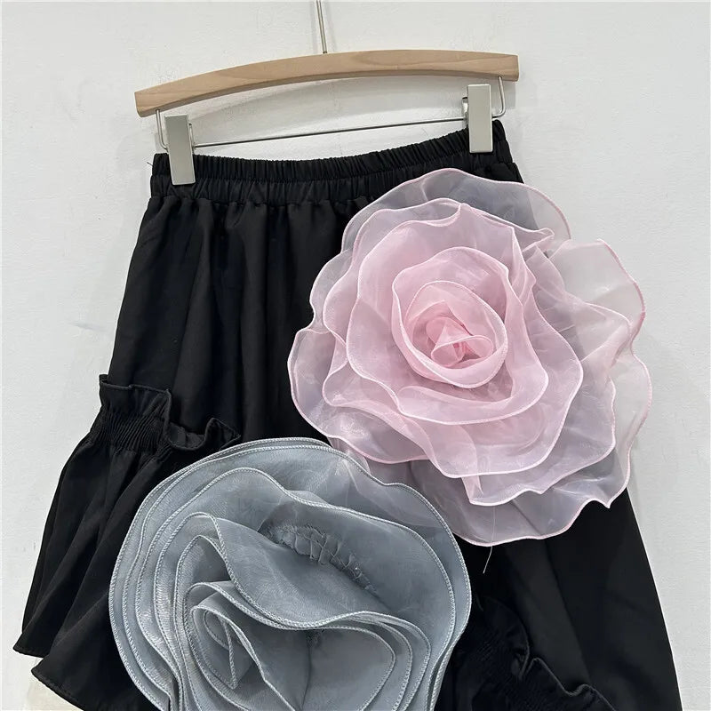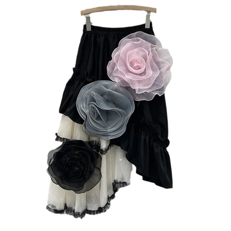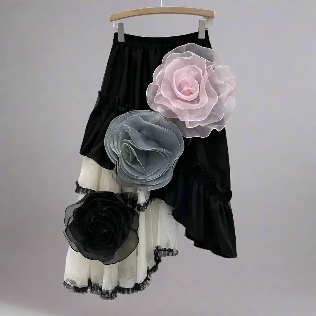 For the woman who loves to stand out with flair. This striking skirt features oversized 3D floral appliqués and an asymmetric hemline, making it perfect for both daytime events and evening outings.