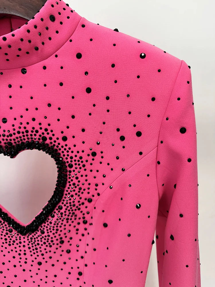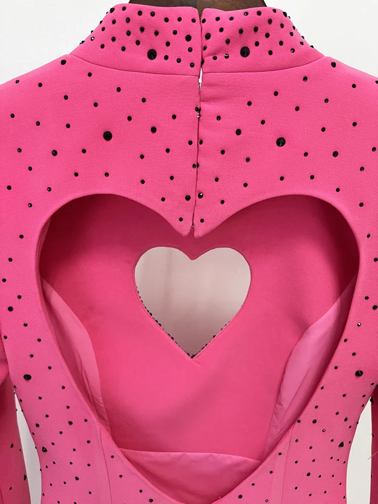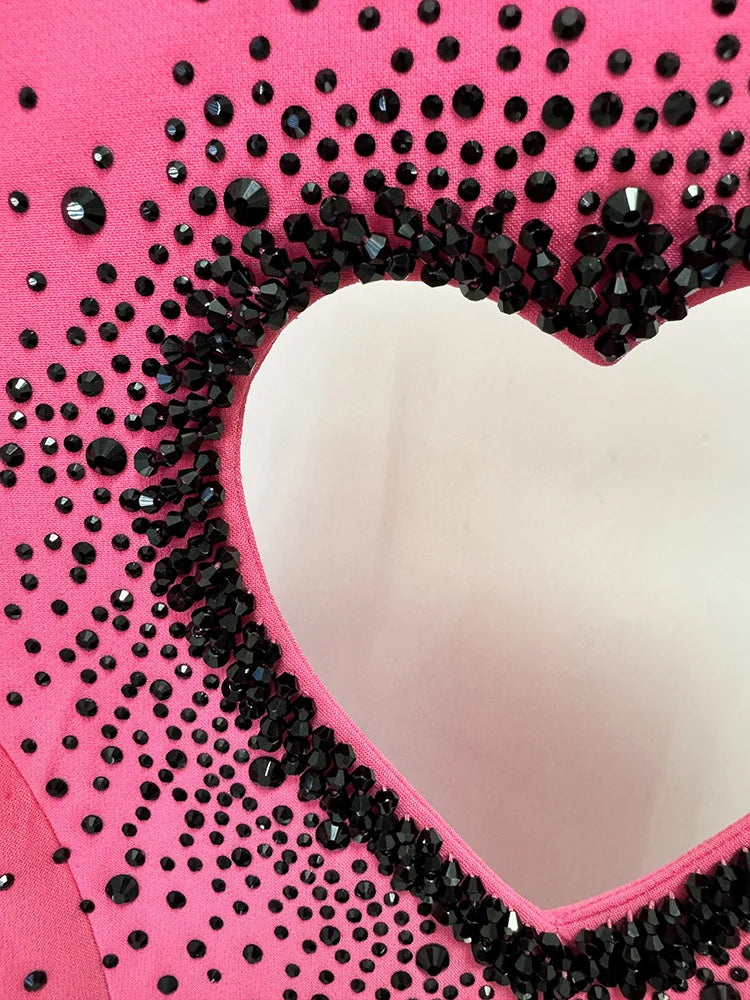 Designed for standout moments, this full-length gown features bold heart-shaped cut-outs and shimmering black rhinestones. The sleek silhouette and long sleeves strike the perfect balance between drama and elegance.