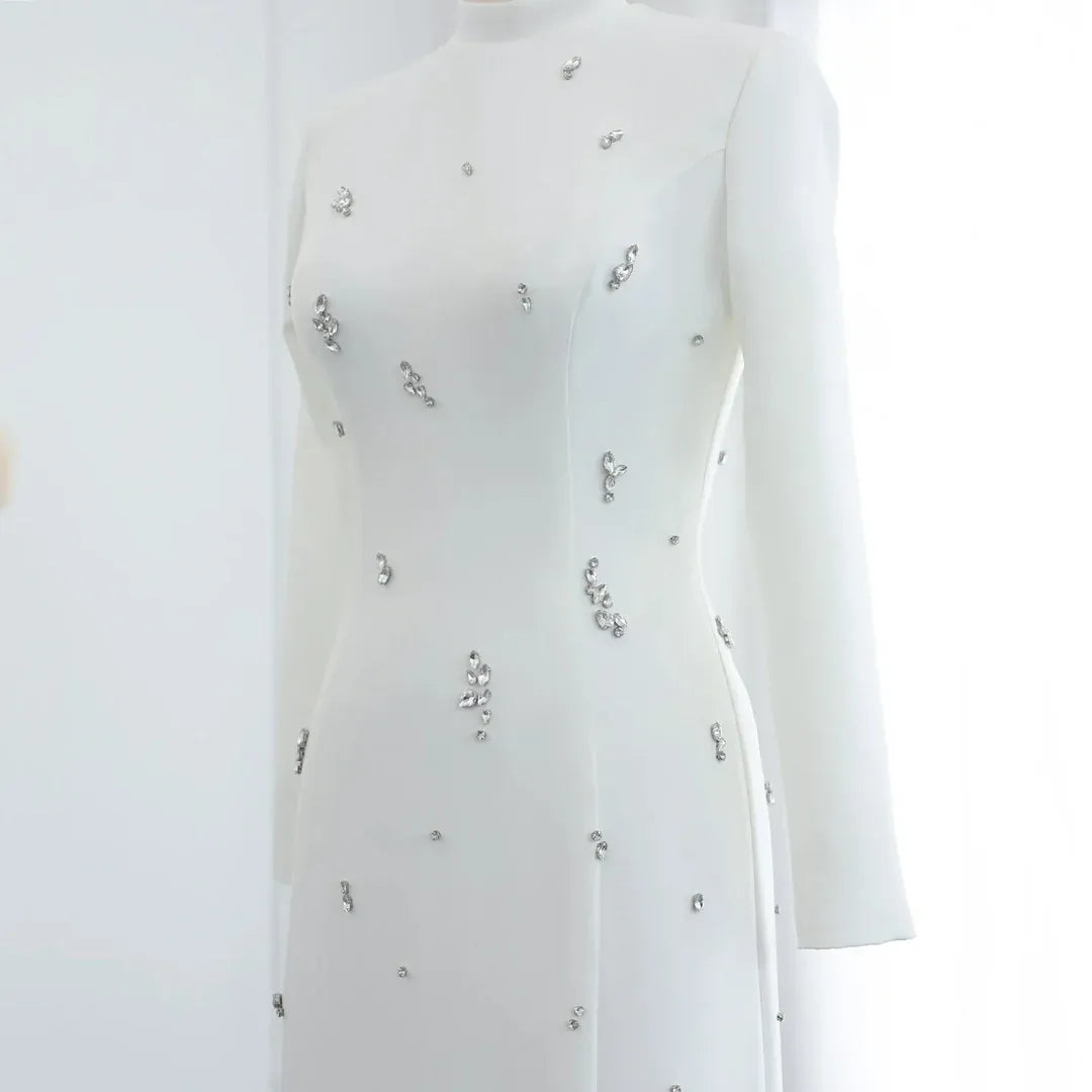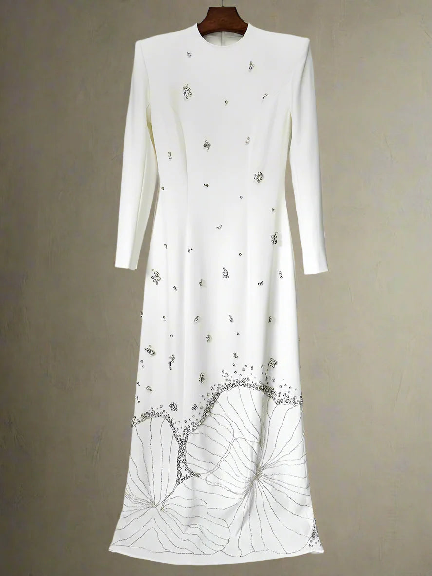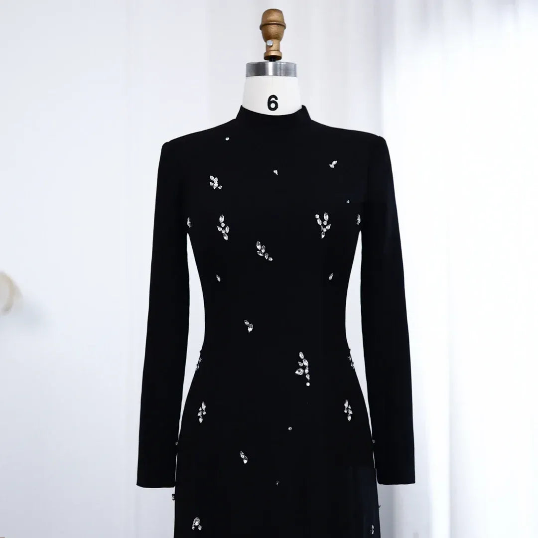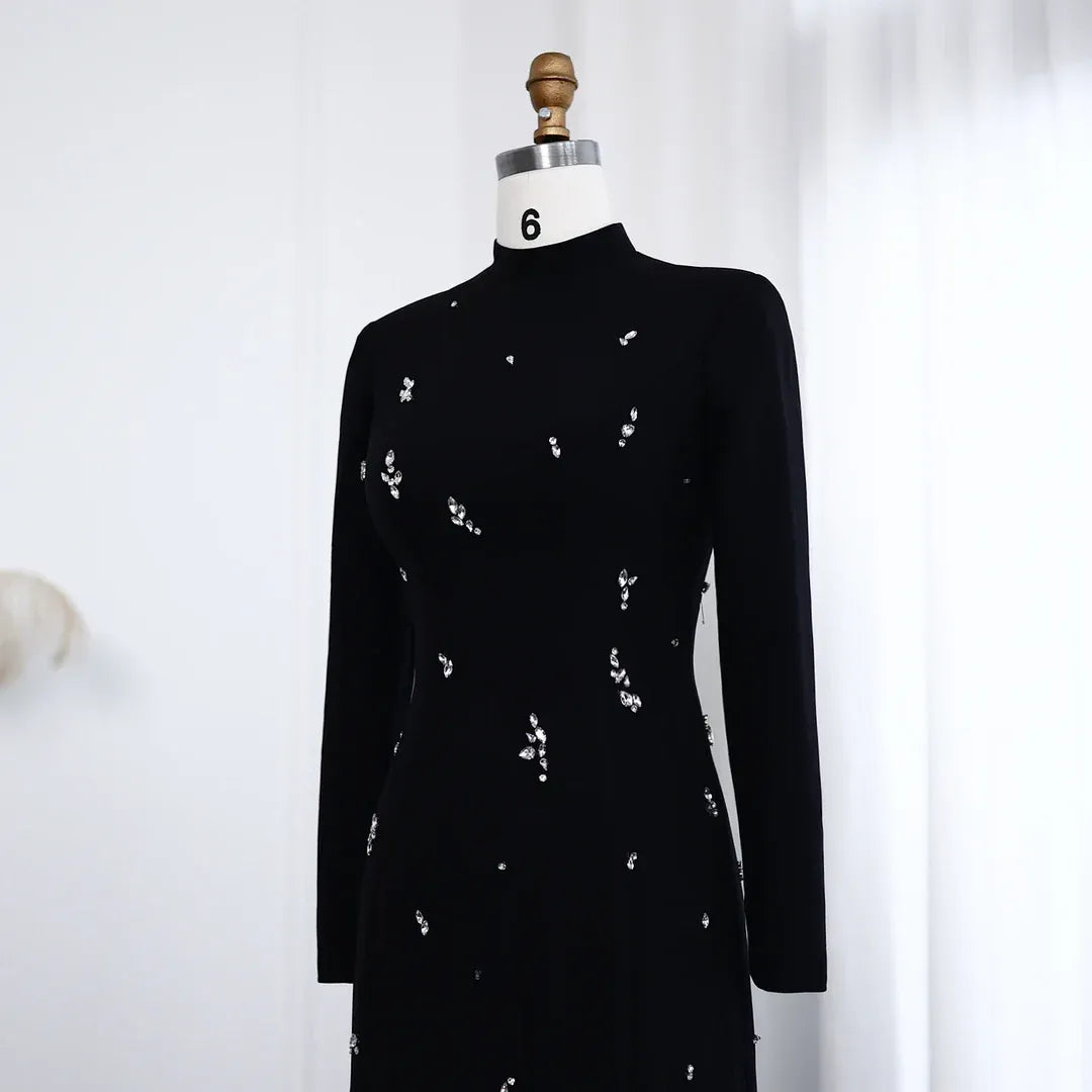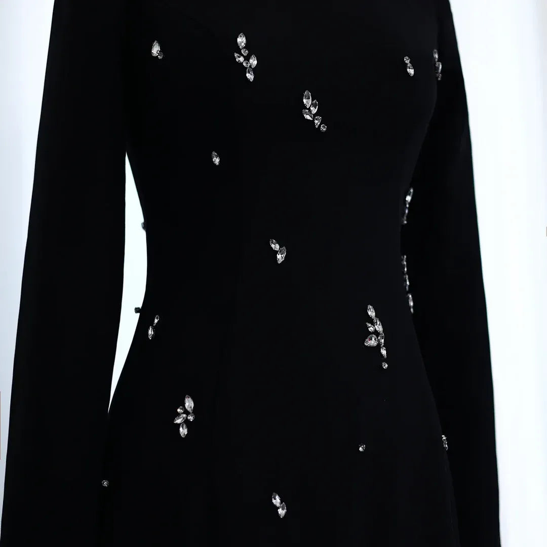 A sleek statement in crystal. This full-length maxi gown catches the light with luxe embellishments, while its long sleeves and clean lines offer a refined, modest profile. Designed for elegant events where quiet glamour speaks loudest.