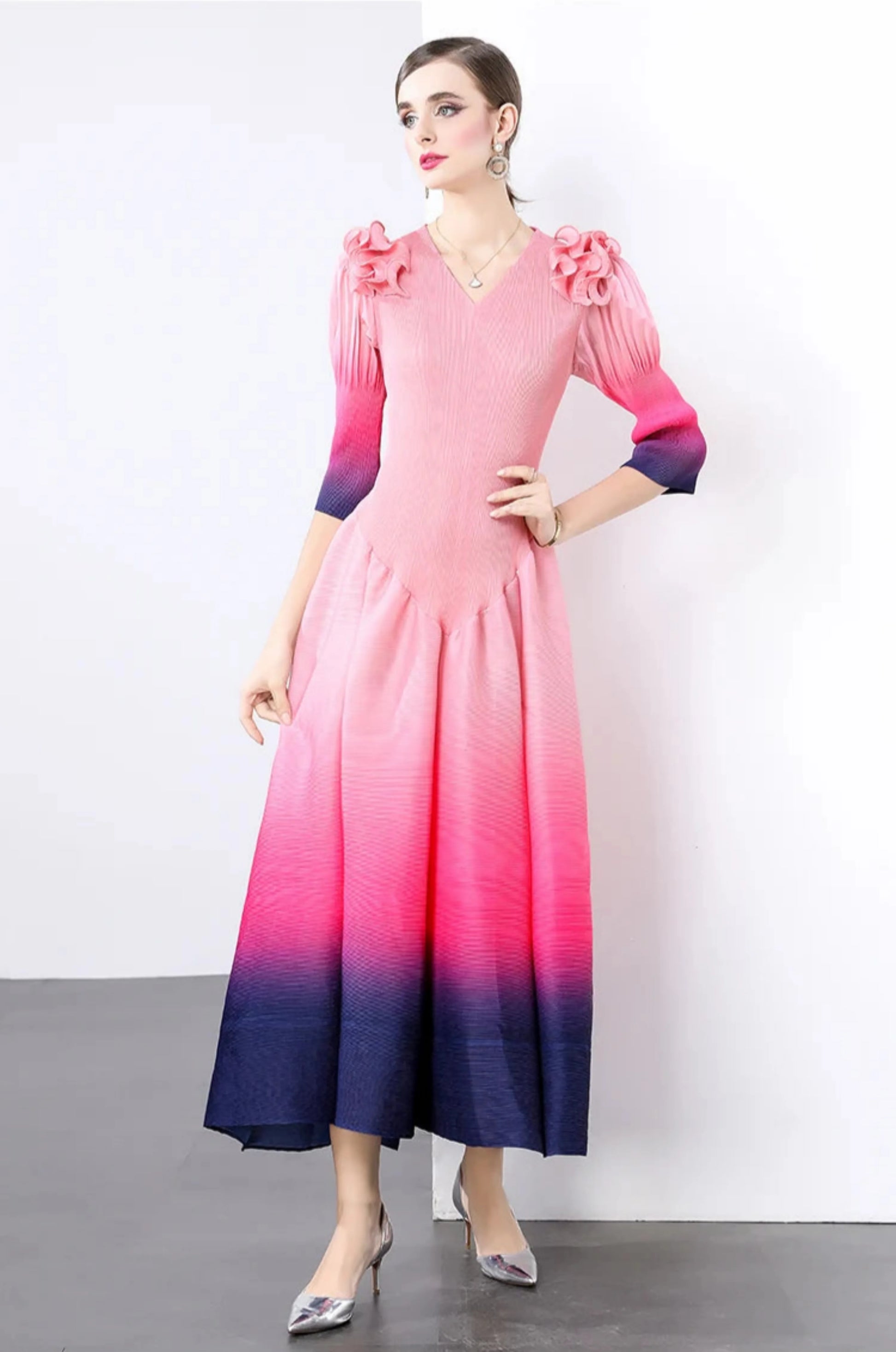 This petite midi dress features premium Japanese pleats and soft ombre tones with standout floral detailing at the shoulders. Breathable, stretchy, and wrinkle-free. A refined silhouette with luxurious flow.