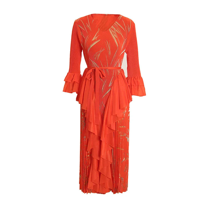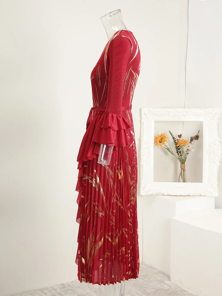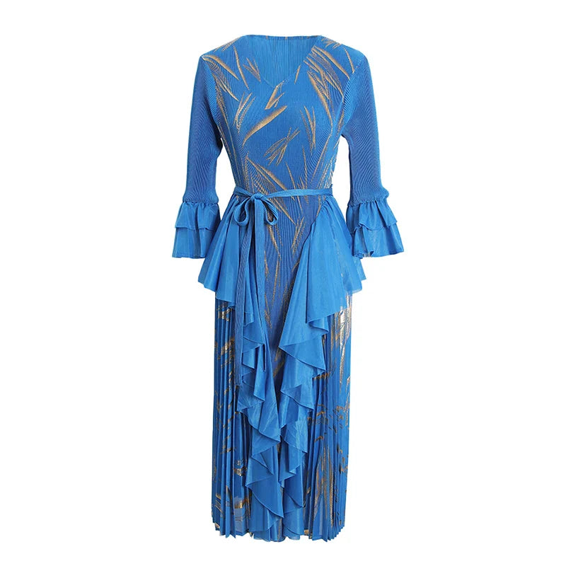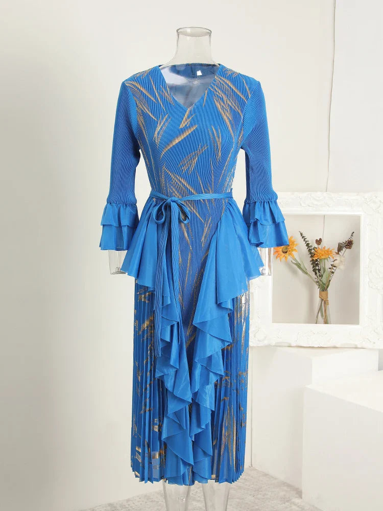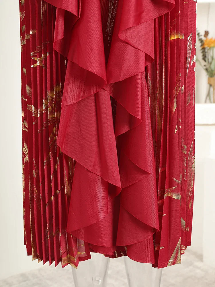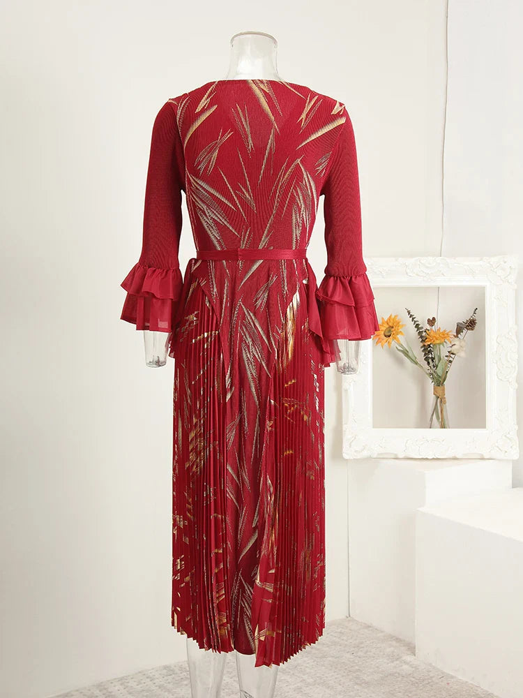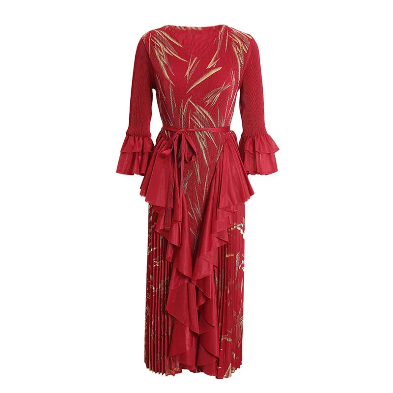 This midi dress features structured Japanese pleats and soft ruffle details, offering a balanced silhouette that moves with ease. Designed for modest styling and a flattering petite fit, it transitions well from day events to evening occasions.