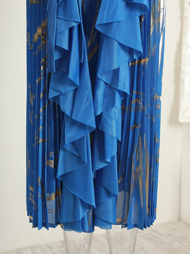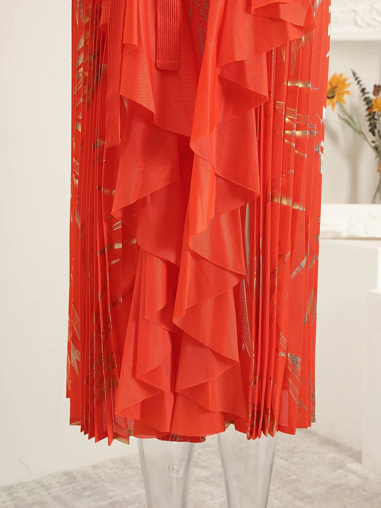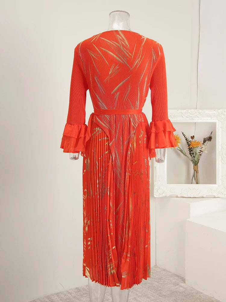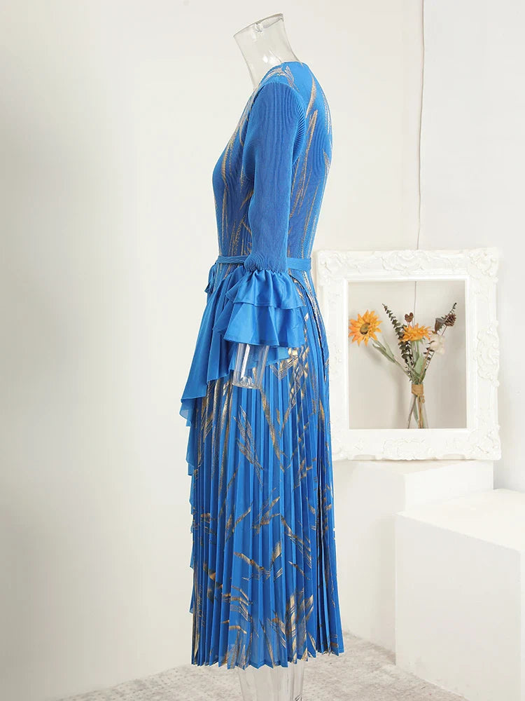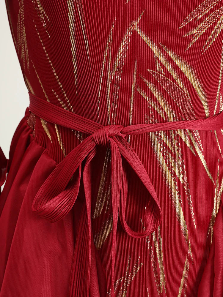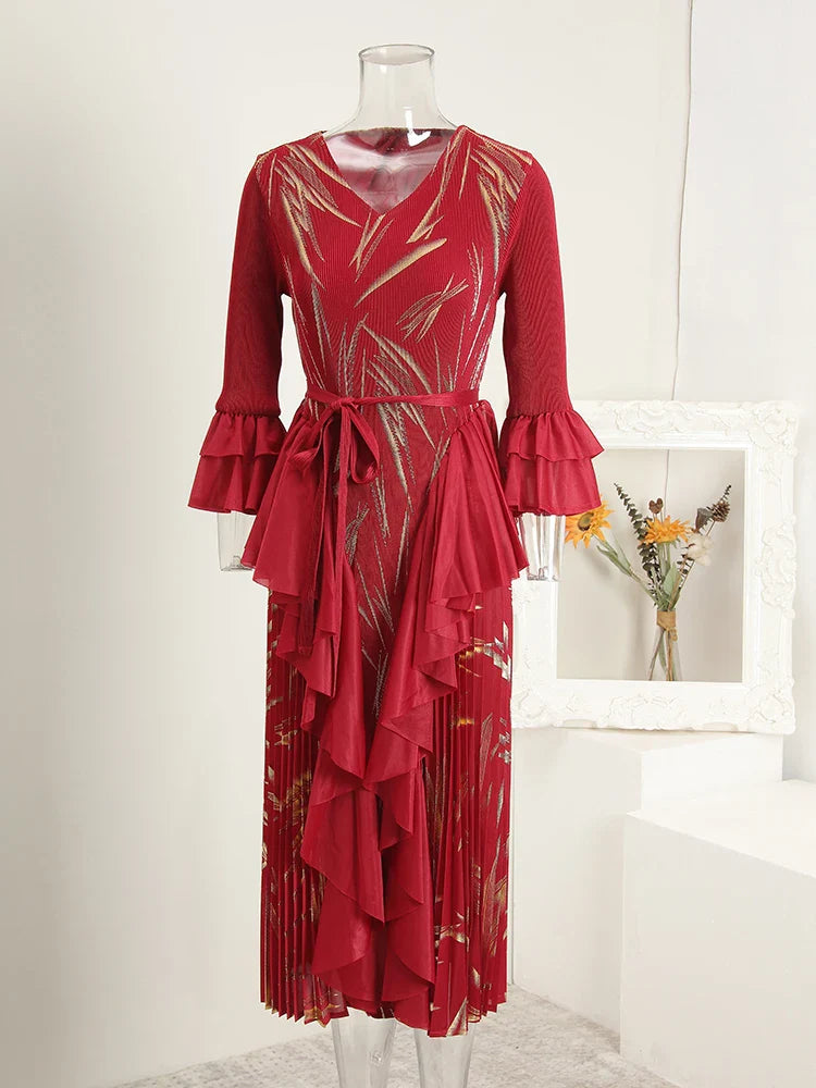 This midi dress features structured Japanese pleats and soft ruffle details, offering a balanced silhouette that moves with ease. Designed for modest styling and a flattering petite fit, it transitions well from day events to evening occasions.