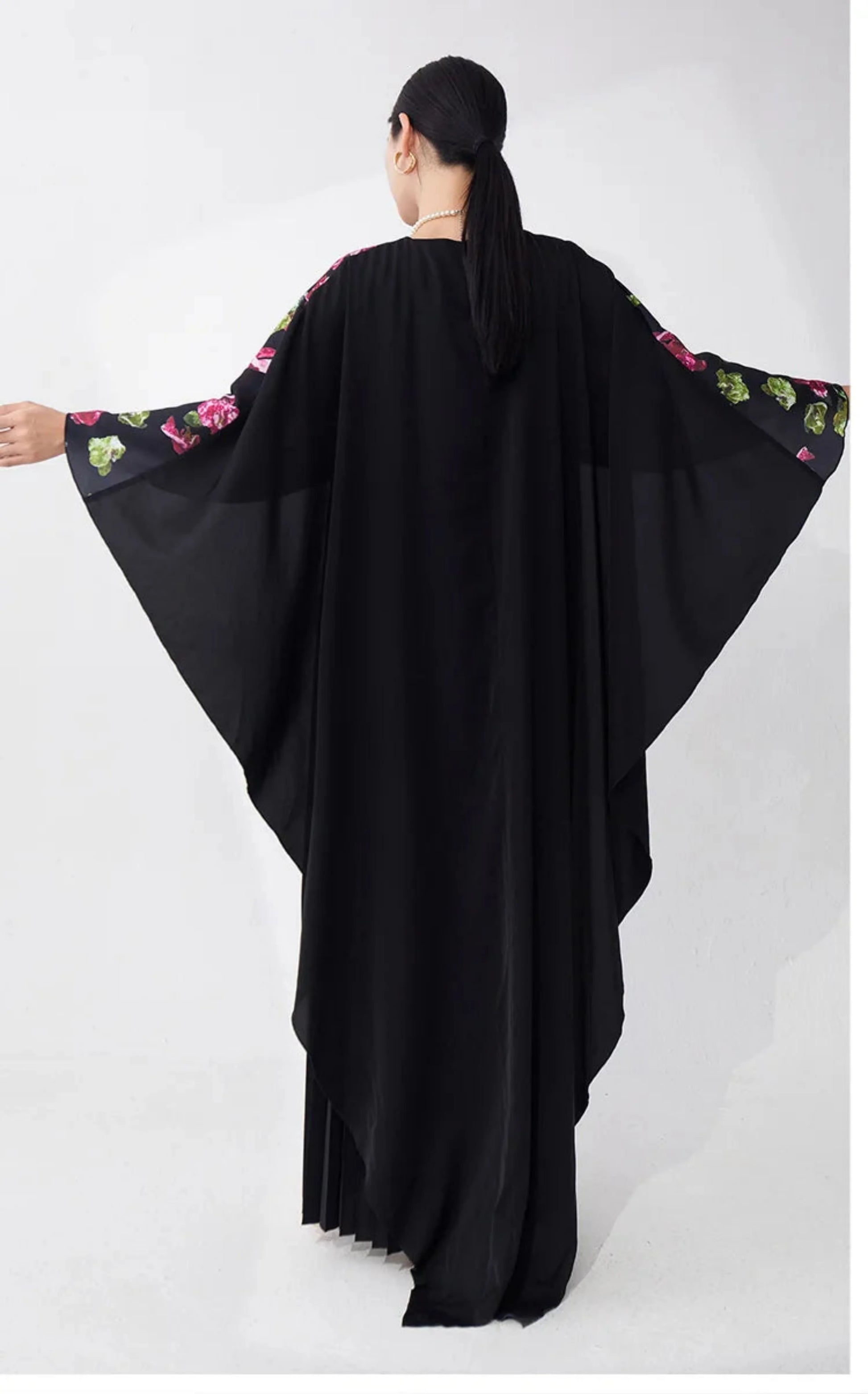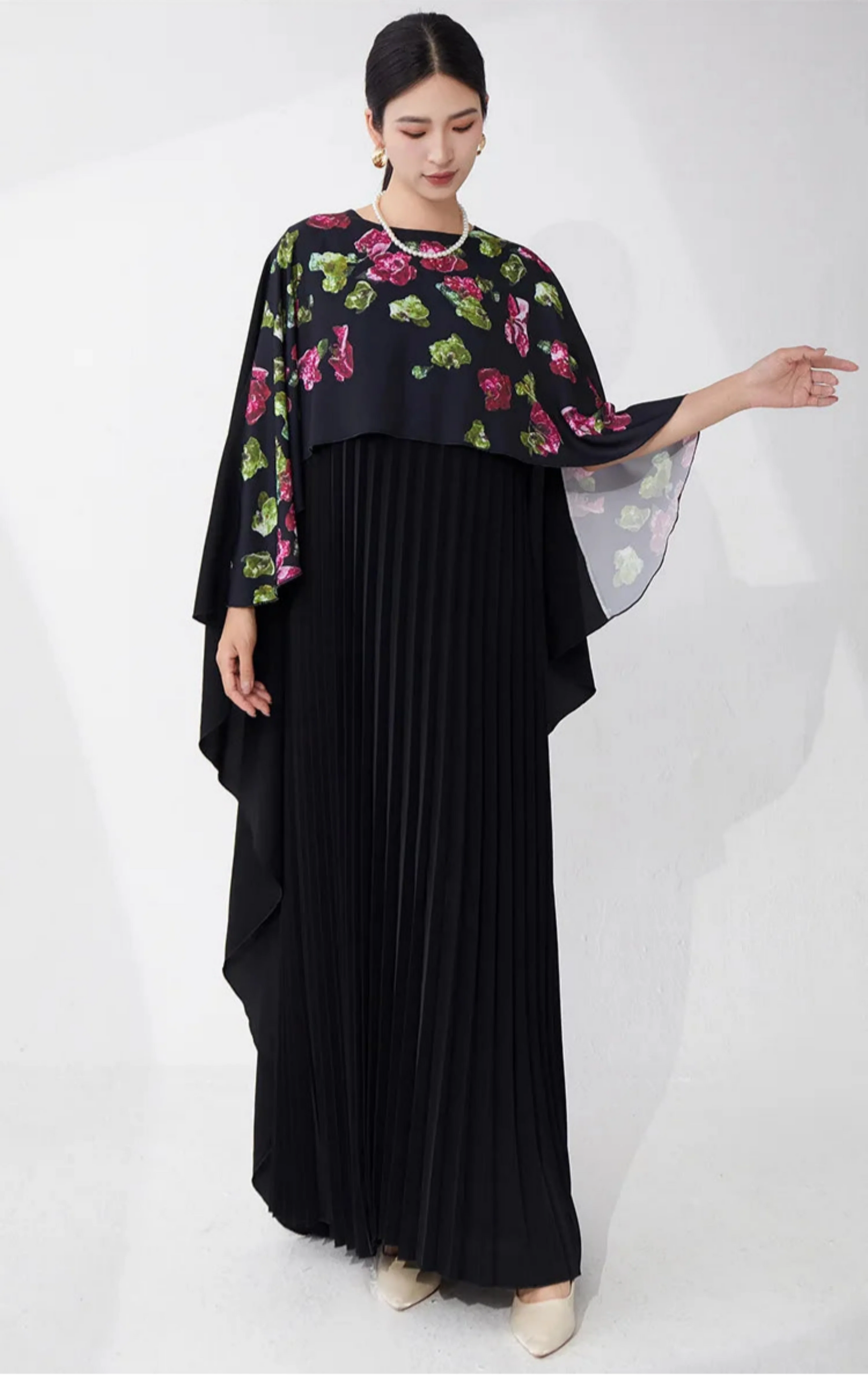 A mix of luxe and comfort, this piece features Japanese pleats and a floral cape detail. Stretchy fabric hugs your shape and adds elegant movement—made for those who want simple, stylish design.