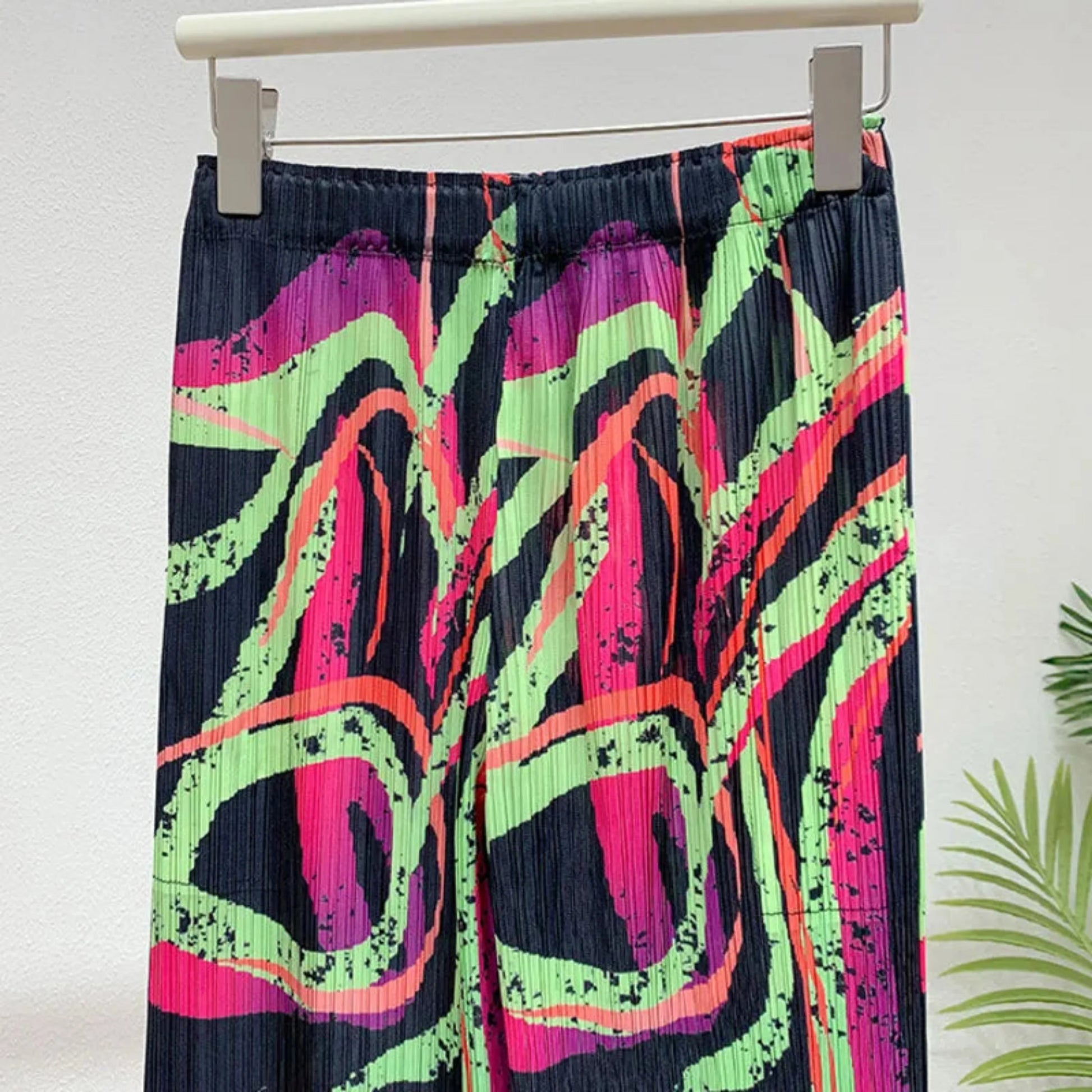 These statement trousers feature premium Japanese pleats in vibrant colors against a rich black base.