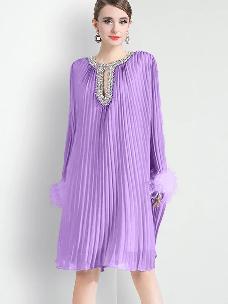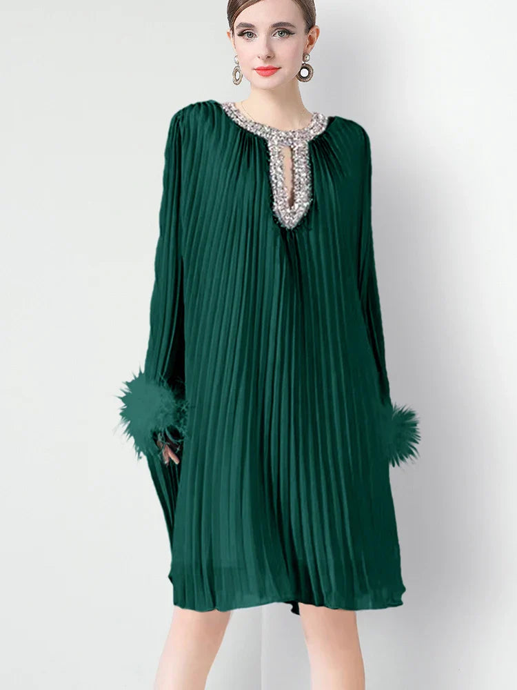 Shimmering crystals frame the neckline of this Japanese-pleated mini dress, complemented by dramatic faux-feather cuffs.