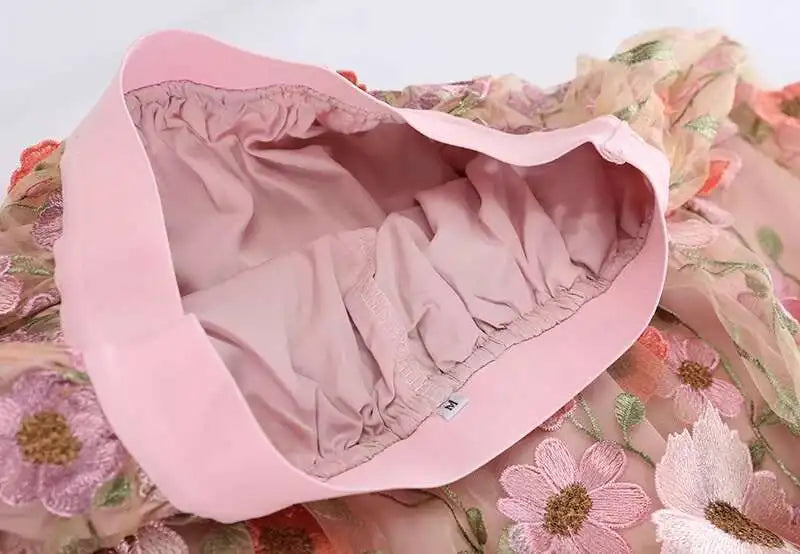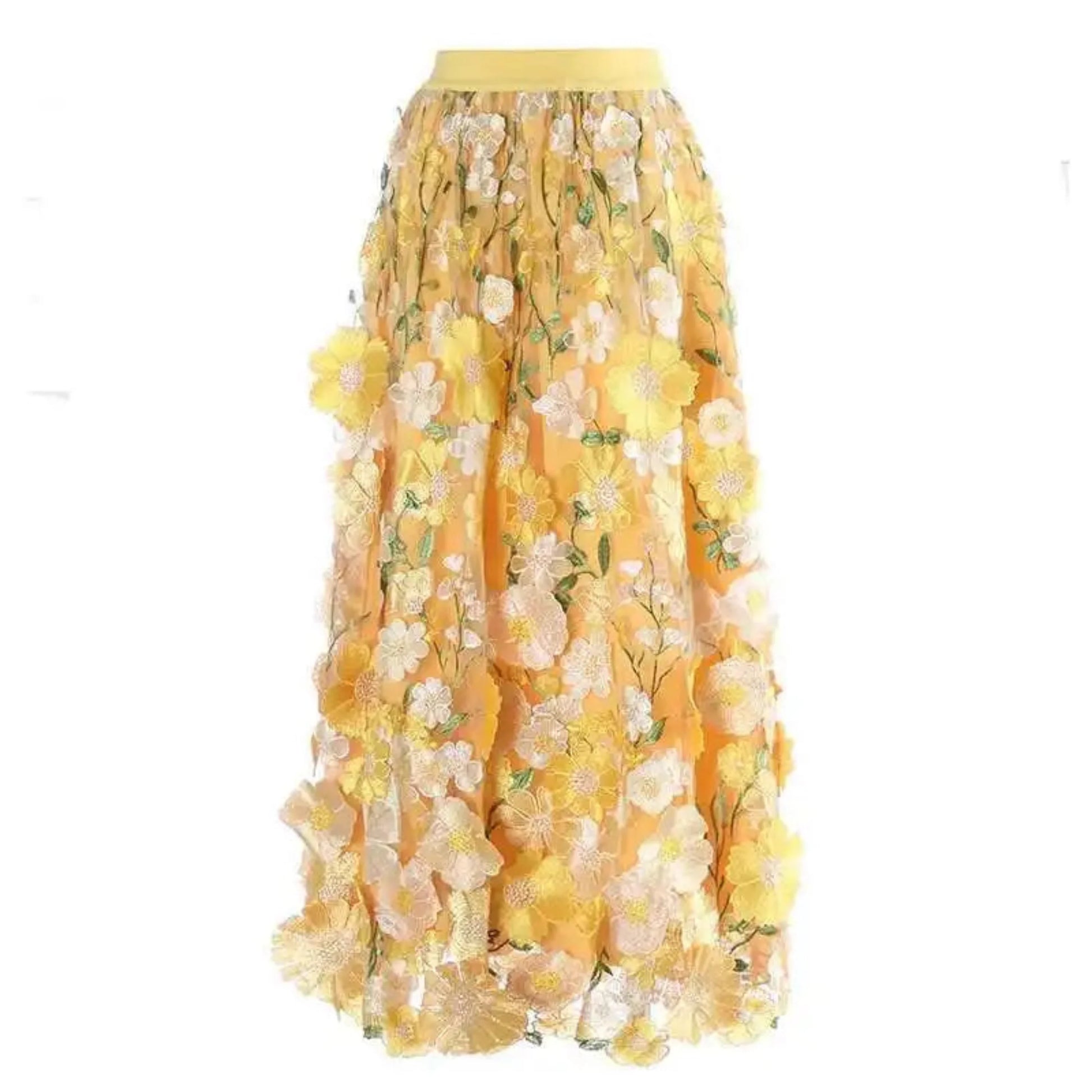 A luxurious pull-on midi skirt featuring hand-stitched 3D floral embroidery from waist to hem. With an elastic waistband and flowing silhouette, it's a standout piece made for graceful days and elegant evenings.